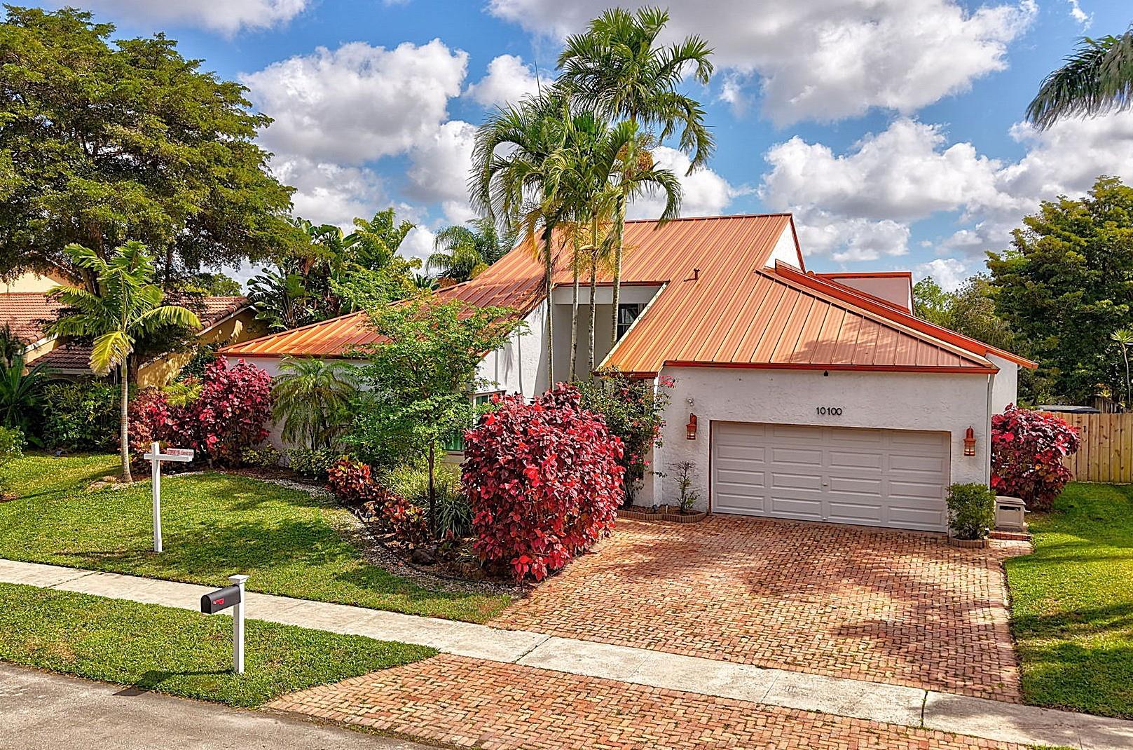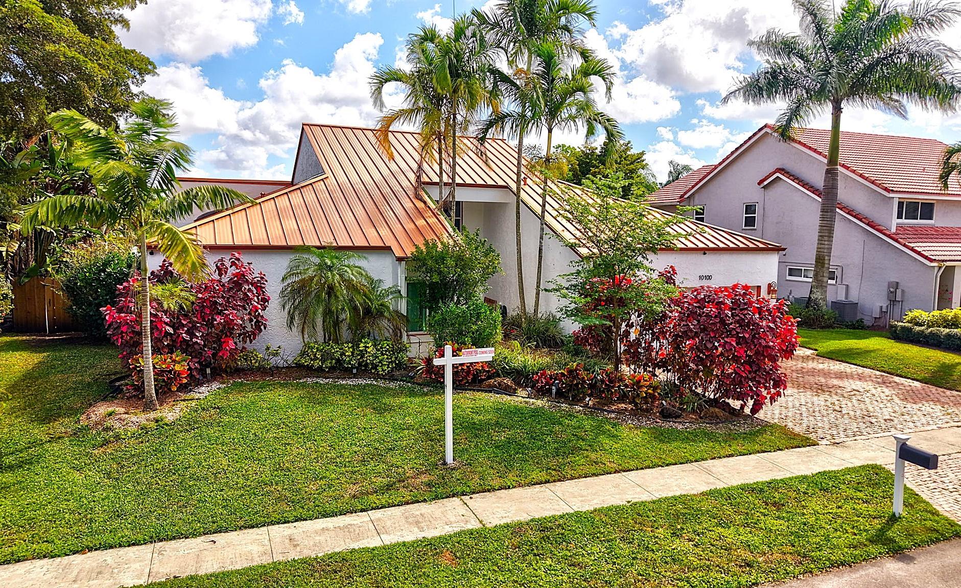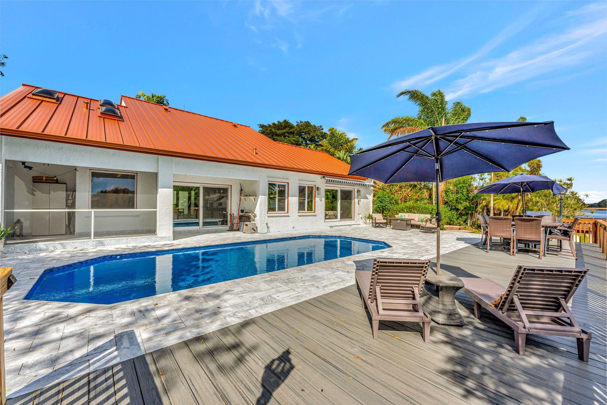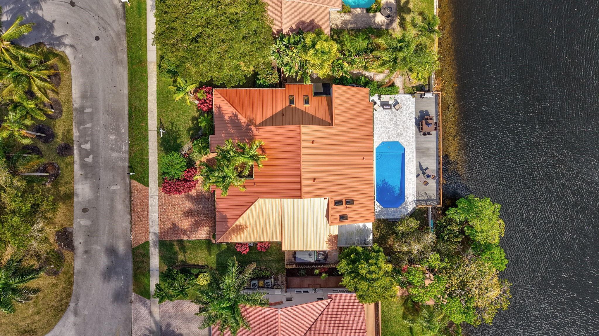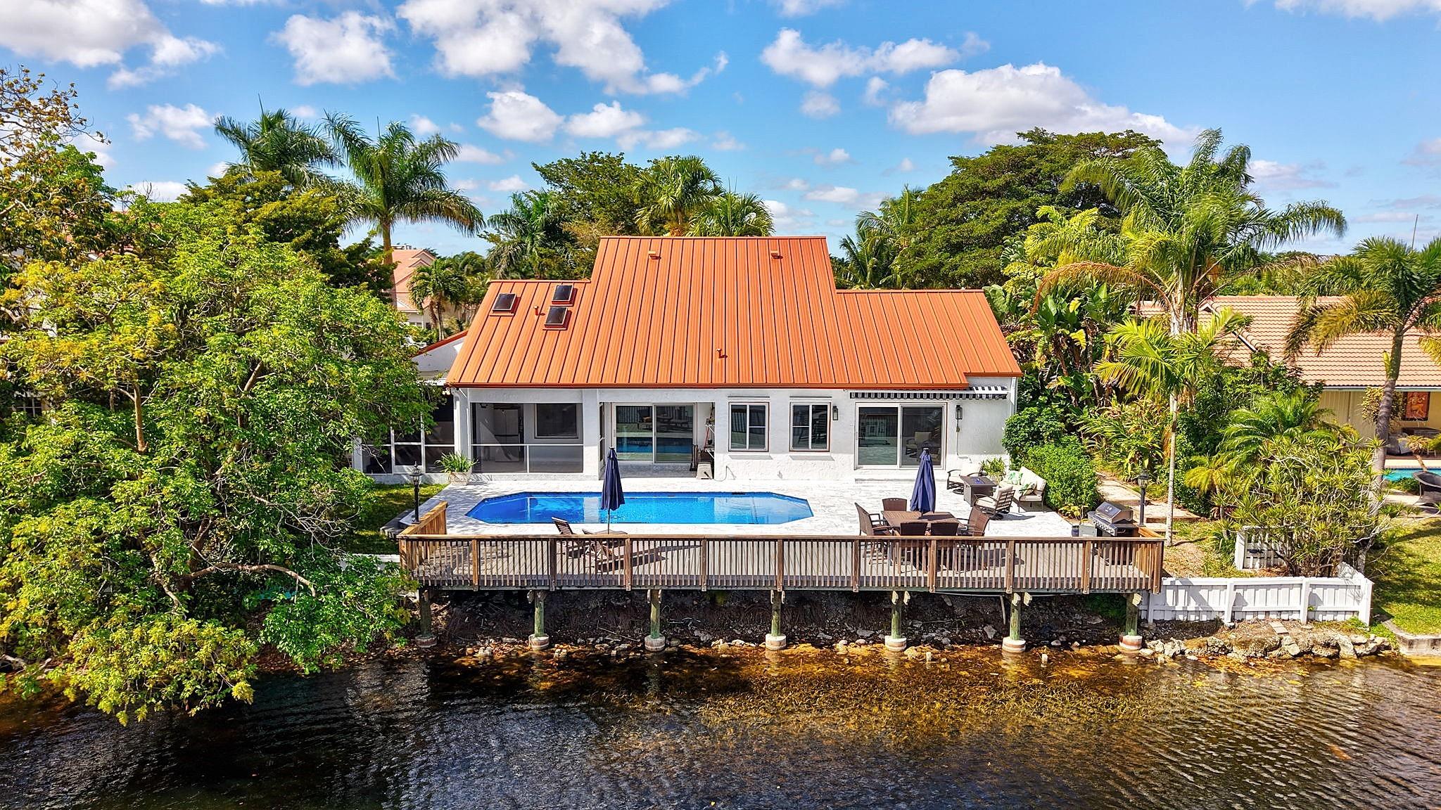 NEWLY PRICED Mediterranean-style home in Jacaranda Cay! Featuring a brand new metal roof, double pane high impact windows/doors/sliders, hard wood floors, beautiful heated pool, TREX deck overlooking beautiful views of the canal, outdoor marble pool pavers, skylights in kitchen and primary bath (all impact), new A/C, updated electrical panel, PVC sewer pipes, full house water filtration system, exterior recently painted, 2 car garage (also impact), and room for your boat/RV on side of the house (pavered). Everything done with permits! Come see this move in ready home and get ready for cul-de-sac living. Enjoy your lush landscaping, updated kitchen for entertaining, wet bar for all the parties you'll host, vaulted ceilings, and true outdoor living with built in BBQ and screened in lanai.