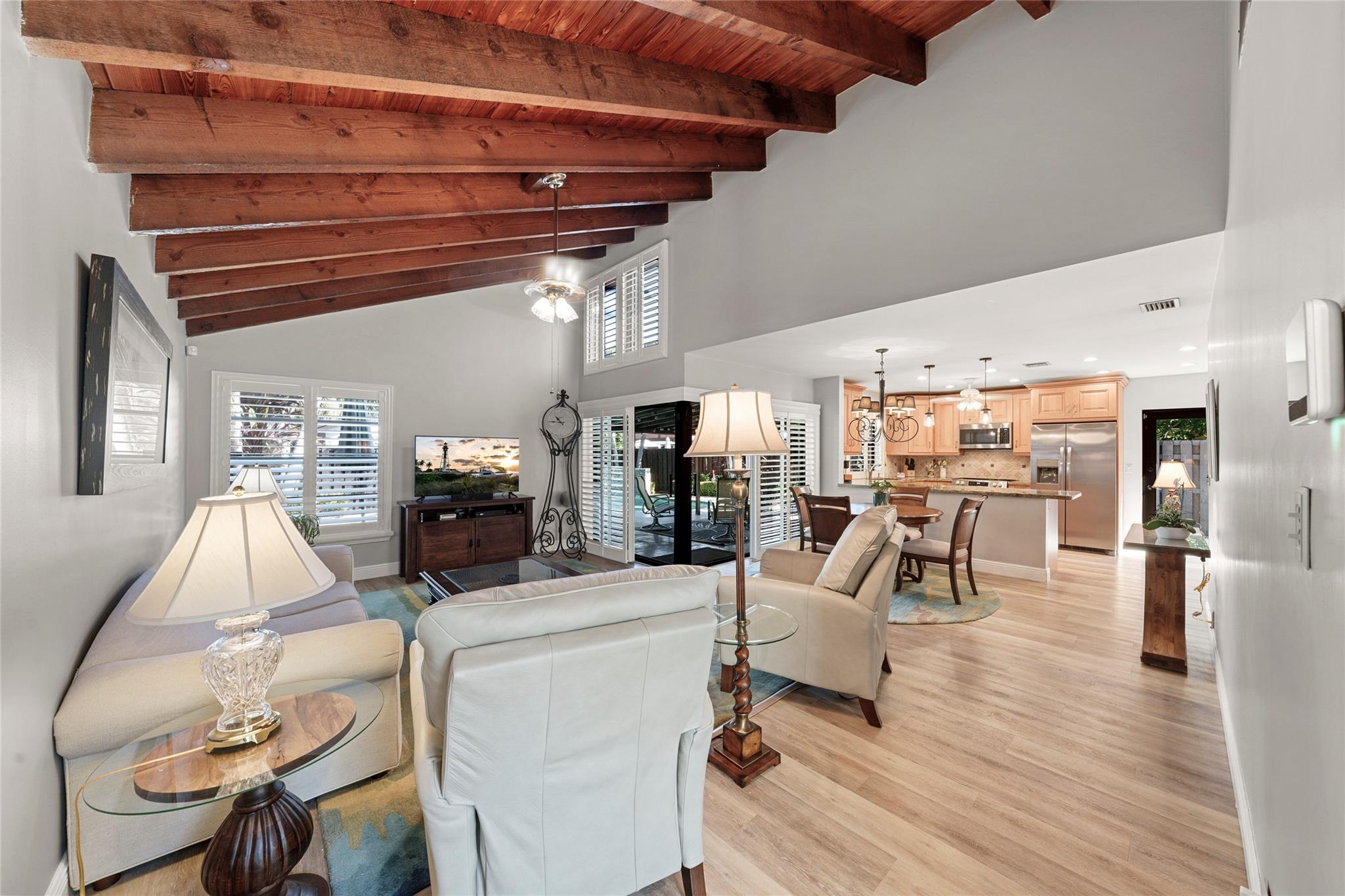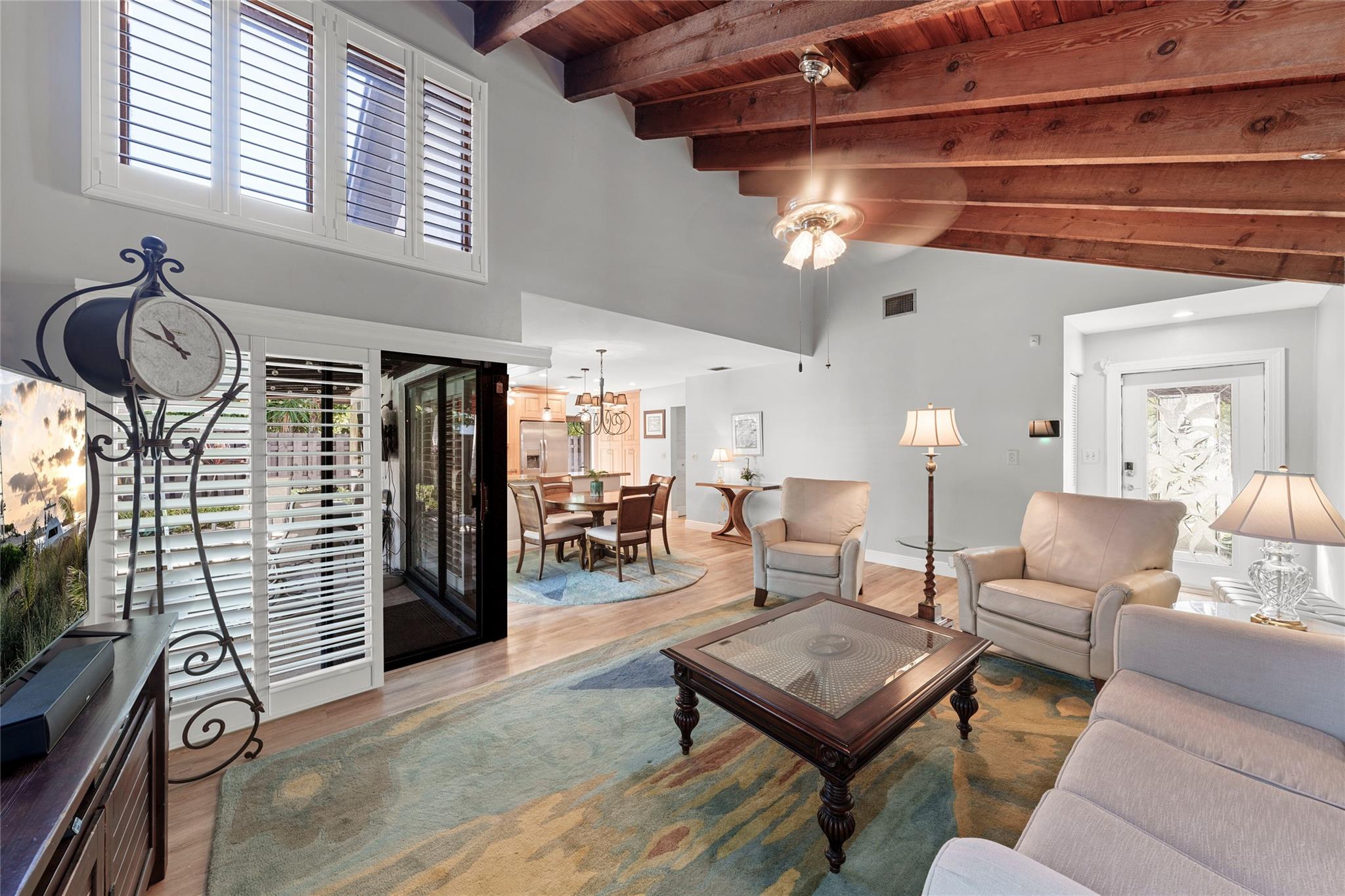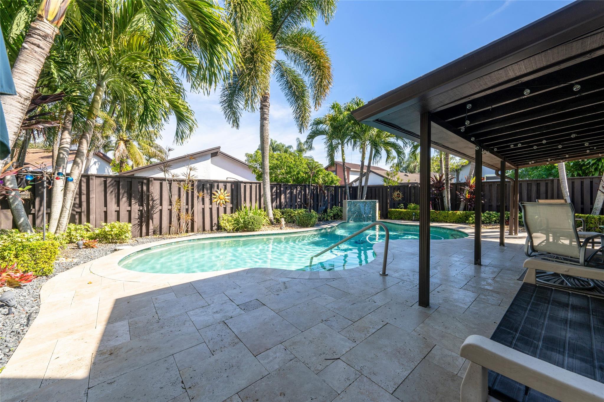 Perfectly situated in the heart of Pembroke Pines, this 2BR/2BA home has it all! Outstanding upgrades & features include: hurricane impact front doors & side door (hurricane panels for all other openings); beautifully updated kitchen with wood cabinets, granite countertops and newer stainless steel appliances (refrigerator & stove - 2024); newer a/c unit; luxury vinyl flooring in all living areas; renovated primary bathroom; plantation shutters; wood beam vaulted ceilings in living room; absolutely stunning, fully fenced backyard with lush landscaping, lighting and a NEW pool (heated & salt)! Meticulously maintained, this home is move in ready! Low HOA covers front landscaping, irrigation & common areas. A-rated schools! Pembroke Lakes golf/tennis/pool is next door and offers memberships.
