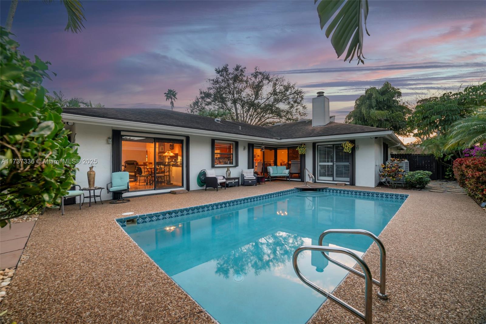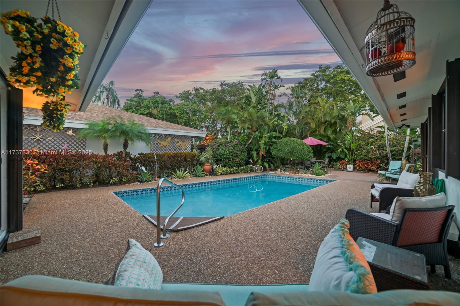 Charming Mediterranean-Style Home with Pool Views! Step into this 1,985 sq. ft. Mediterranean-style home, where timeless elegance meets modern comfort. The living room boasts a stunning pine-paneled cathedral ceiling with two well-placed skylights, allowing soft natural light to flood the space. An Italian white Carrara marble fireplace adds a touch of sophistication and warmth to this inviting area. This three-bedroom, two-and-a-half-bathroom home features an extra-large bedroom with a large sliding door that frames a picturesque view of the sparkling pool and swaying palm trees. Three additional sliding glass doors throughout the home provide seamless access to the outdoor oasis, showcasing lush landscaping and serene views from multiple angles.