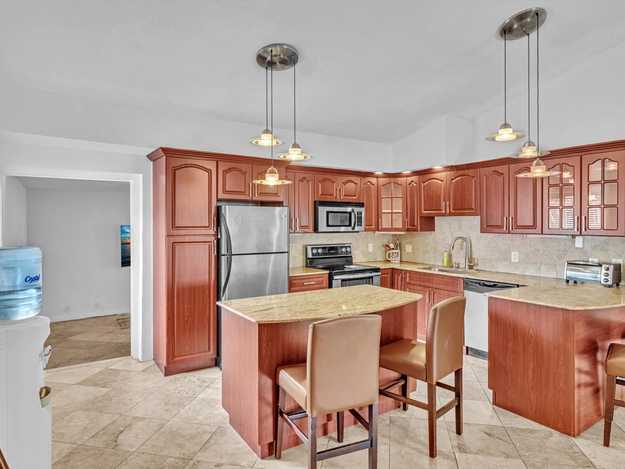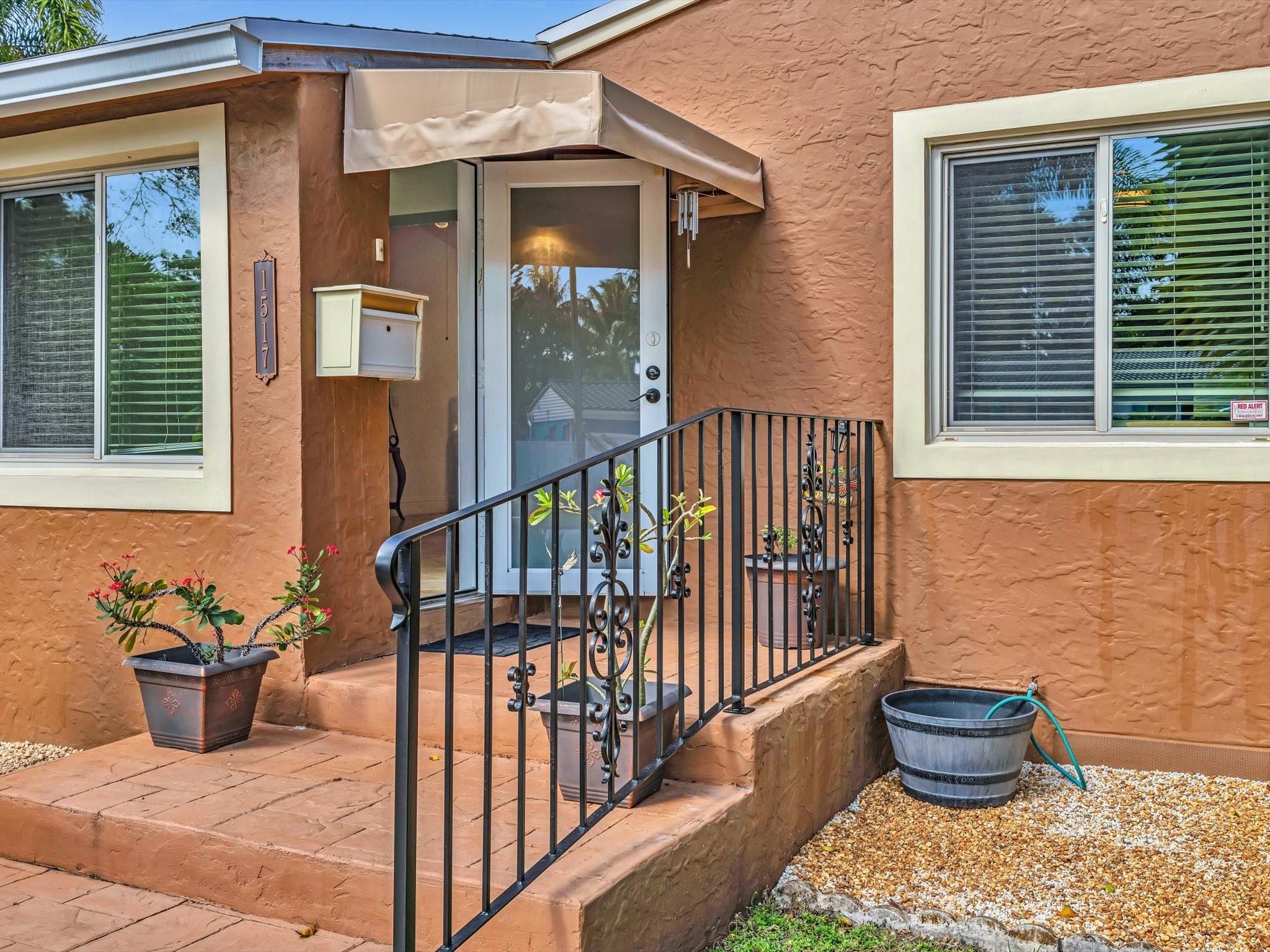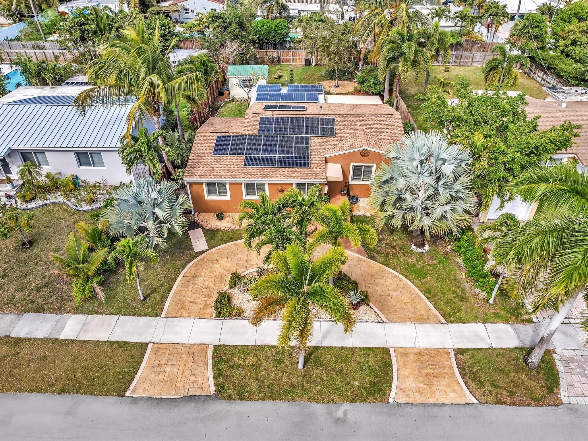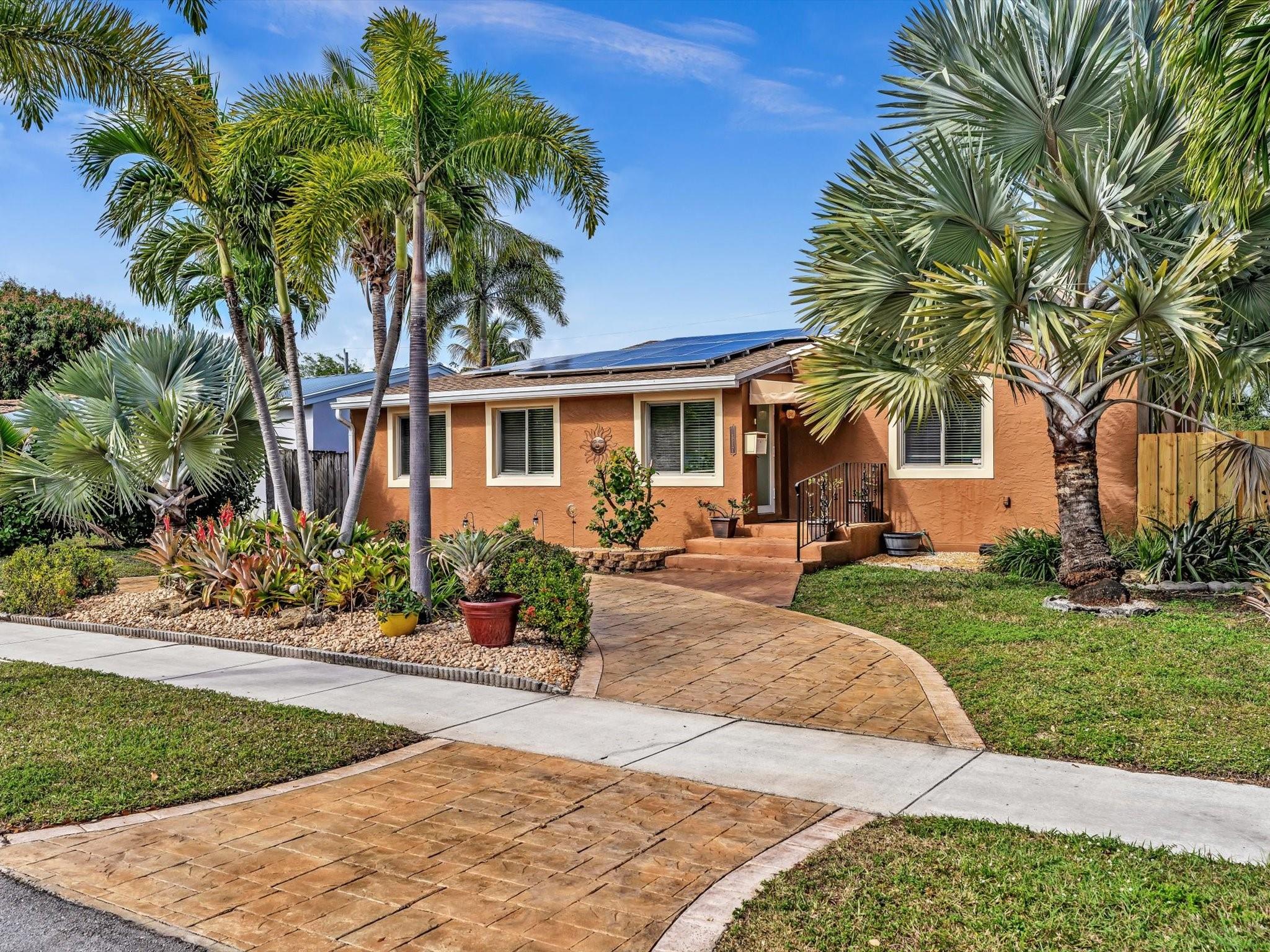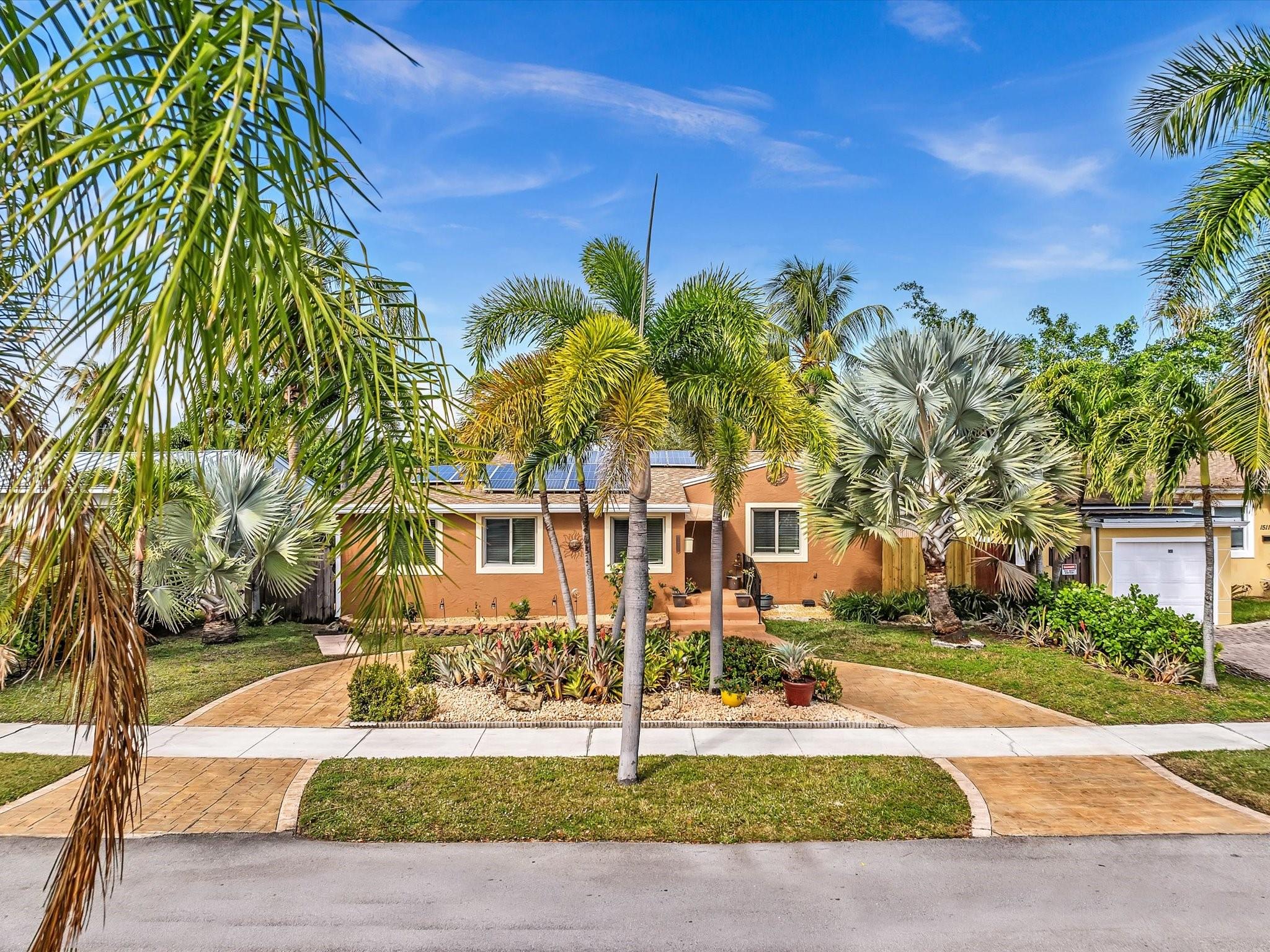 Just 2 miles from the beach, this meticulously maintained 3 bed/2 bath home offers amazing curb appeal in Hollywood East! Featuring a brand-new tiled roof, solar panels, hurricane windows & doors, & freshly painted exterior/2020 & interior/2022, blending style & sustainability. Bedroom en suite includes washer/dryer! Upgraded kitchen has two large islands/stainless steel appliances/granite countertops & provides ample prep space. The family room is flexible for use as an office/den/guest room/home theater. Enjoy travertine tiles, an encapsulated crawl space with dehumidifier, & new A/C with UV protection. With a rewilded fully landscaped yard, fencing for privacy & security, room for a pool, covered patio, & outdoor bolted shed, this home has been meticulously maintained, & is a must see!