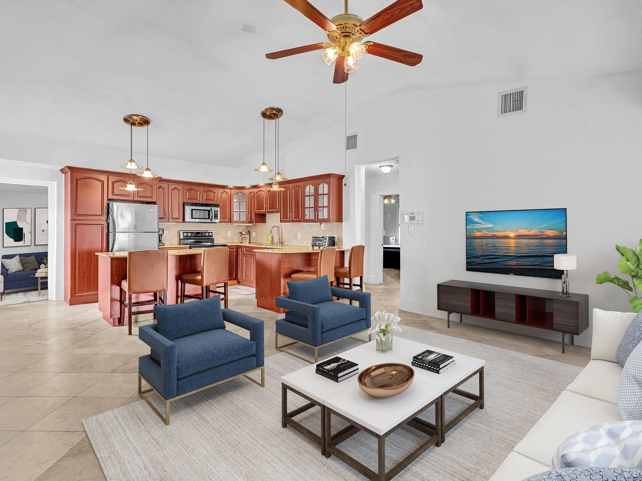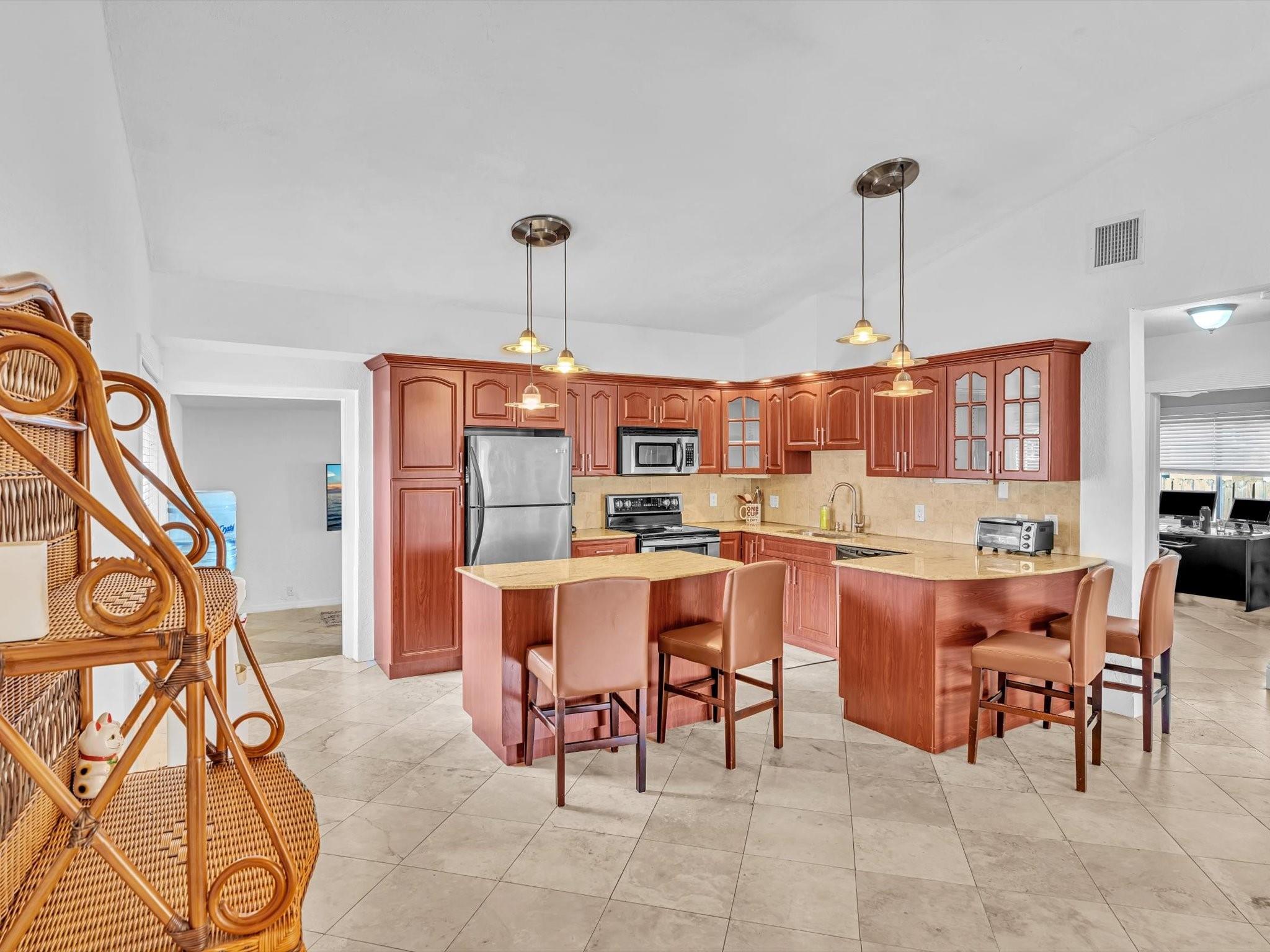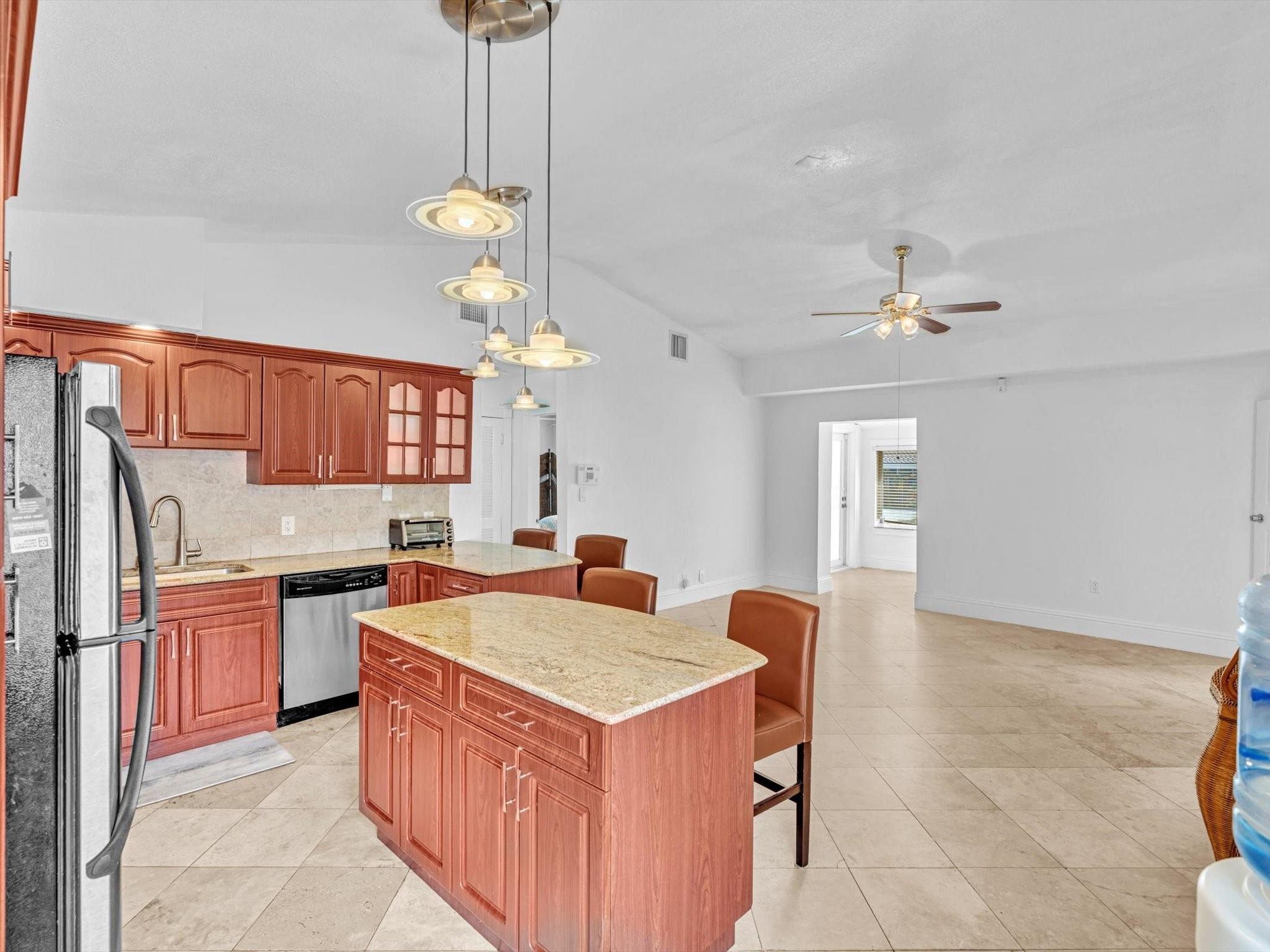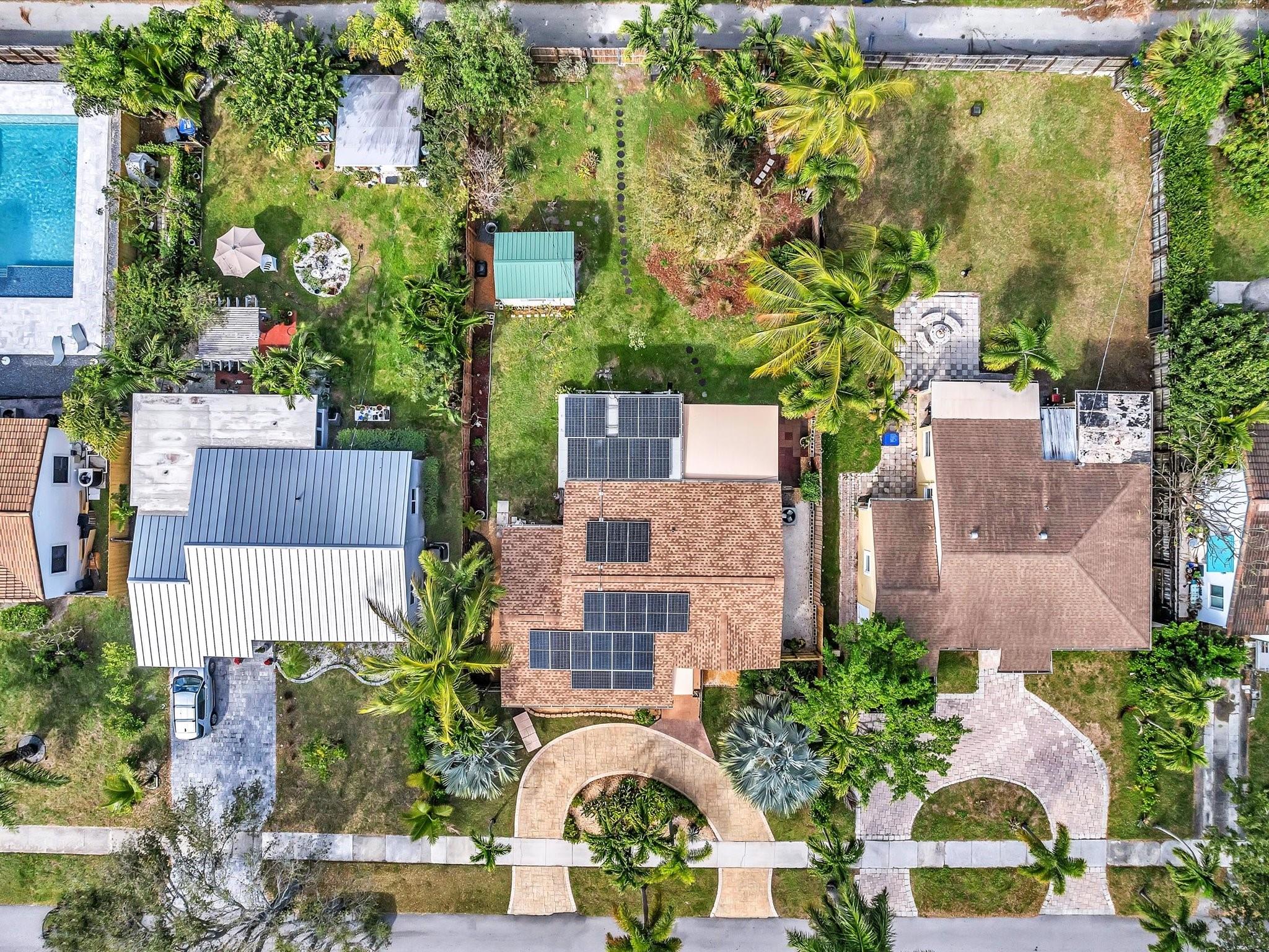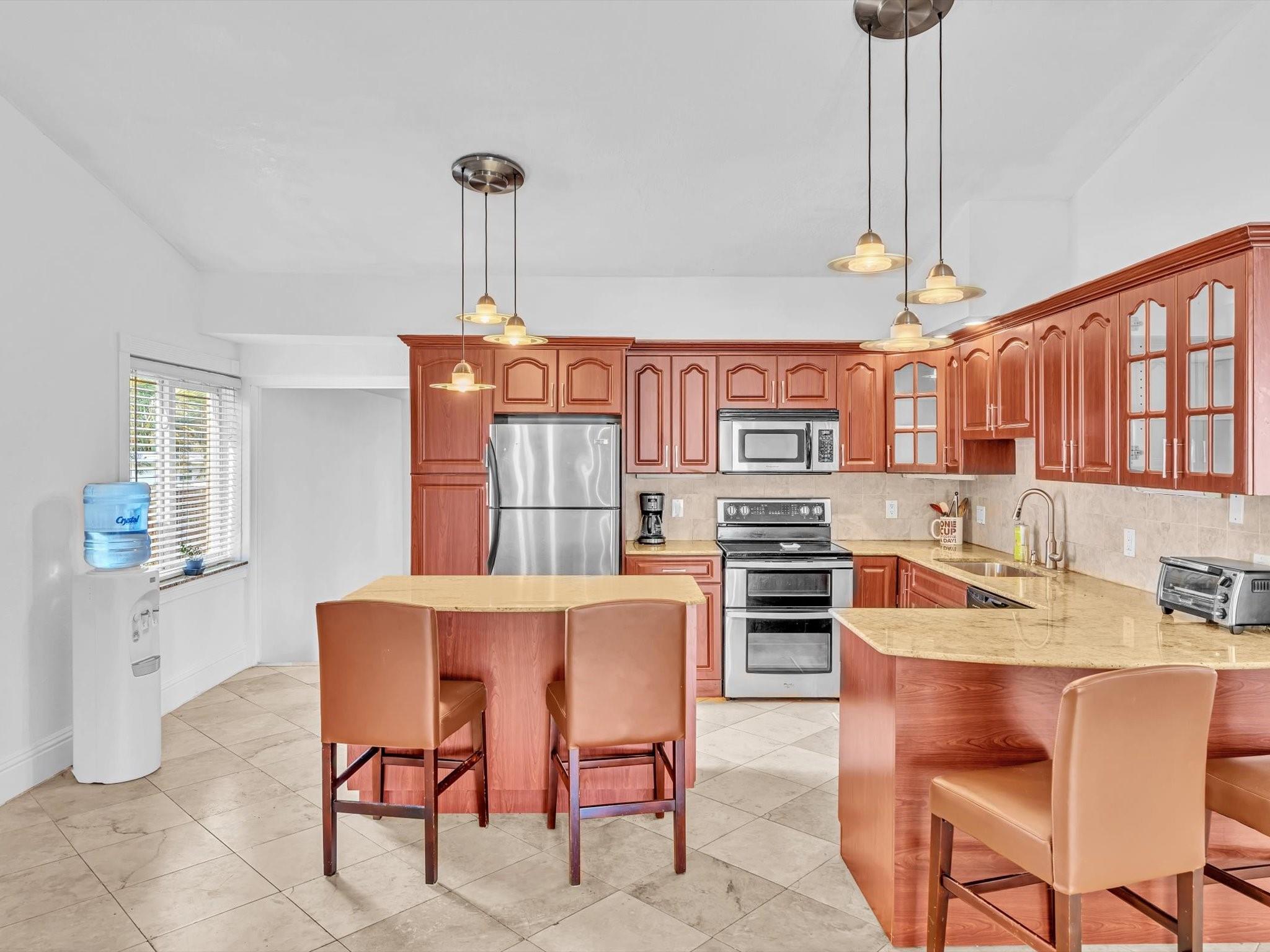 Just 2 miles from the beach, this meticulously maintained 3 bed/2 bath home offers amazing curb appeal in Hollywood East! Featuring a brand-new tiled roof, solar panels, hurricane windows & doors, & freshly painted exterior/2020 & interior/2022, blending style & sustainability. Bedroom en suite includes washer/dryer! Upgraded kitchen has two large islands/stainless steel appliances/granite countertops & provides ample prep space. The family room is flexible for use as an office/den/guest room/home theater. Enjoy travertine tiles, an encapsulated crawl space with dehumidifier, & new A/C with UV protection. With a rewilded fully landscaped yard, fencing for privacy & security, room for a pool, covered patio, & outdoor bolted shed, this home has been meticulously maintained, & is a must see!