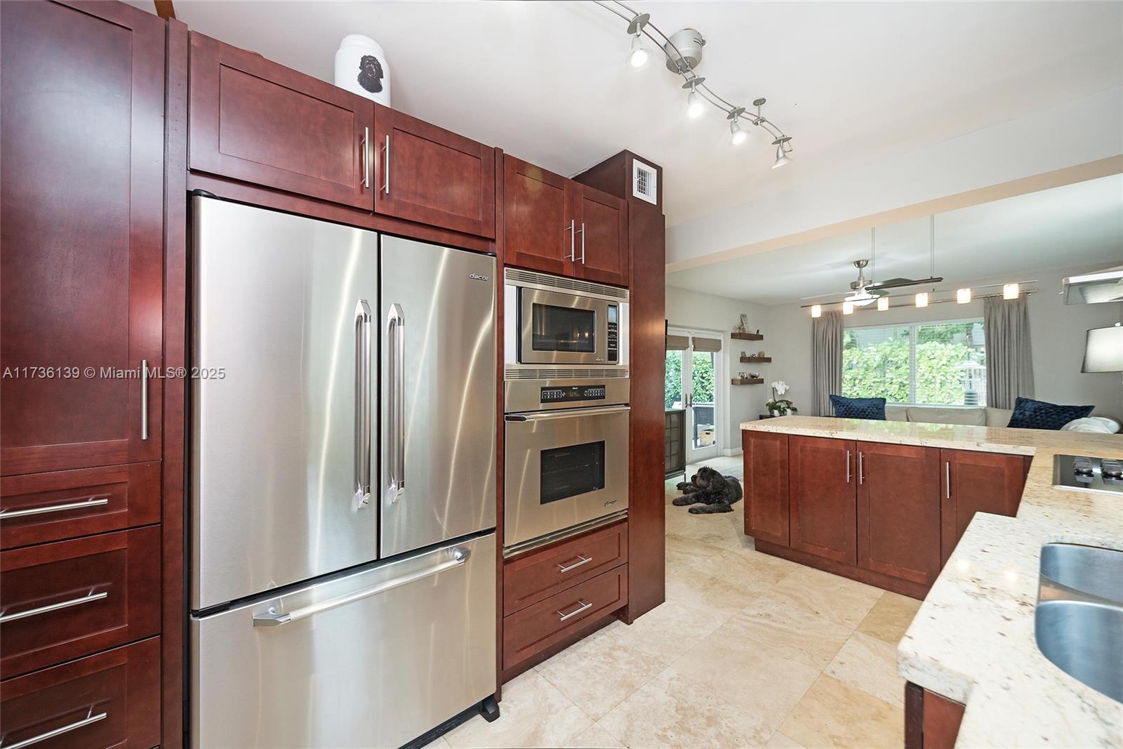 Discover elegance and modern comfort in this stunning 4-bedrooms, 3.5-bathroom home. Thoughtfully designed and impeccably maintained, it offers a seamless living experience. Wood-like flooring and exquisite Travertine on the main level enhance its sophistication. The chef's kitchen, flowing into the family room, features a spacious pantry, energy-efficient appliances, and solid wood cabinetry, ideal for dining and entertaining. For luxury and peace of mind, the home includes hurricane-impact windows and doors, a two-car garage, a storage room, and an eco-friendly mosquito repellent system. Nestled in prestigious Coral Gables, this move-in-ready gem offers effortless, upscale living.