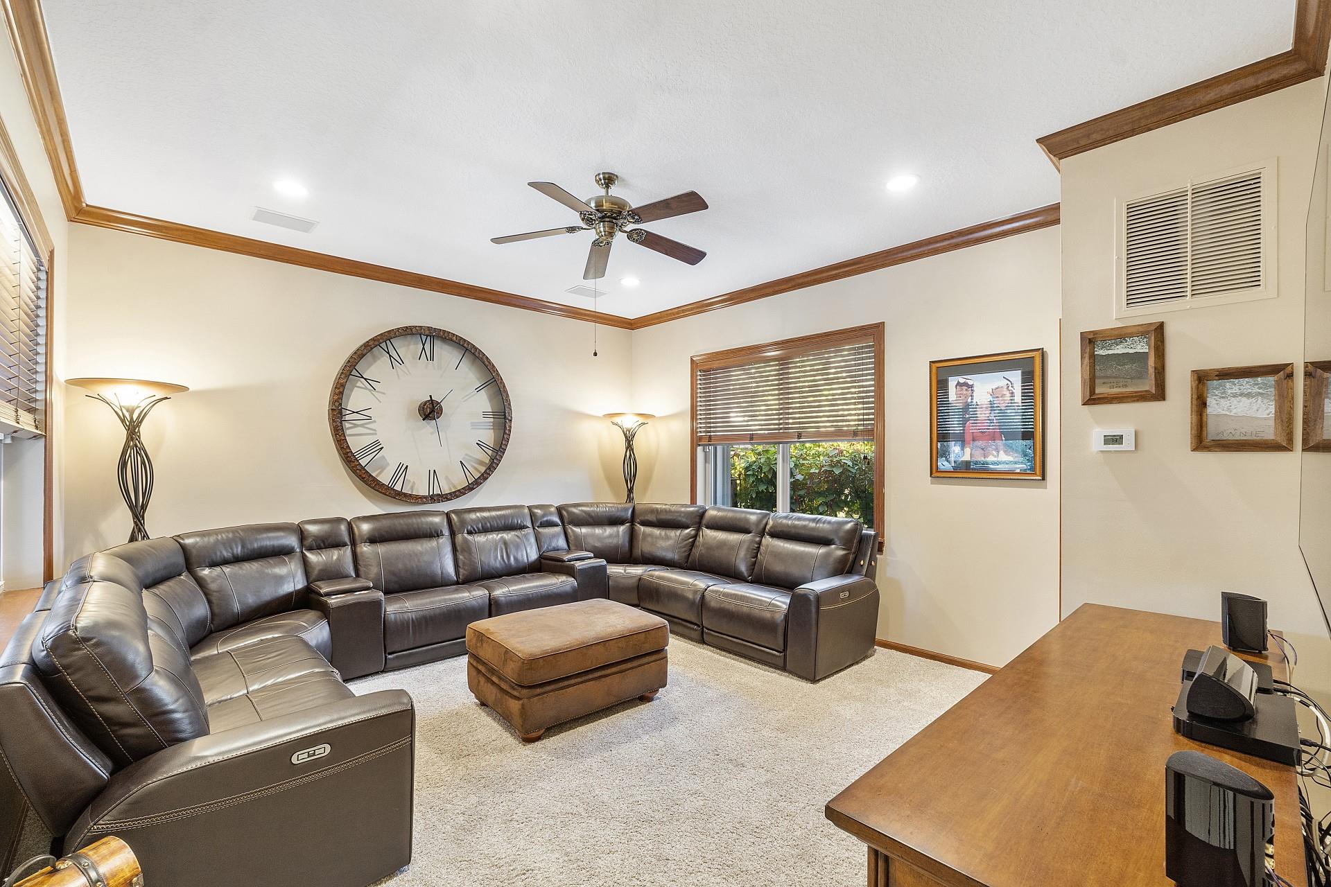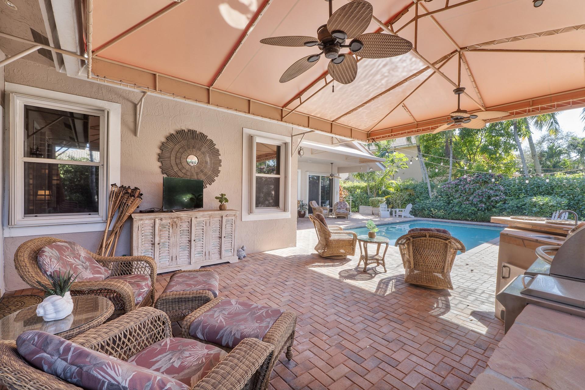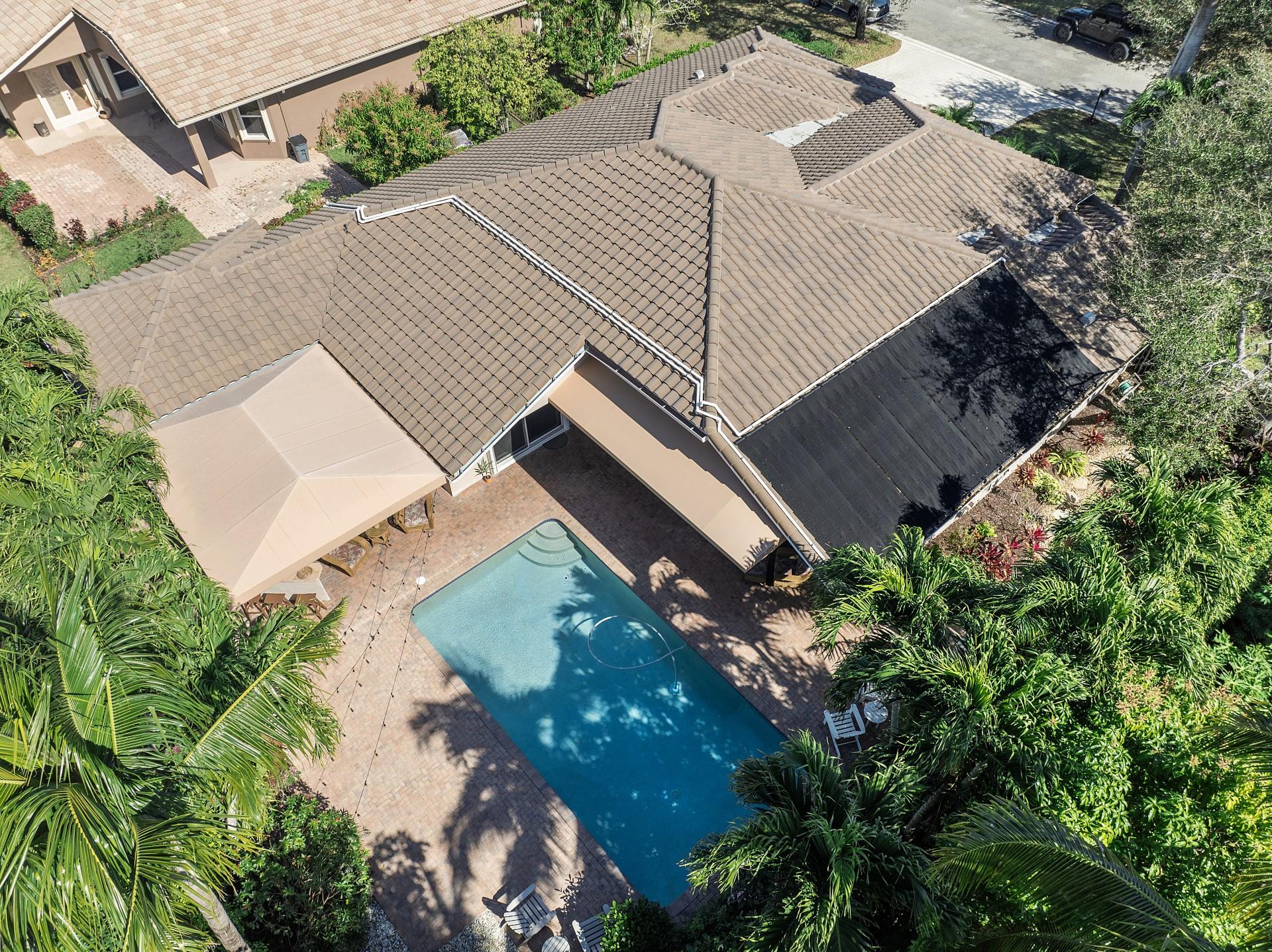 GORGEOUS Indoors & Outdoors-WELCOMING! This 5/3 home, on Quiet Cul-De-Sac - SURROUNDED by PRIVATE Lush LANDSCAPE w/Lighting/Pathways/ Fenced/Fully covered, Custom Outdoor Kitchen/Bar Seats/Cafe Lights/ Multiple Lounge spaces. Indoor Vaulted Ceilings/Plantation Shutters; Open Concept Granite Kitchen/Den/Breakfast Nook = Relaxed Entertainment! Indoor Built-In Features: Multi-Custom Solid Wood Display/Storage; Office-Library w/Multi Screen space. 6th ROOM ADDITION-Den/Movie/Surround Sound w/ 20ft. U-Shaped, Leather Reclining Sect.; Master Bed.-Dual Closet/ Spacious Dual Master Bath/Water Closet. ADDED VALUE: 3 Car Garage/Gym Mirrors/Mini-Split; Salt Pool/Solar Heat/Tot Fence; Accord. Shutters/Port. Gen./Home Sec. & Cameras; Sonos Sound Sys.; Roof(2017); Main A/C(2023); Water Heater(2024).