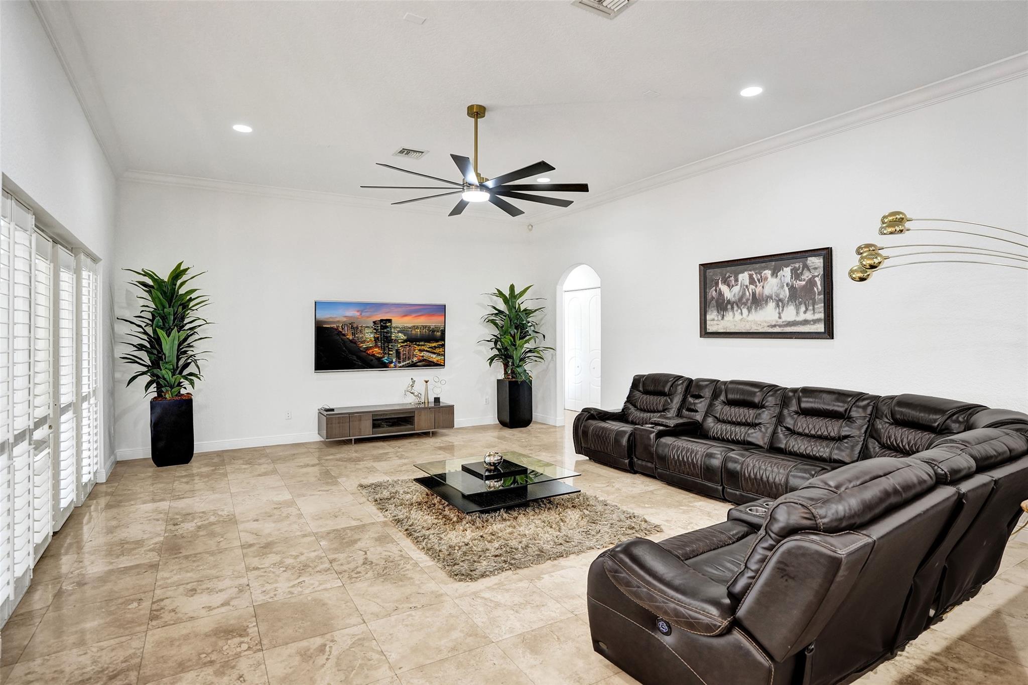 Welcome to this stunning 5-bedroom + office, 6,000+ sq. ft. estate in the prestigious Plantation Acres community. Designed for those who appreciate luxury and space, this home boasts soaring volume ceilings and elegant marble flooring, creating an ambiance of grandeur. The expansive master suite features a private sitting room, offering the perfect retreat for relaxation. The living and dining areas flow seamlessly outside to your private outdoor oasis, where a huge covered patio and summer kitchen set the stage for unforgettable gatherings. Lounge by the sparkling pool or enjoy the expansive private backyard. Experience the best of Plantation Acres living. Don’t miss this rare opportunity to own a home of this caliber!