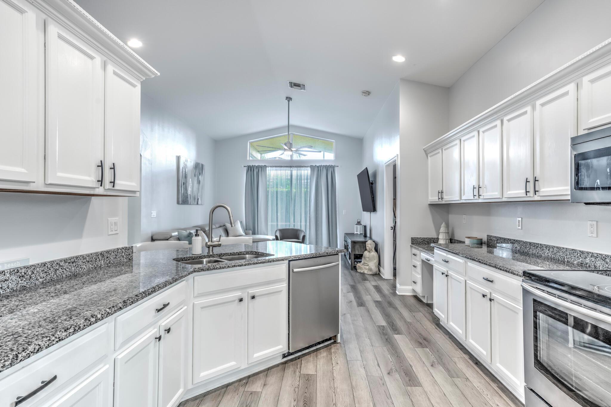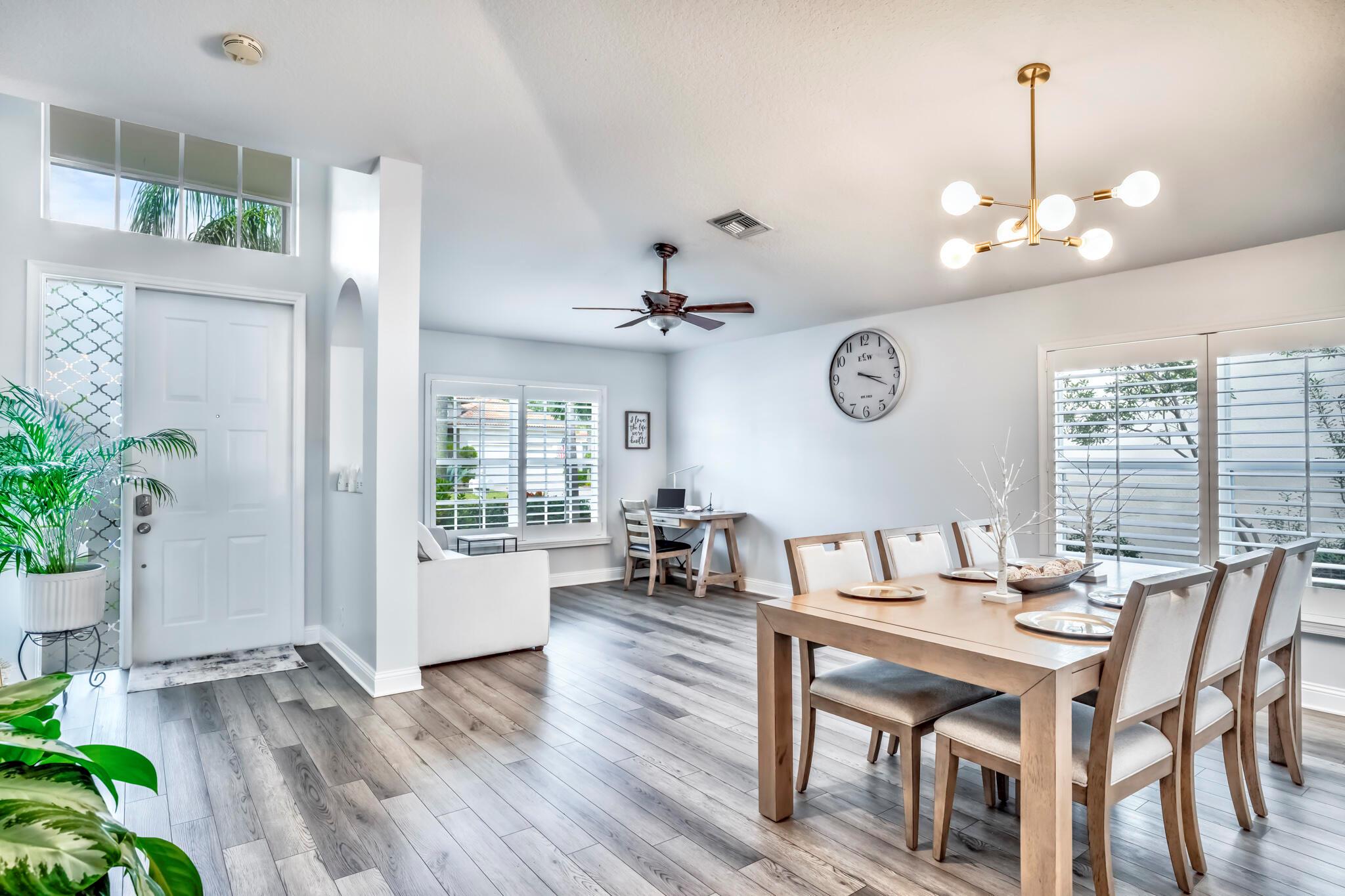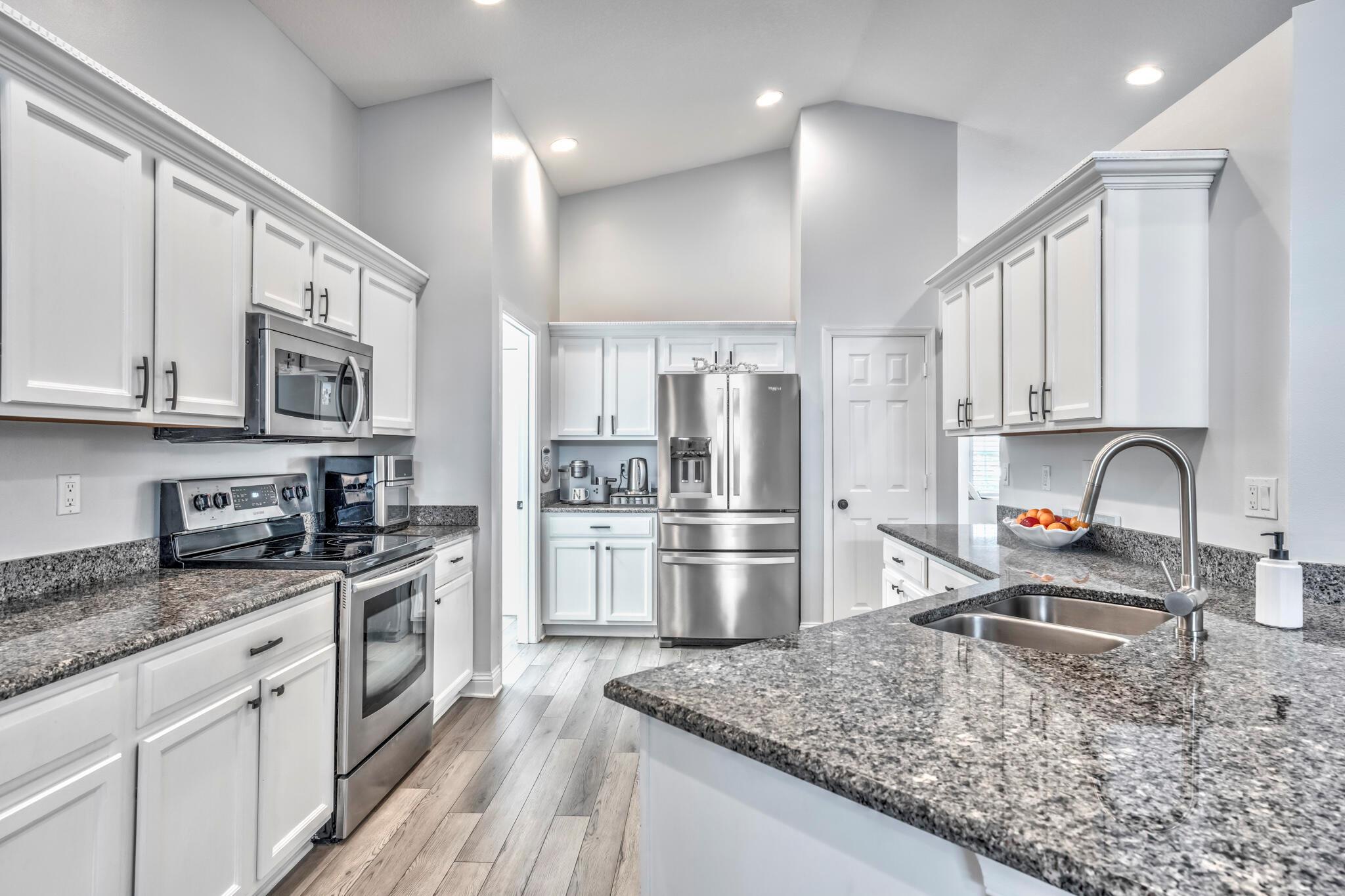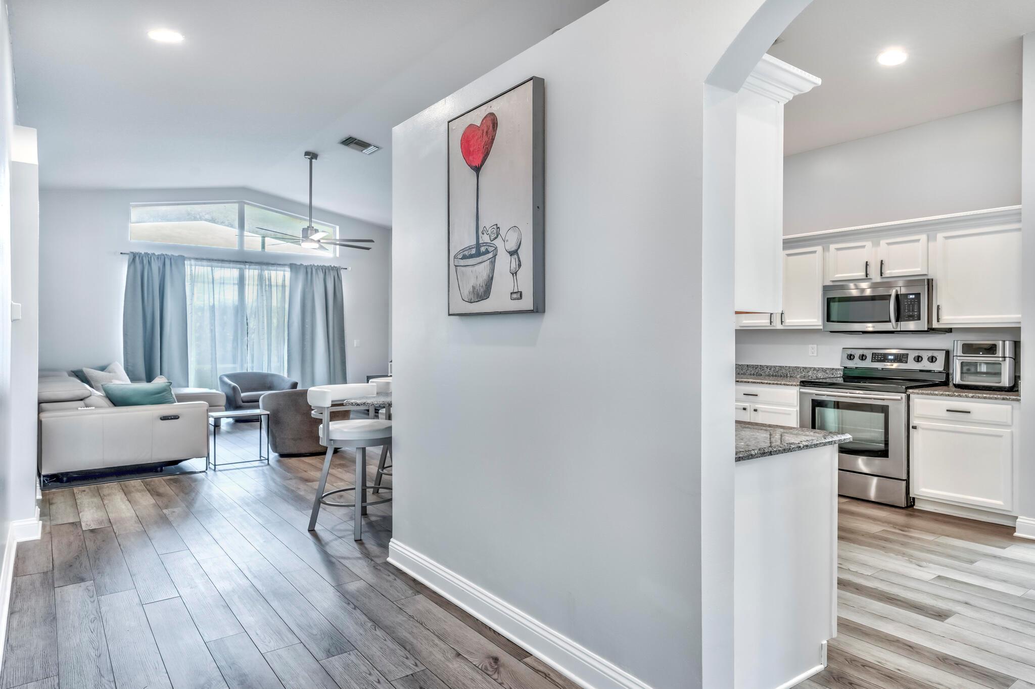 This stunning property has been pre-appraised at $515,000, offering tremendous value for buyers. The entire house freshly painted, additionally, the home boasts luxury vinyl flooring throughout, creating a seamless flow from room to room. The extra wide baseboards add touch of elegance, open kitchen/family room concept, new upgraded ceiling fans, and hi hat lighting throughout the house. The entry foyer, kitchen and family room feature 11-12 foot cathedral/vaulted ceilings with plantation shutters in the family/dining and master bath. The heart of this house is the stunning kitchen highlighted with upgraded solid wood white cabinetry, granite counter tops, large pantry, office station, newer Samsung stainless steel appliances.