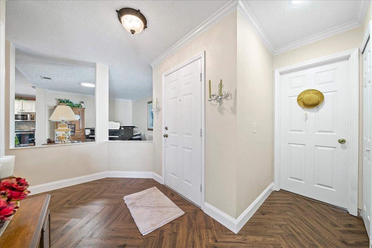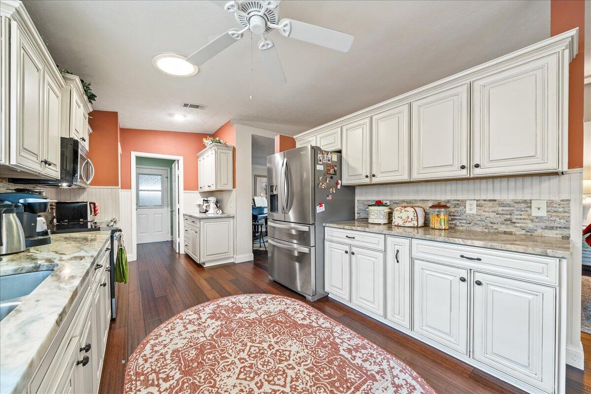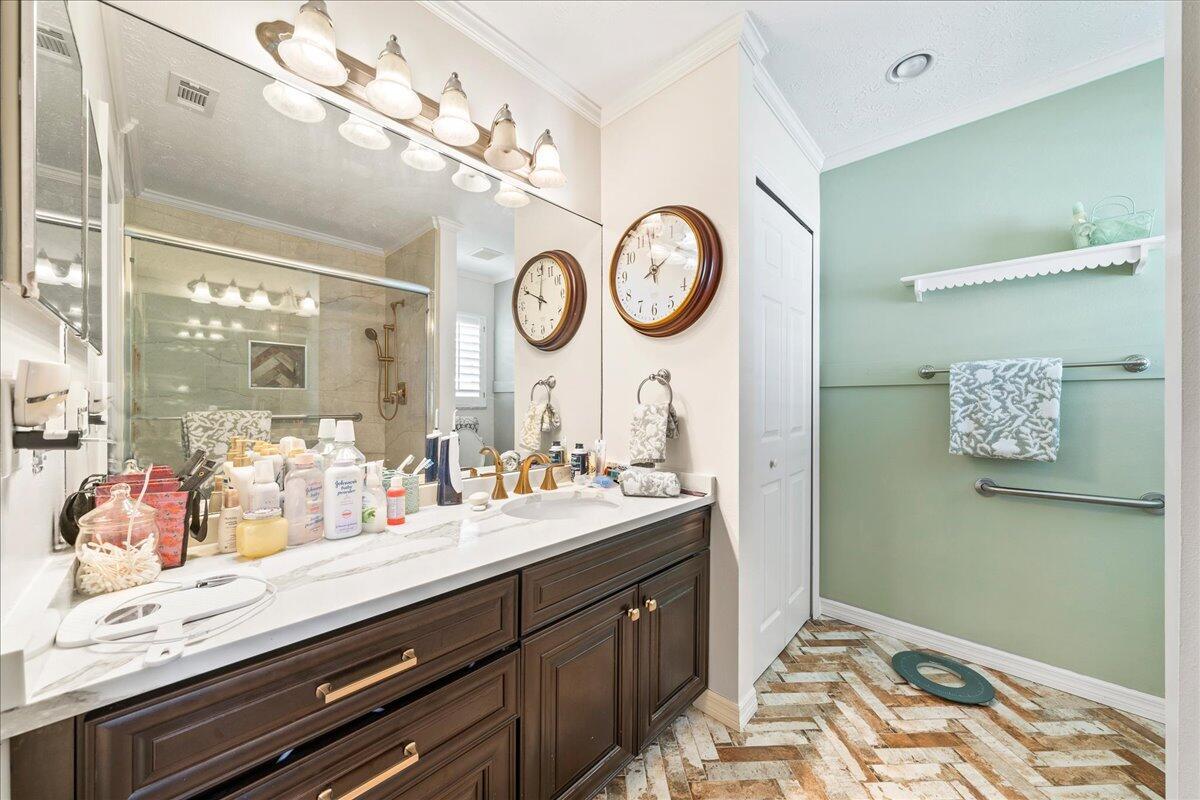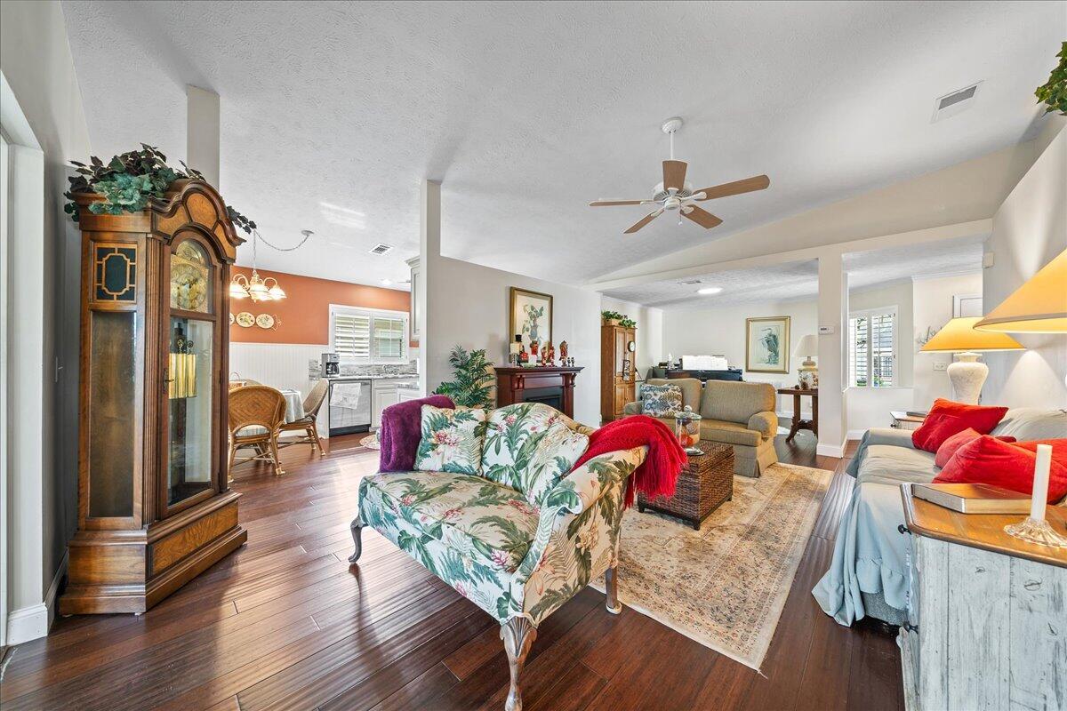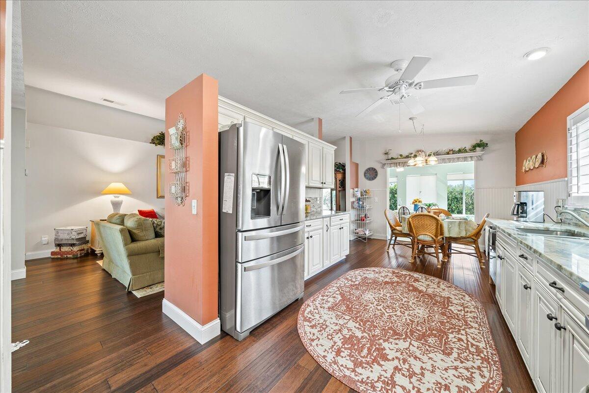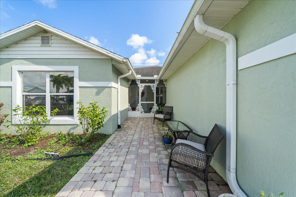Morning coffee or evening cocktails on the enclosed lanai in this beautiful home in a 55+community. Entertain friends and family with meals that are a joy in the beautiful updated Kitchen with stunning cabinetry, stainless appliances and Granite countertops. Fabulous plank flooring. Both full baths are completely updated. Play golf, swim and tons of other activities available without leaving the community. Minutes from shopping, restaurants and all the amazing opportunities in the area. Situated between Vero Beach and Fort Pierce. NEW OWNERS LAND LEASE ESTIMATED AT $589