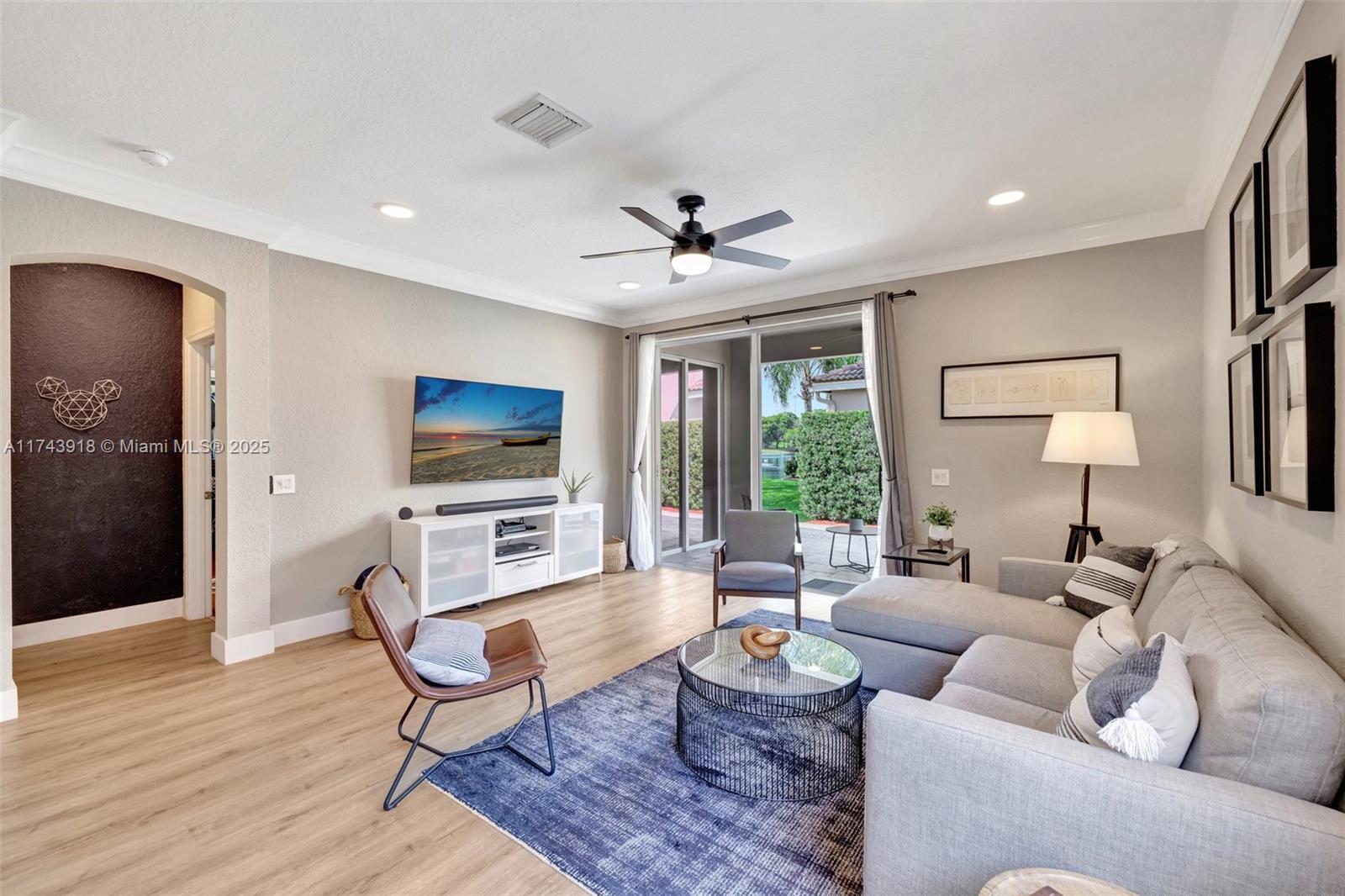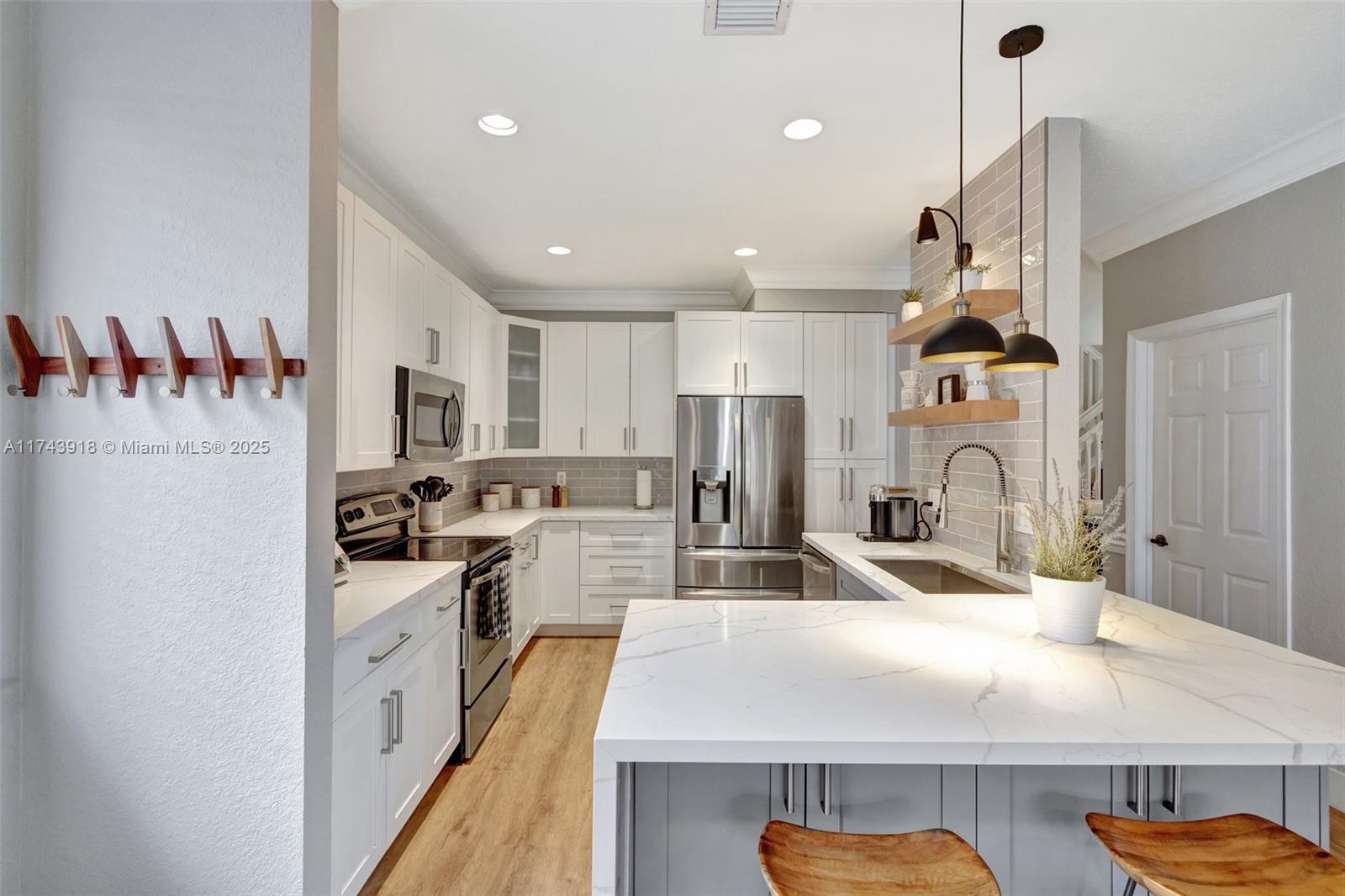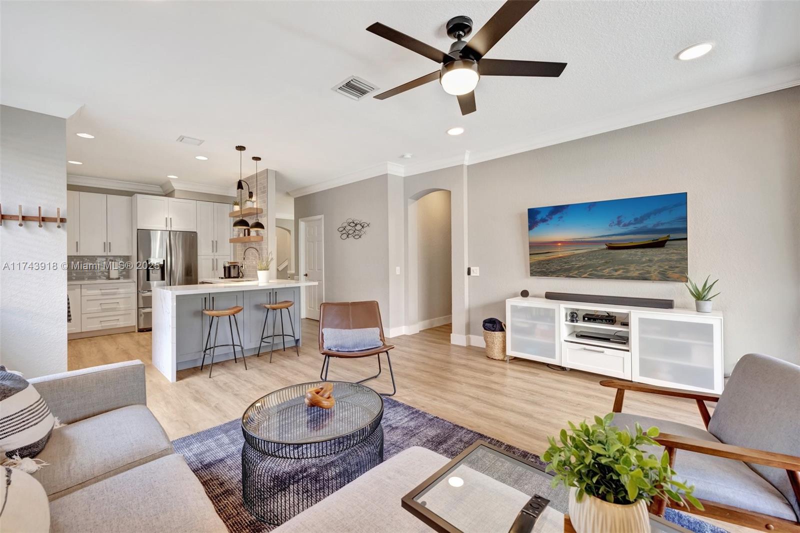 This pristine residence showcases the sought-after Windmill Elite floorplan, featuring upgrades that make this property truly exceptional. High ceilings & elegant foyer welcome you home, leading into the formal living area. Beautifully renovated kitchen meets the highest standards of modern style & functionality. Quartz counters, waterfall edge, two-tone cabinetry in crisp white & sophisticated grey, pullouts, new LG fridge, storage beneath island. Primary suite on 1st floor. Half-bath & 2nd bath renovated. New flooring, baseboards, light fixtures & dimmers. Laundry w/new dryer. Crown molding, trim around windows. Sliding doors to patio & a cozy seating space. New 5-ton A/C. Hurricane shutters, impact front door, workbench in garage perfect for DIY. Your exquisite living experience awaits!