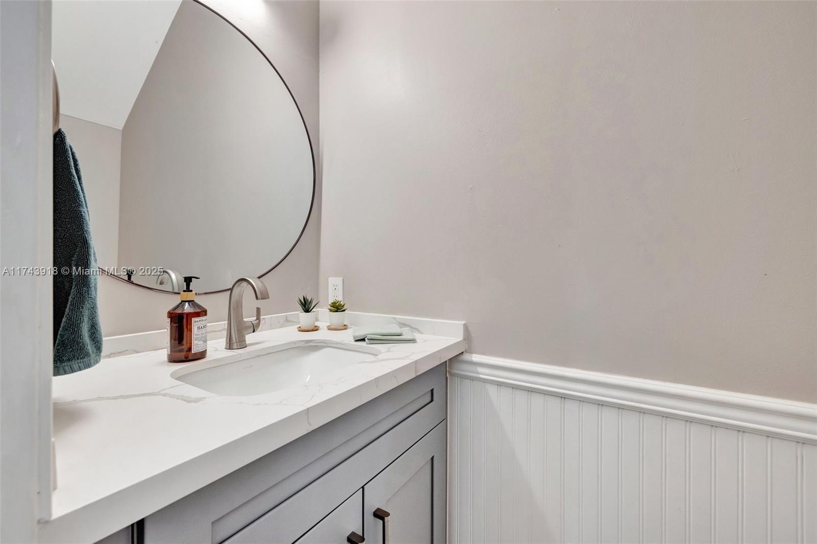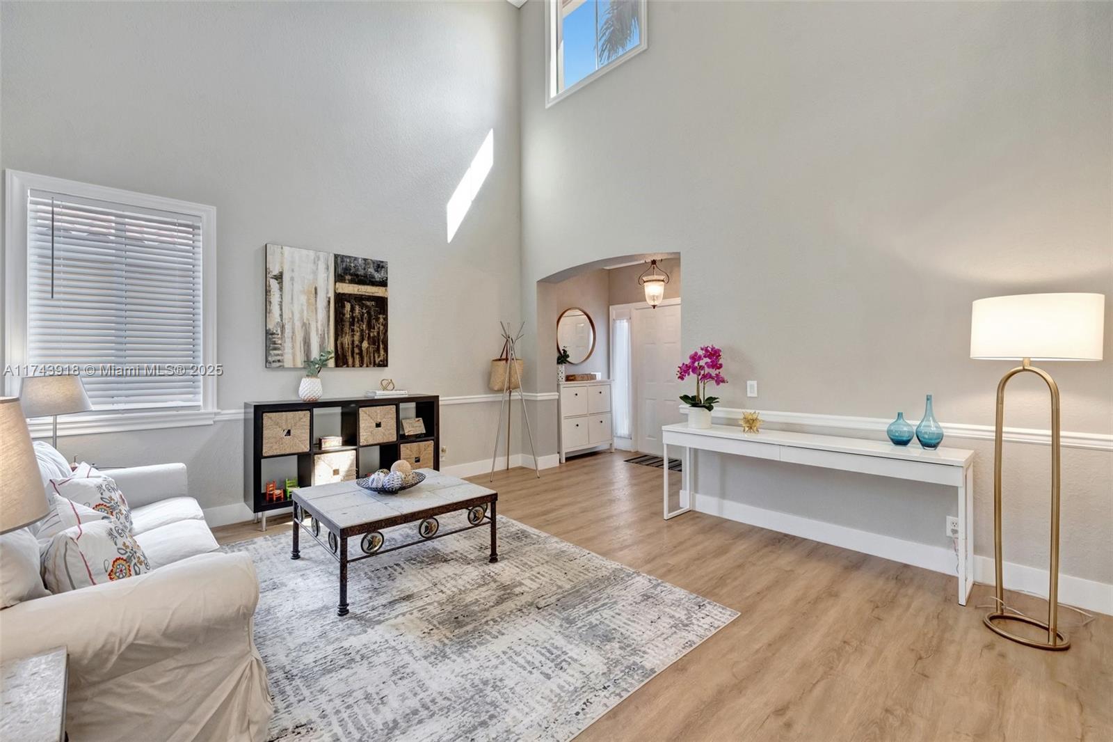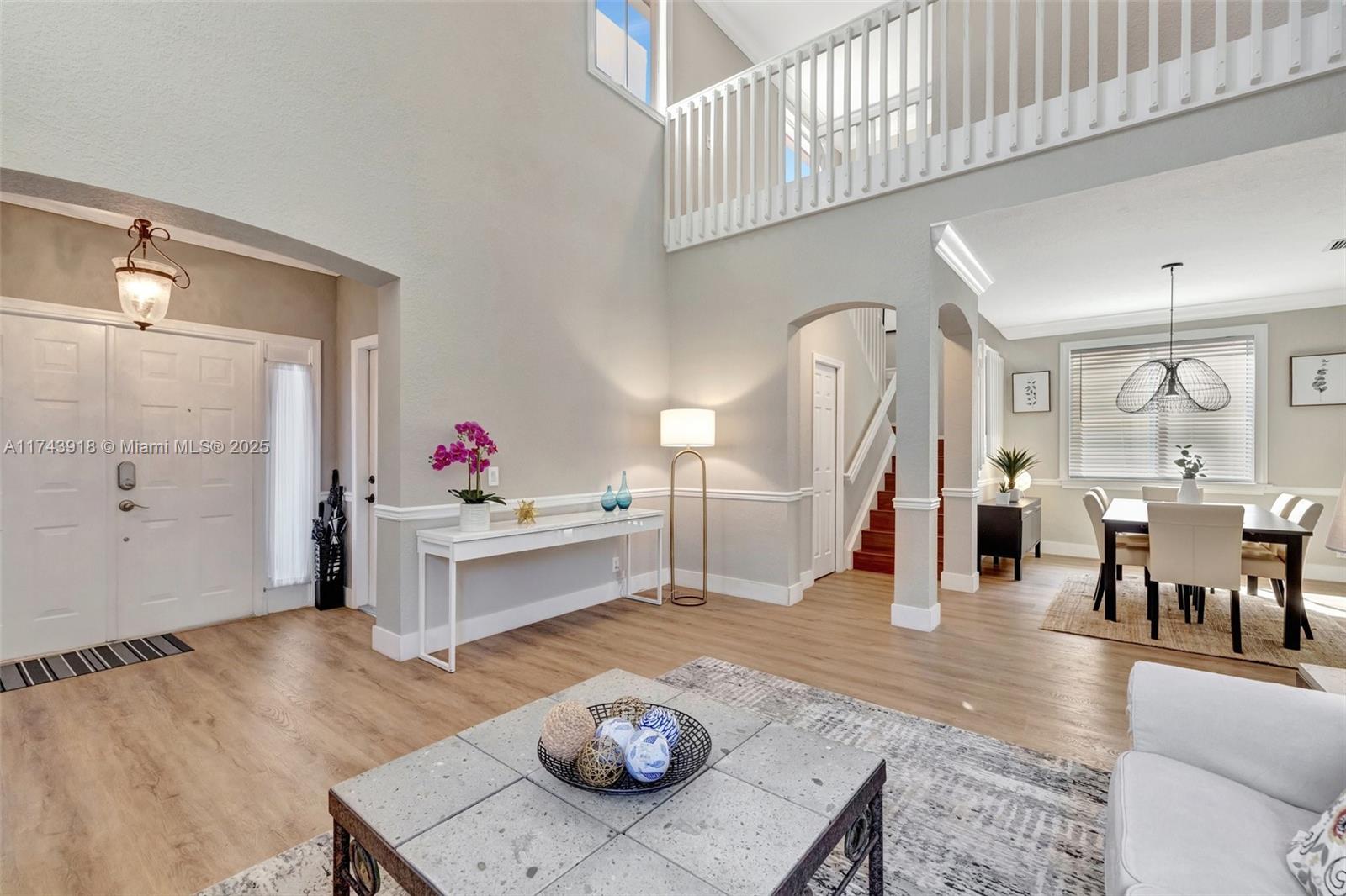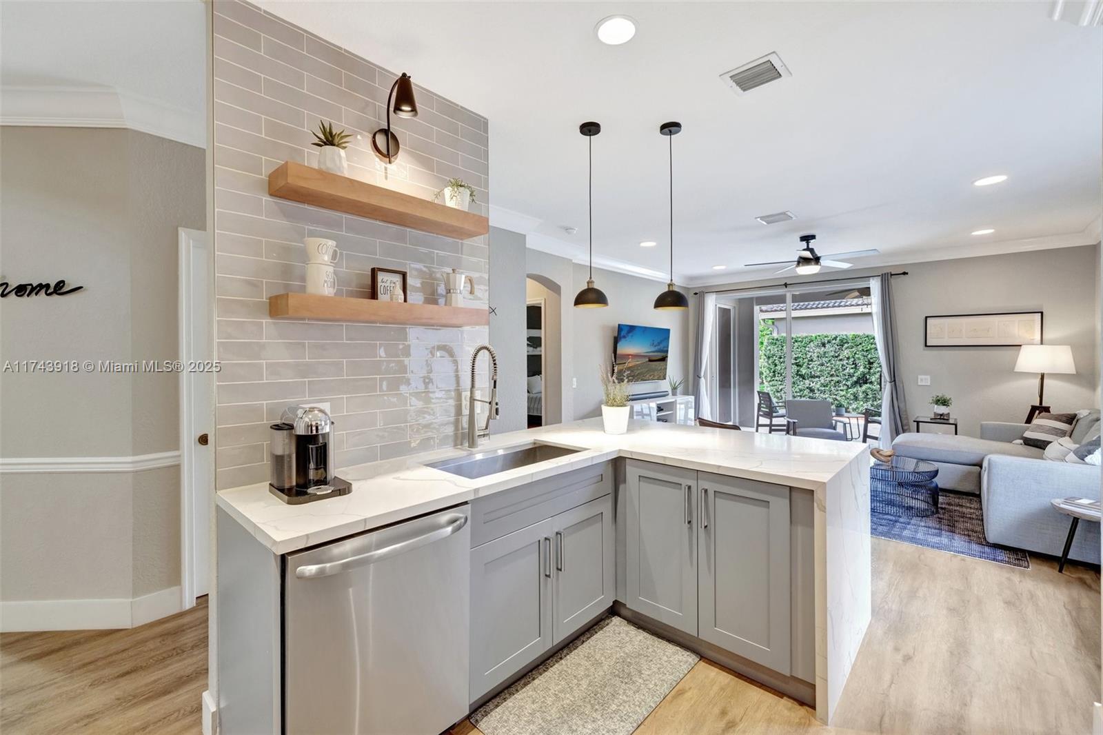 This pristine residence showcases the sought-after Windmill Elite floorplan, featuring upgrades that make this property truly exceptional. High ceilings & elegant foyer welcome you home, leading into the formal living area. Beautifully renovated kitchen meets the highest standards of modern style & functionality. Quartz counters, waterfall edge, two-tone cabinetry in crisp white & sophisticated grey, pullouts, new LG fridge, storage beneath island. Primary suite on 1st floor. Half-bath & 2nd bath renovated. New flooring, baseboards, light fixtures & dimmers. Laundry w/new dryer. Crown molding, trim around windows. Sliding doors to patio & a cozy seating space. New 5-ton A/C. Hurricane shutters, impact front door, workbench in garage perfect for DIY. Your exquisite living experience awaits!