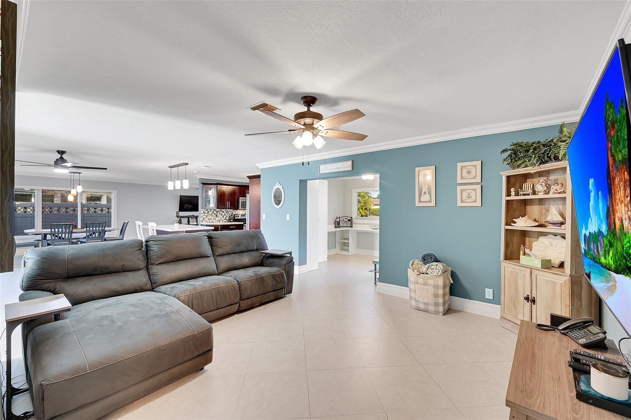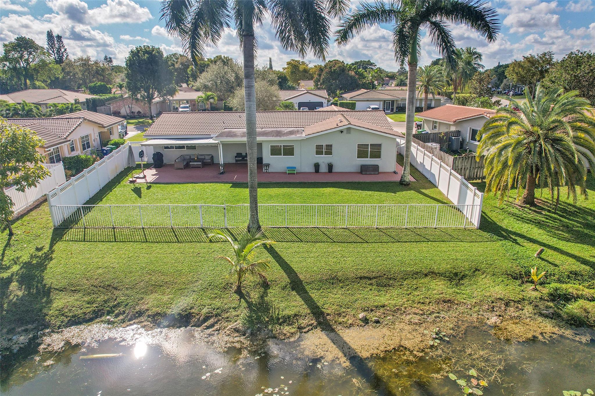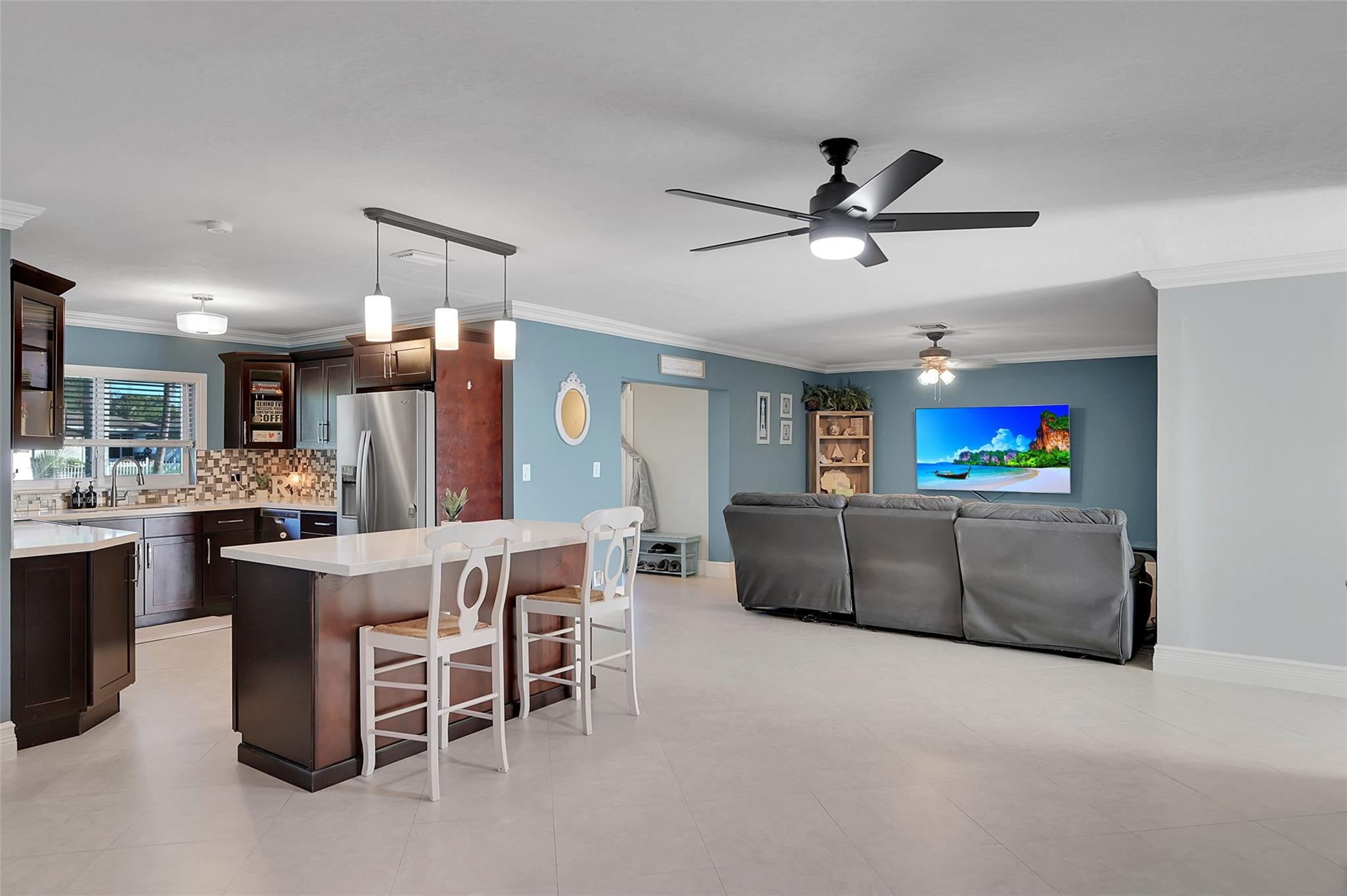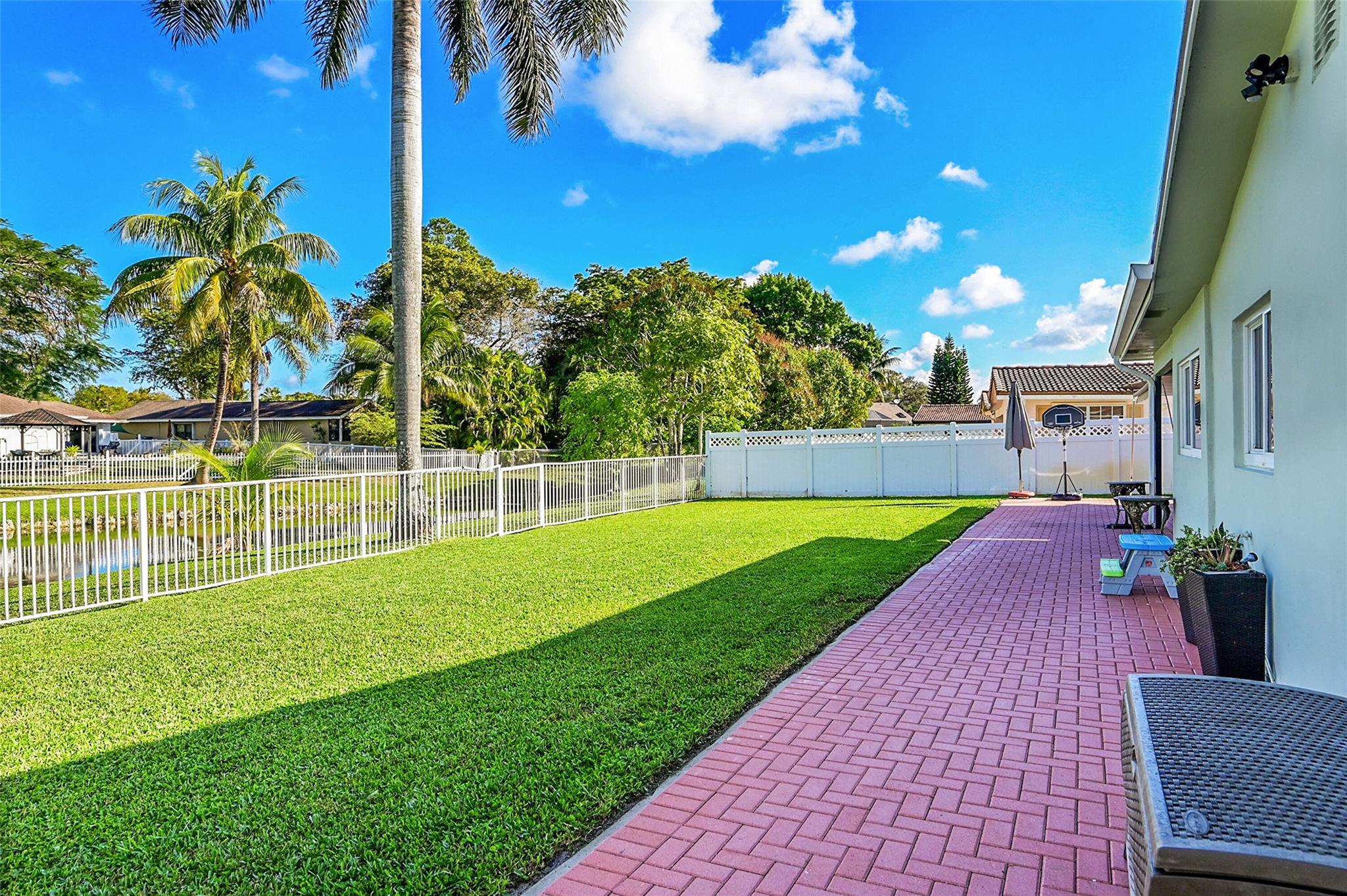 This charming 4 bed, 2 bathroom SFH offers modern comfort and style. The flex room off the family room is perfect for a remote office. There is a 2-car garage with epoxy flooring and laundry facilities. All Impact windows and doors provide peace of mind. The recently remodeled bathroom and California closet in the master suite add luxury. The home has been freshly painted inside and out. Upgrades include a newer A/C (2021). The tile roof, water heater, and brick paver driveway/patio was all installed in 2016. The backyard is a private oasis with a large fenced-in area, retractable awning, and a beautiful canal view. The kitchen is equipped with updated appliances (2017), quartz counters, and brown cabinetry. The home has neutral tile in main areas with laminate flooring in the bedrooms.
