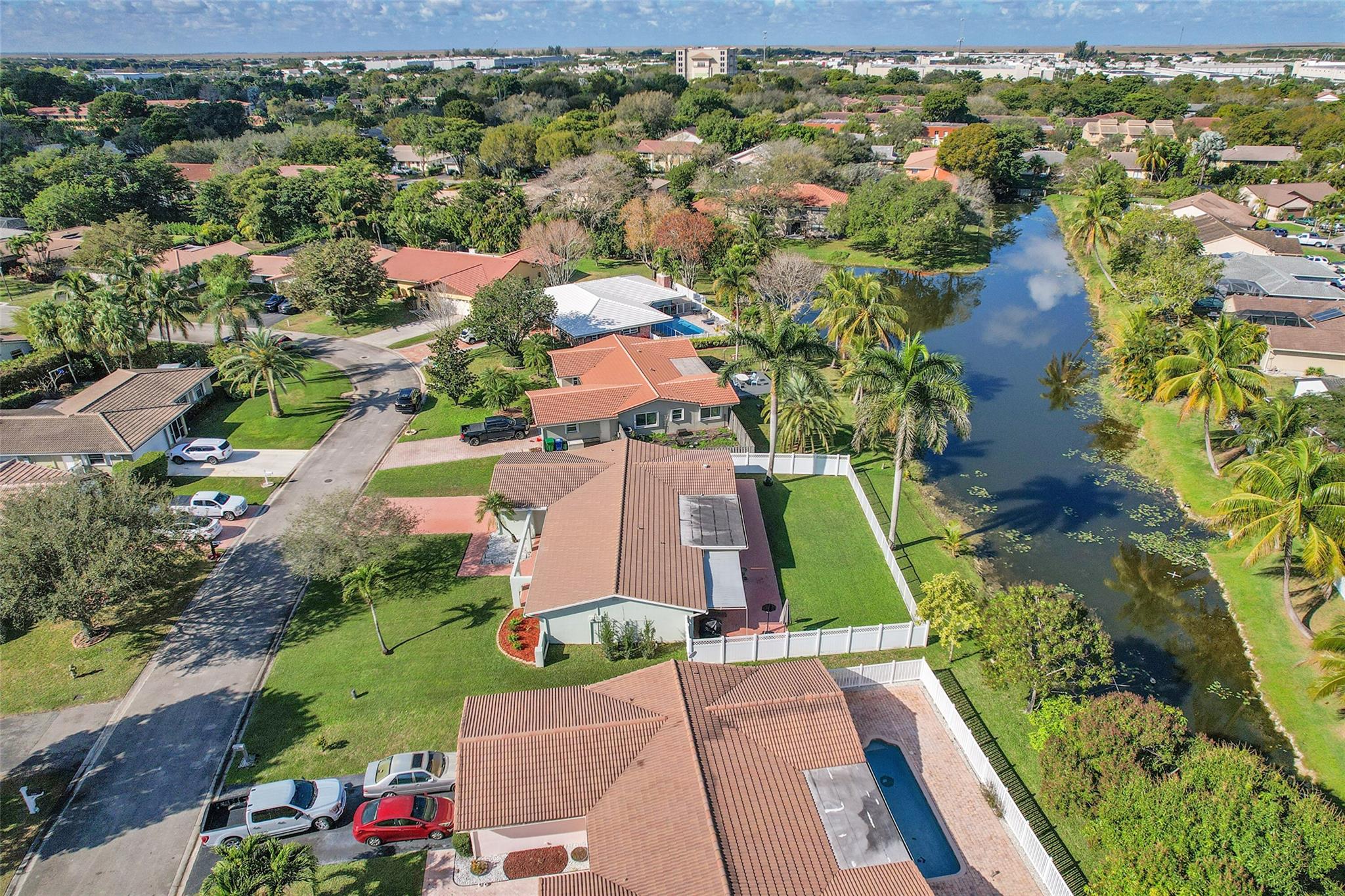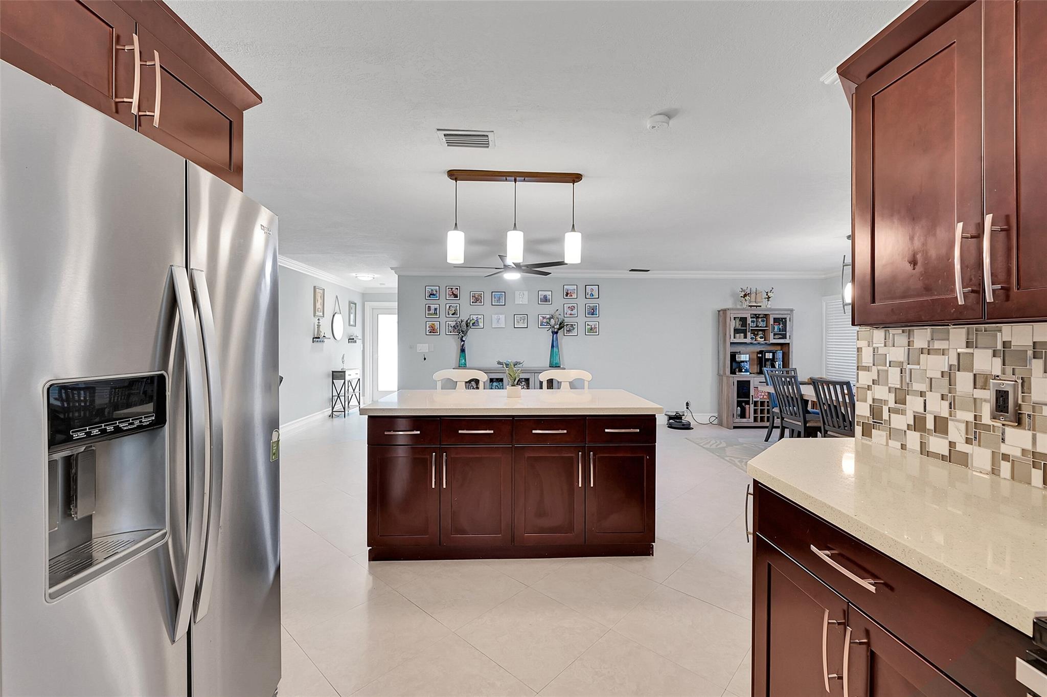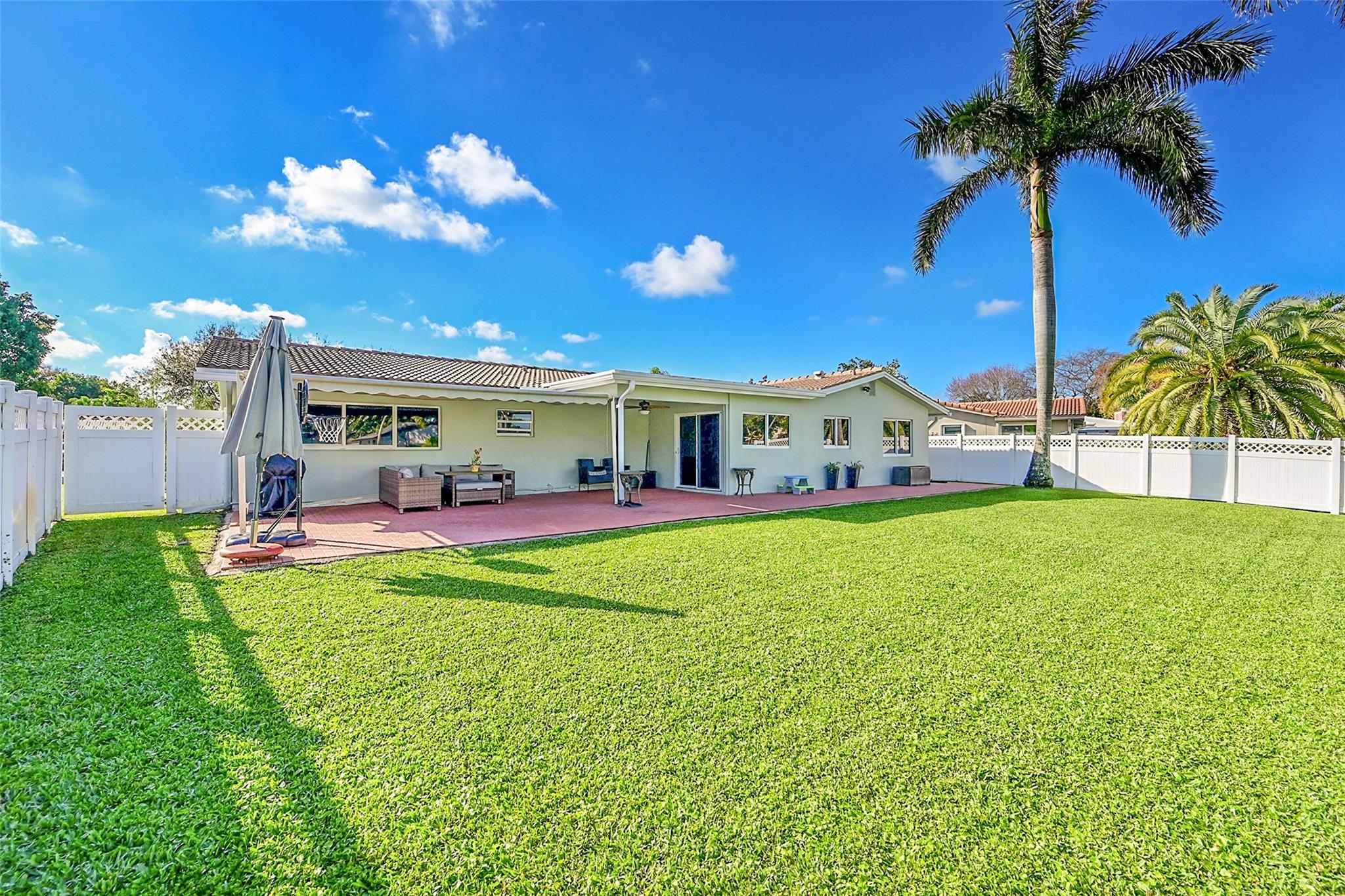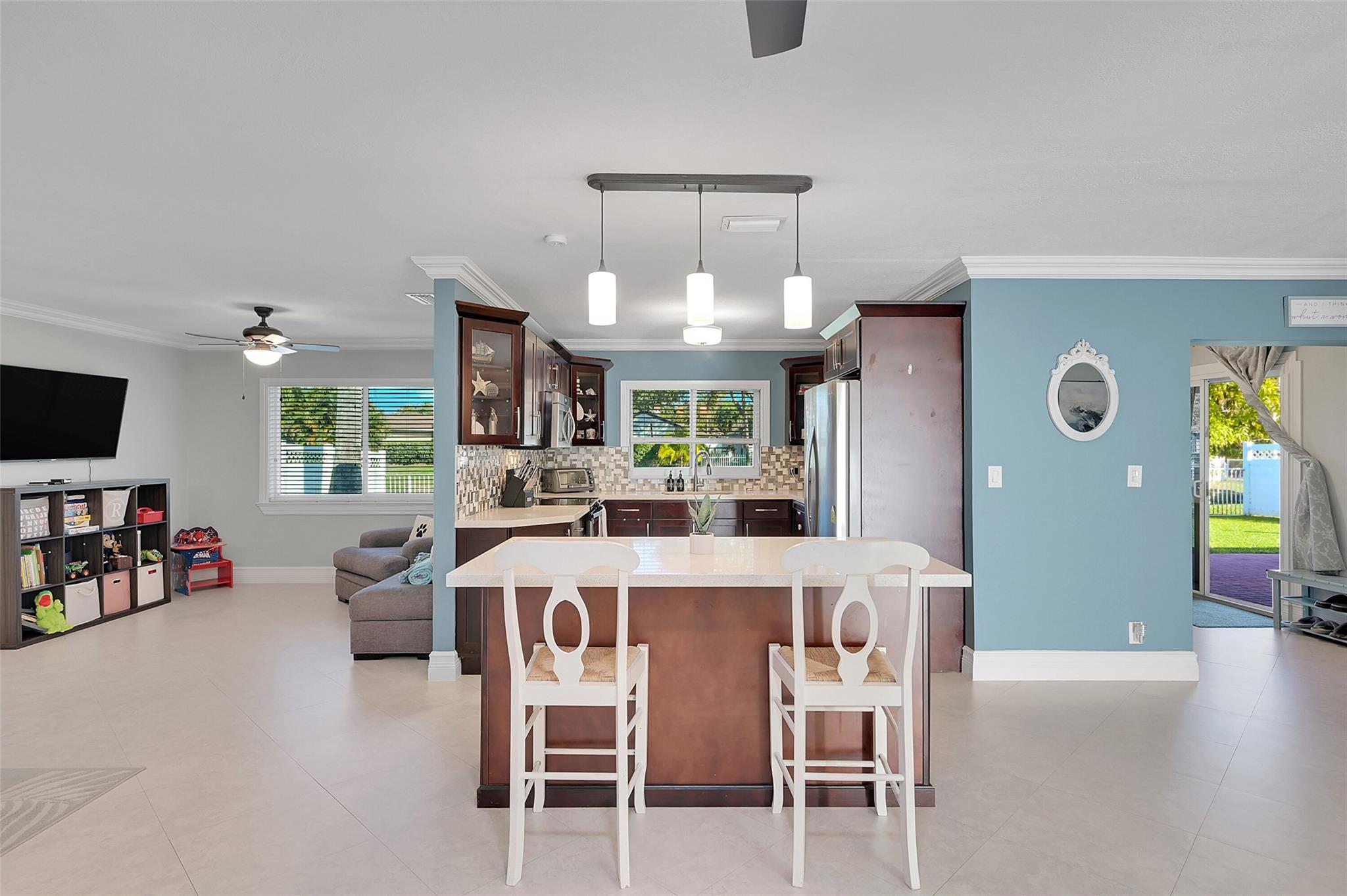 This charming 4 bed, 2 bathroom SFH offers modern comfort and style. The flex room off the family room is perfect for a remote office. There is a 2-car garage with epoxy flooring and laundry facilities. All Impact windows and doors provide peace of mind. The recently remodeled bathroom and California closet in the master suite add luxury. The home has been freshly painted inside and out. Upgrades include a newer A/C (2021). The tile roof, water heater, and brick paver driveway/patio was all installed in 2016. The backyard is a private oasis with a large fenced-in area, retractable awning, and a beautiful canal view. The kitchen is equipped with updated appliances (2017), quartz counters, and brown cabinetry. The home has neutral tile in main areas with laminate flooring in the bedrooms.