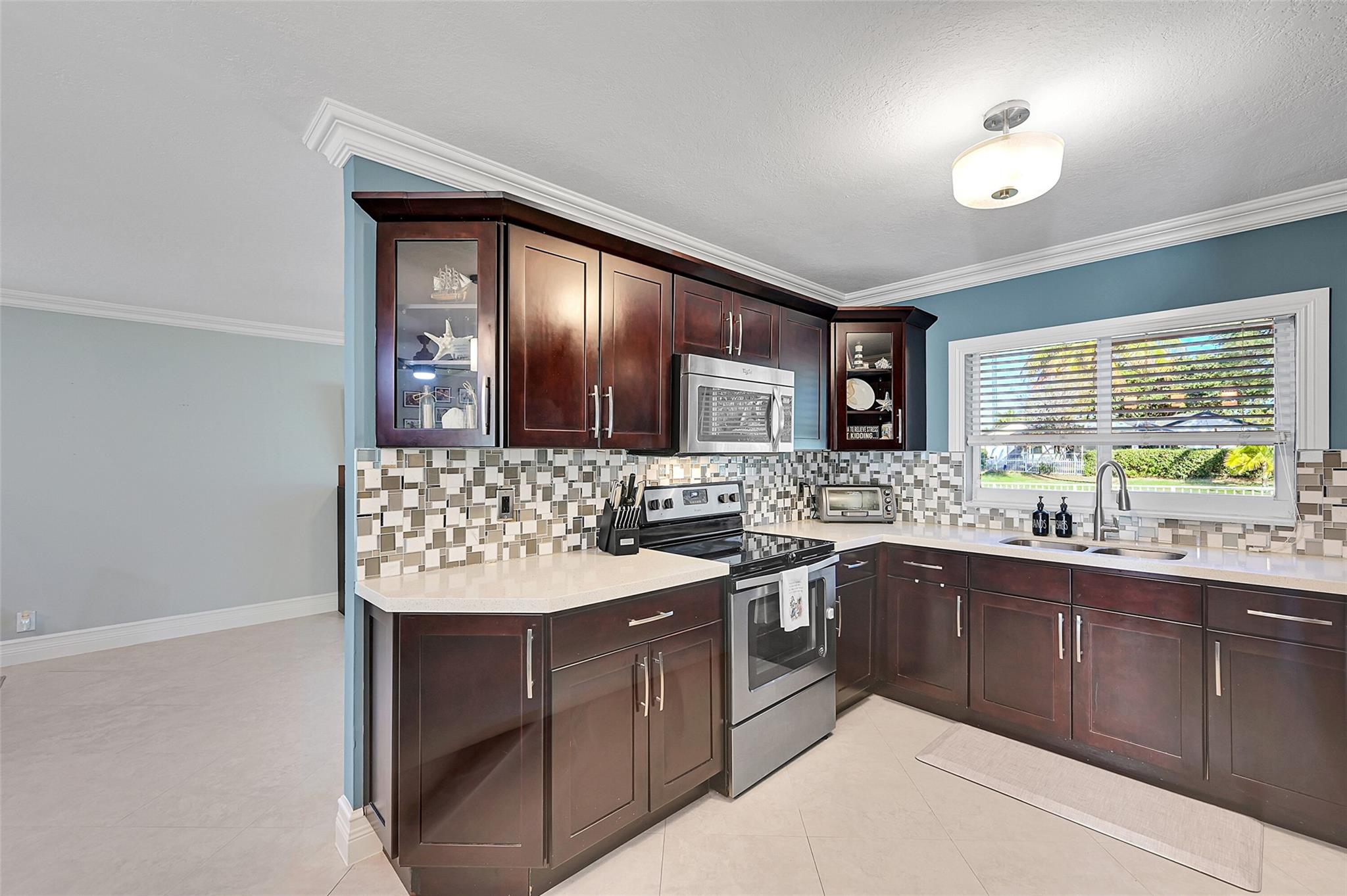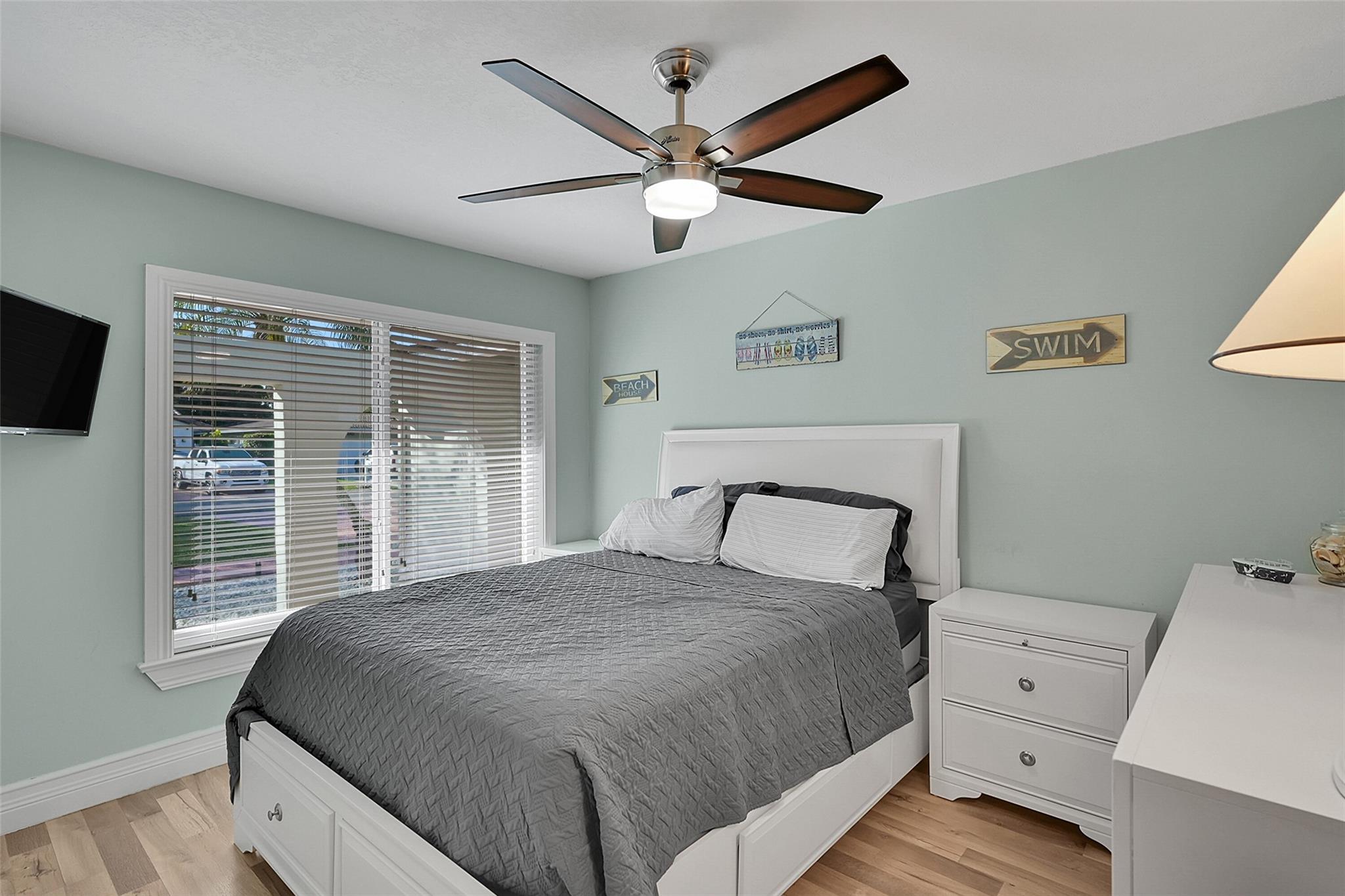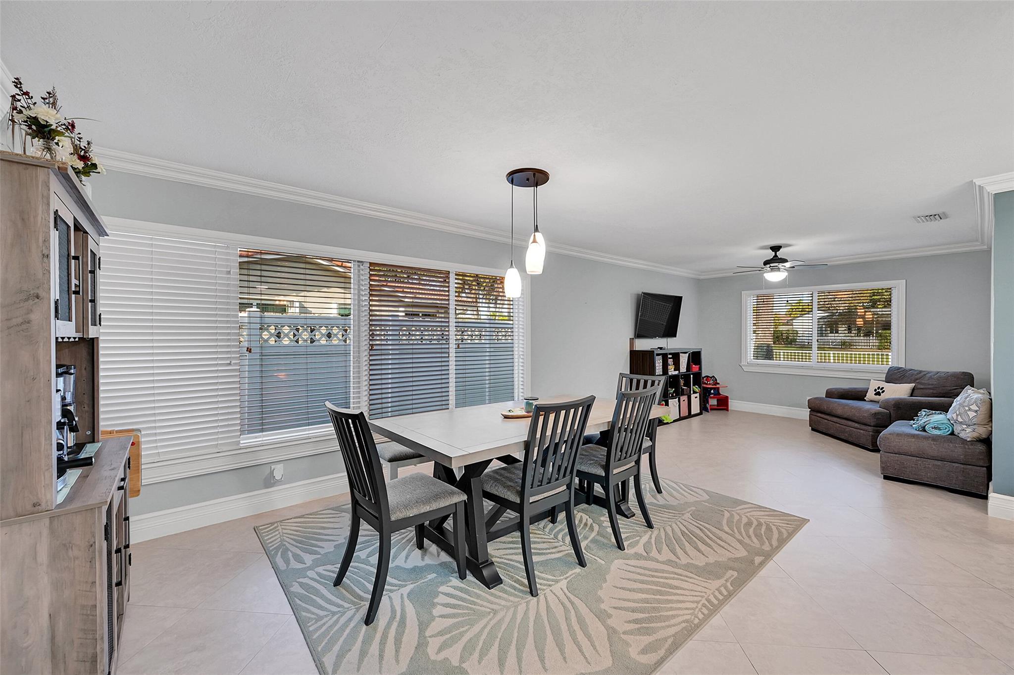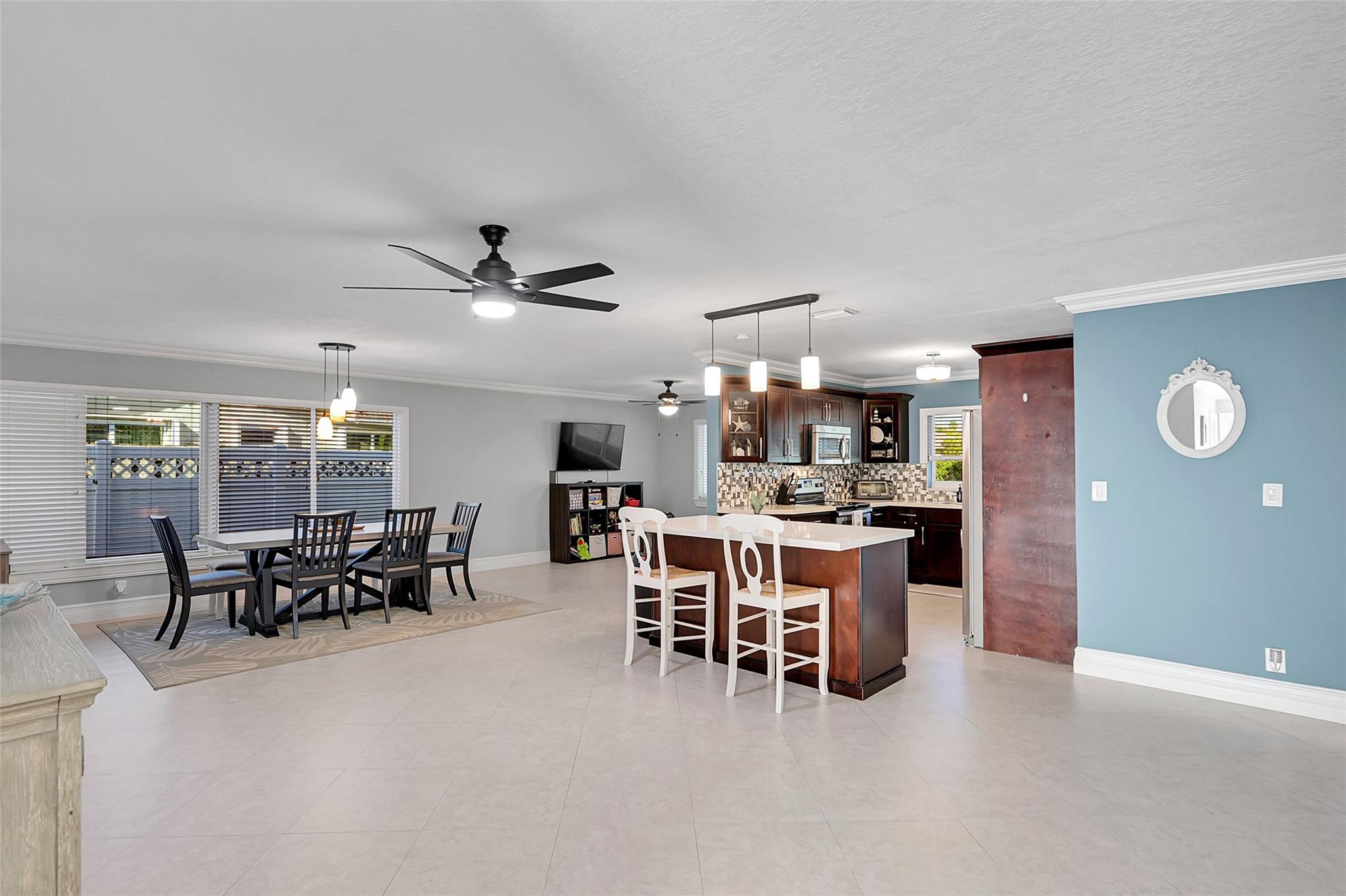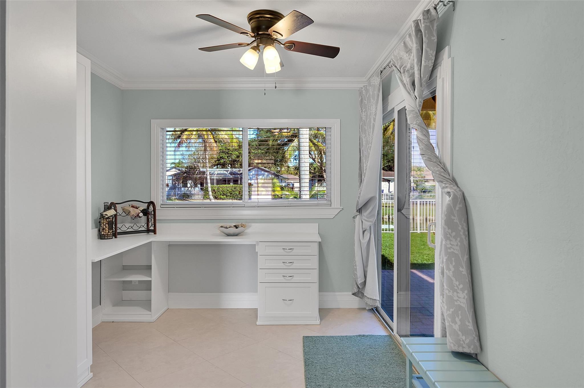 This charming 4 bed, 2 bathroom SFH offers modern comfort and style. The flex room off the family room is perfect for a remote office. There is a 2-car garage with epoxy flooring and laundry facilities. All Impact windows and doors provide peace of mind. The recently remodeled bathroom and California closet in the master suite add luxury. The home has been freshly painted inside and out. Upgrades include a newer A/C (2021). The tile roof, water heater, and brick paver driveway/patio was all installed in 2016. The backyard is a private oasis with a large fenced-in area, retractable awning, and a beautiful canal view. The kitchen is equipped with updated appliances (2017), quartz counters, and brown cabinetry. The home has neutral tile in main areas with laminate flooring in the bedrooms.
