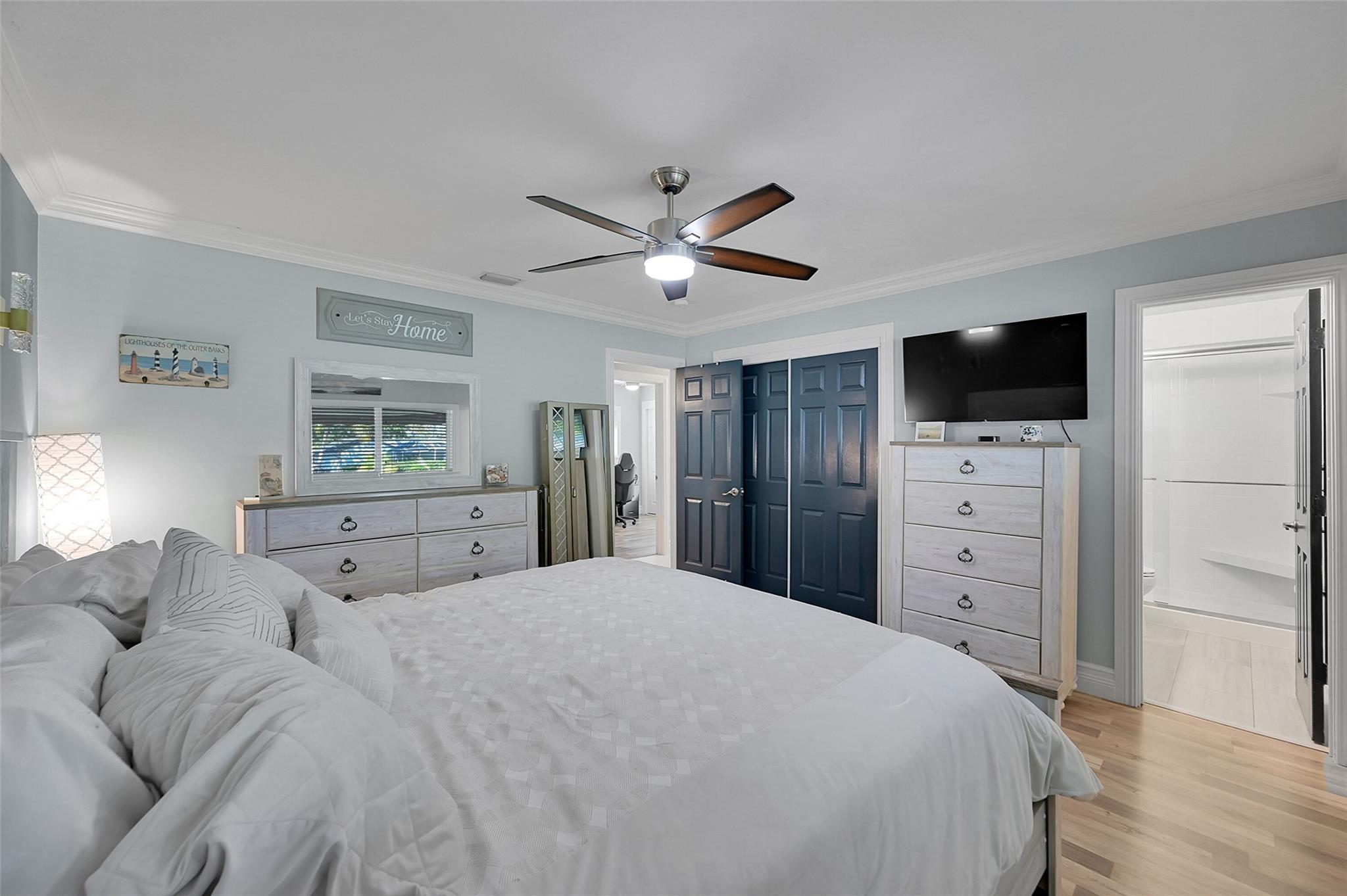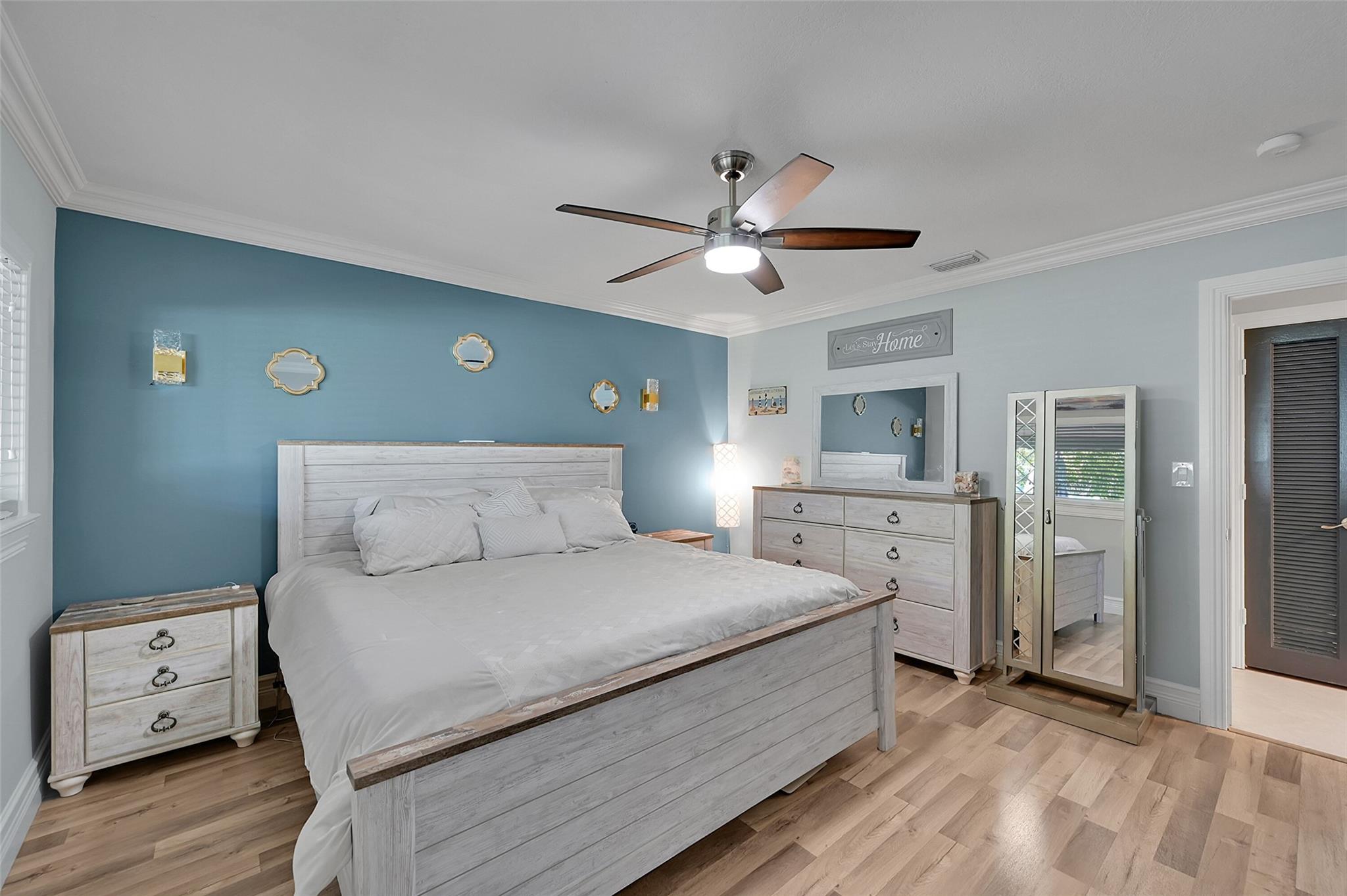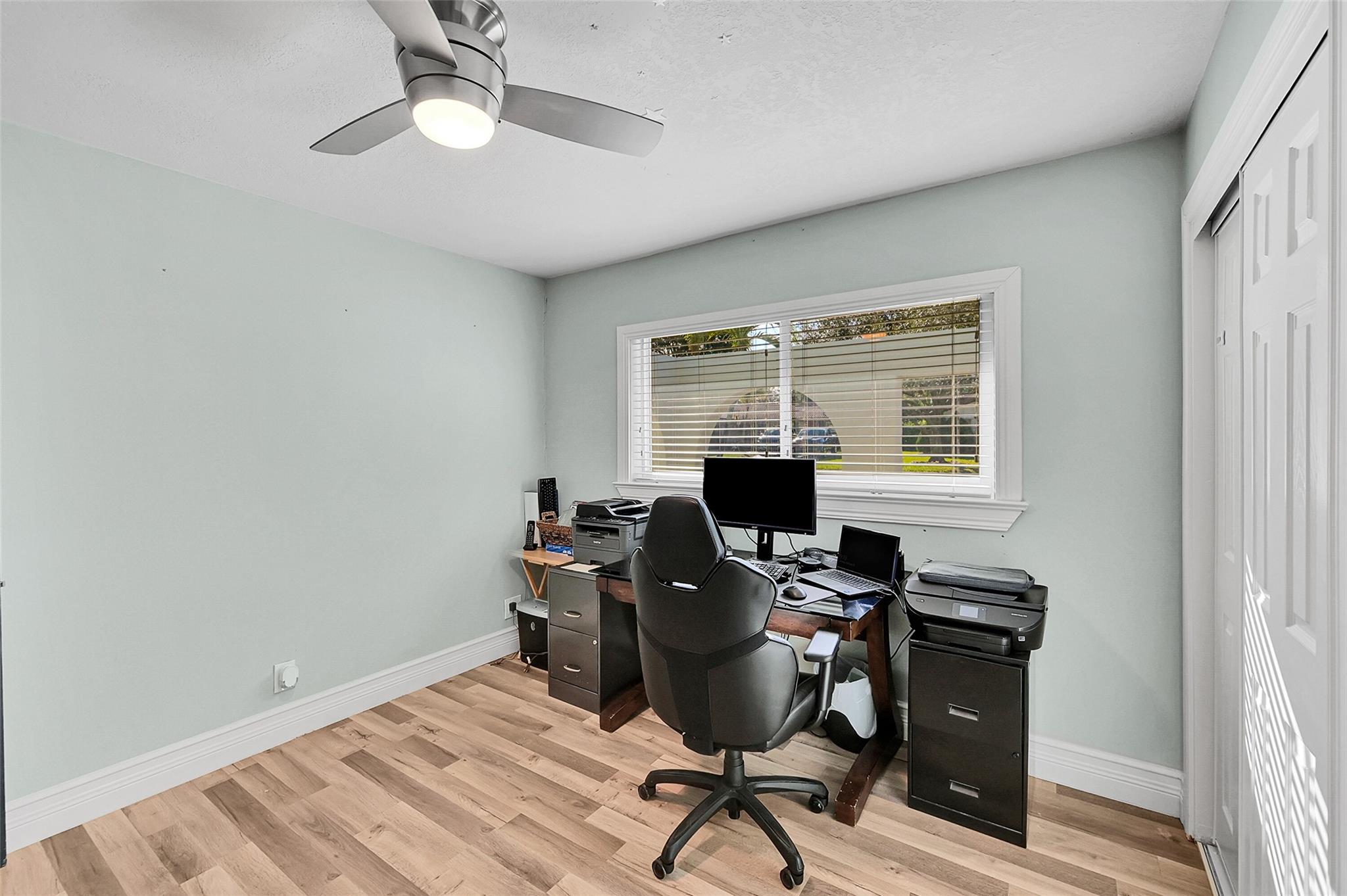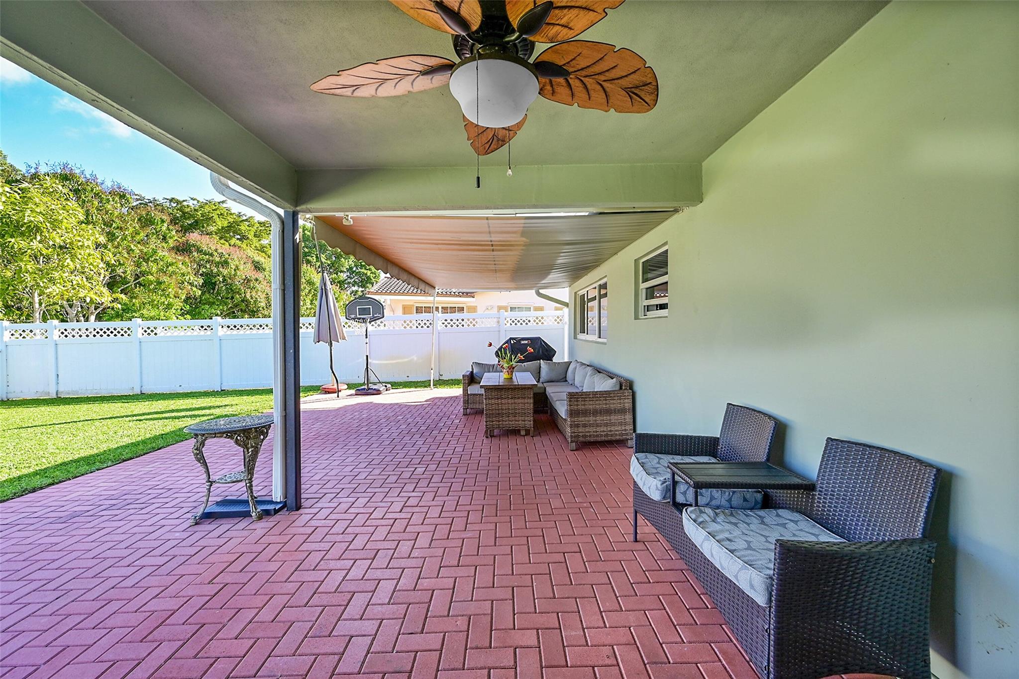 This charming 4 bed, 2 bathroom SFH offers modern comfort and style. The flex room off the family room is perfect for a remote office. There is a 2-car garage with epoxy flooring and laundry facilities. All Impact windows and doors provide peace of mind. The recently remodeled bathroom and California closet in the master suite add luxury. The home has been freshly painted inside and out. Upgrades include a newer A/C (2021). The tile roof, water heater, and brick paver driveway/patio was all installed in 2016. The backyard is a private oasis with a large fenced-in area, retractable awning, and a beautiful canal view. The kitchen is equipped with updated appliances (2017), quartz counters, and brown cabinetry. The home has neutral tile in main areas with laminate flooring in the bedrooms.