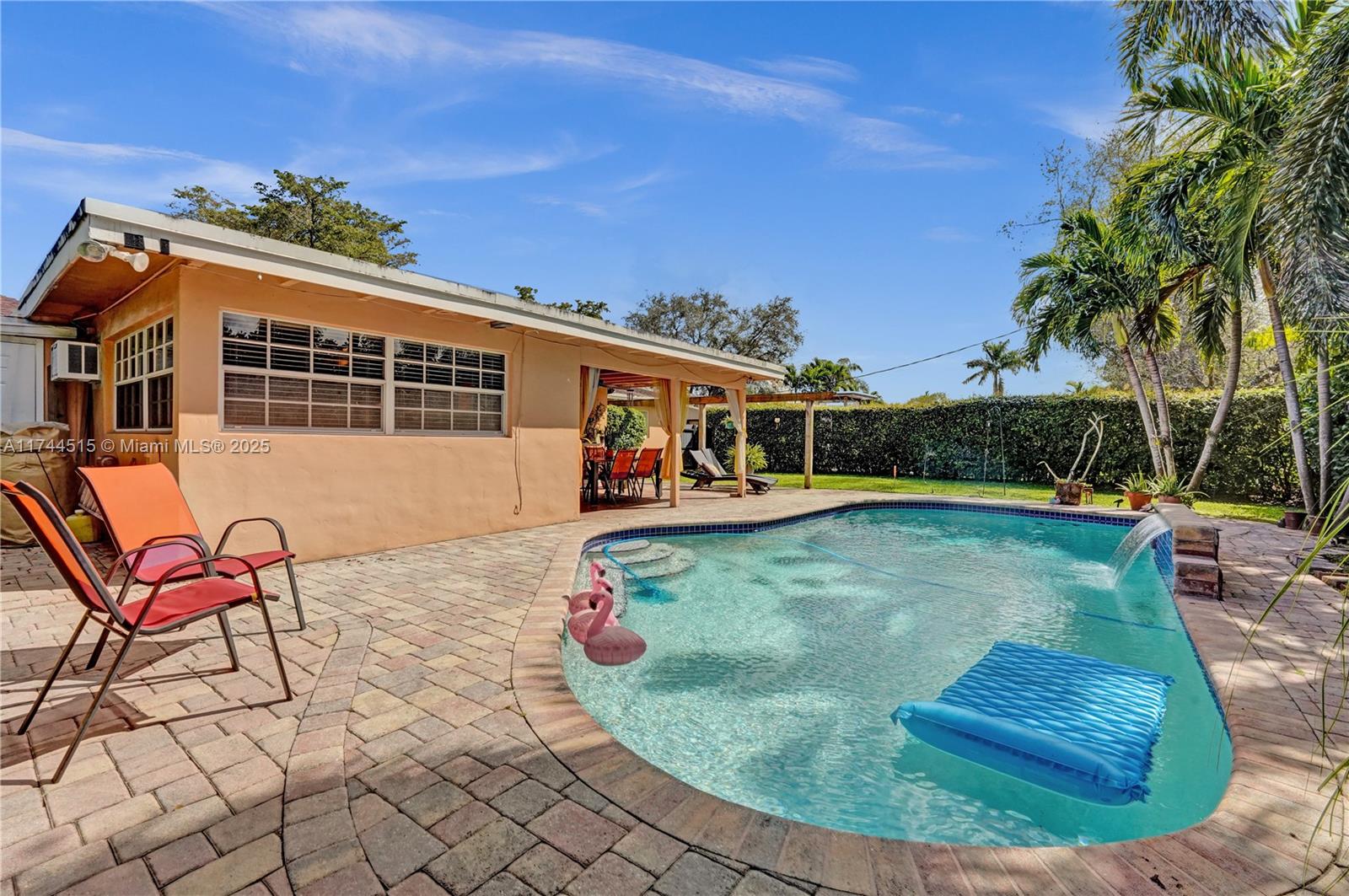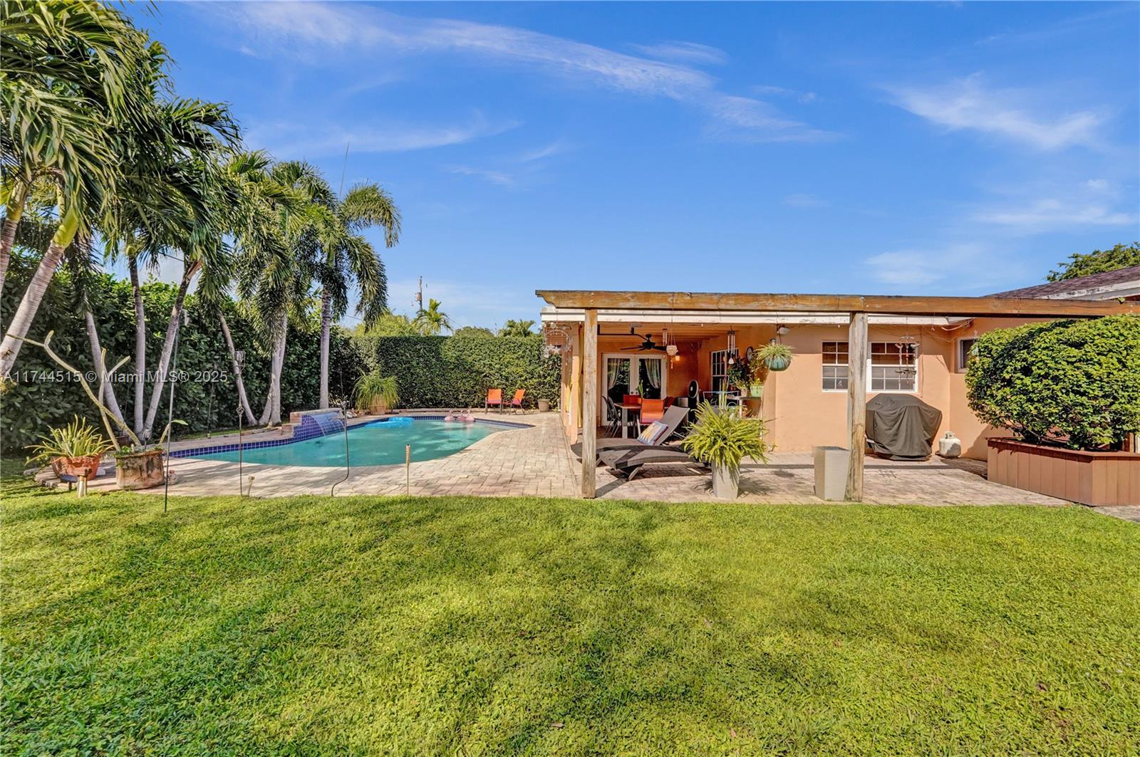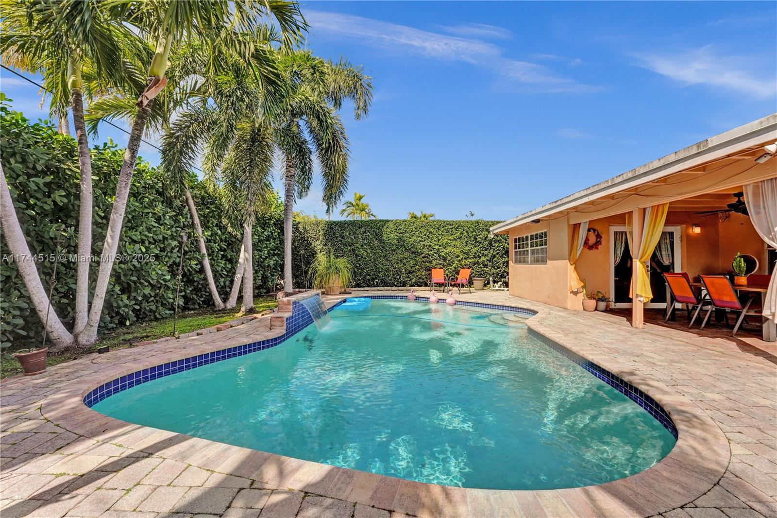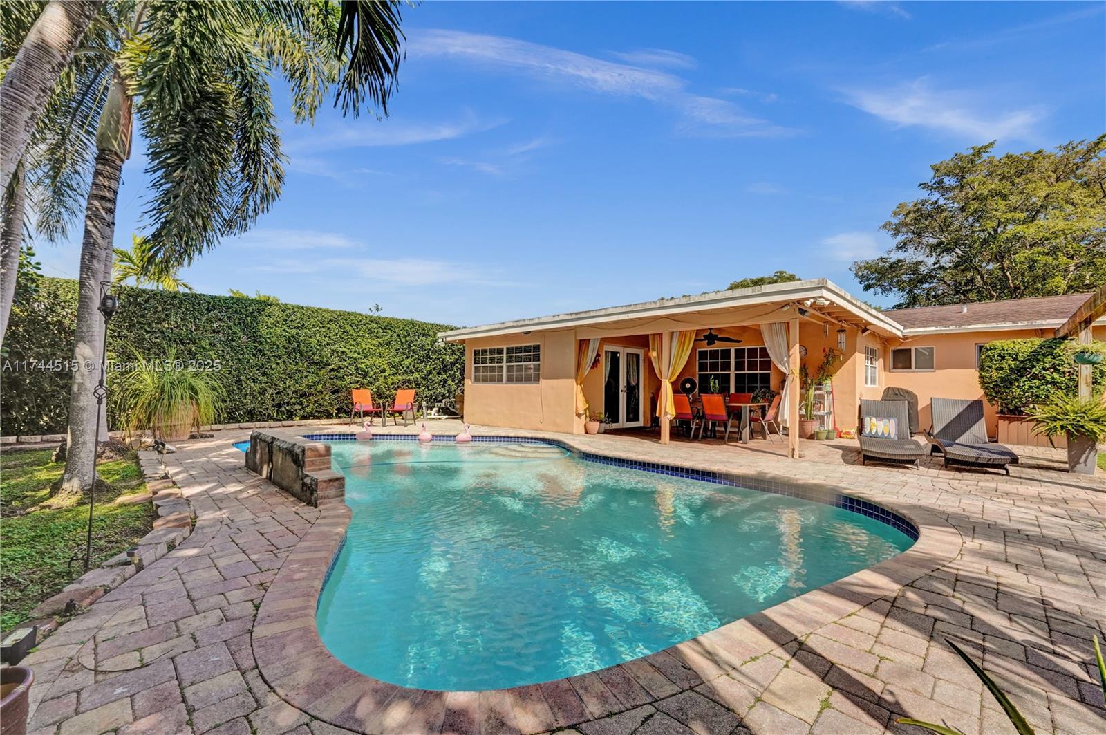 Open and spacious, 4-bedroom, 3-full-bath pool home in the heart of Hollywood Hills! All living spaces are open and make this home ideal for living, raising a family and entertaining. The piece de resistance is the resort-like backyard and in-ground pool with fountain, covered patio area for outdoor dining rain or shine and lots of green grass for playing games and watching your pets and family play! There's also a mosquito system, sprinkler with auto timer, 3 security cameras, house alarm, wired smoke detectors all with ADT, a storage shed with electricity, newer AC and water heater. Most windows and all doors are impact. Close to A-rated elementary school and houses of worship.
