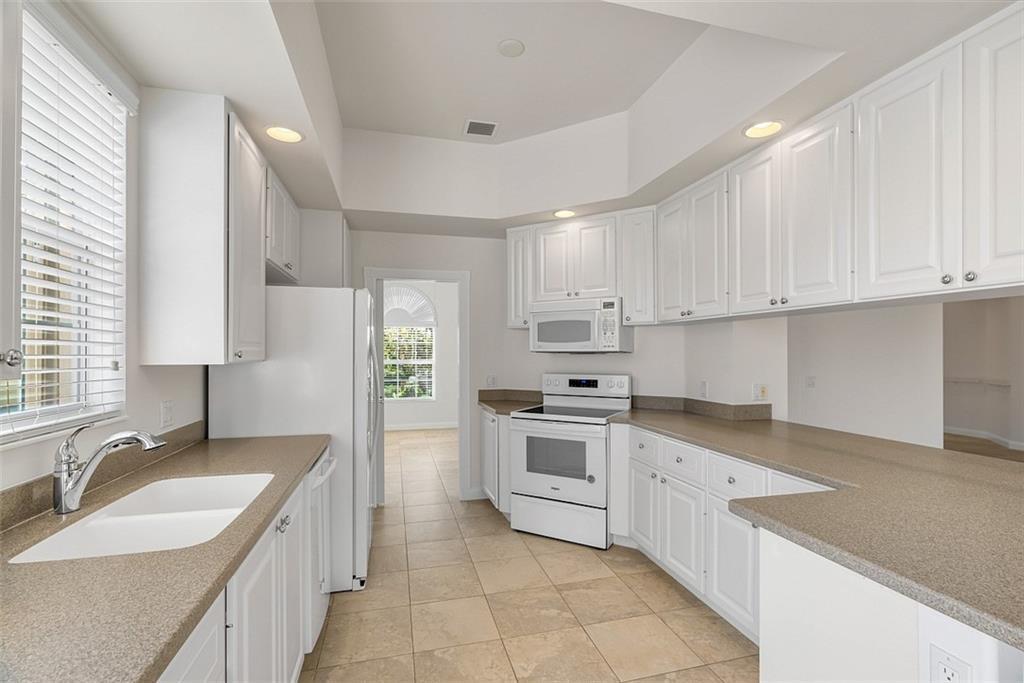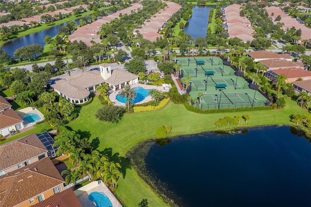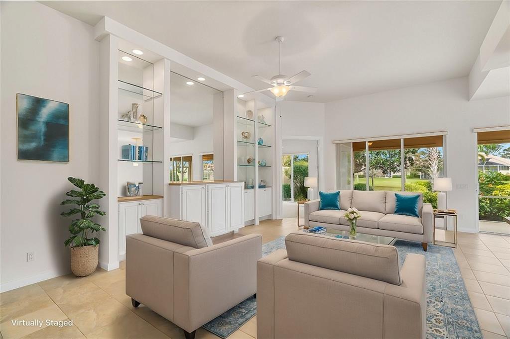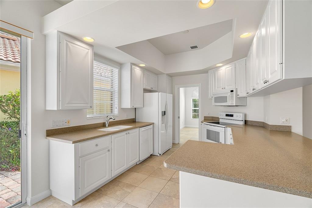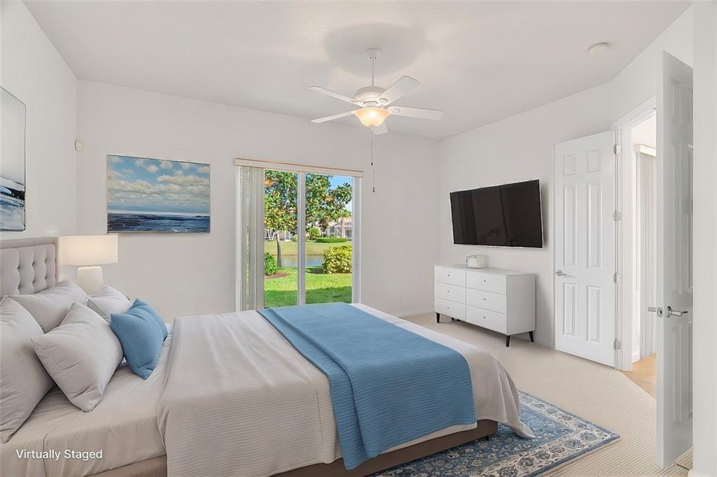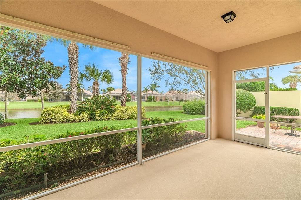 Relax and Enjoy this charming Oakmont Model Home - 3BD/3BA w/Den overlooking the lake! NEW 2025 AC; Freshly painted inside & out included the 2 car garage. The Kitchen boasts white cabinets & corian countertops; white appliances; tile throughout main living area; beautiful built-in wall unit w/glass shelves; new carpet in Primary Bedroom w/walk in the closets & his & her bathroom; accordion shutters. Extended brick paver patio to enjoy Florida's sunrises and sunsets. Resort style amenities incl. clubhouse, heated pool, tennis/pickleball courts, fitness center and gathering area for our many social events!