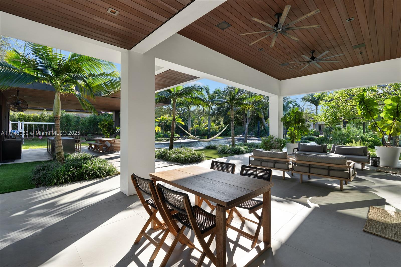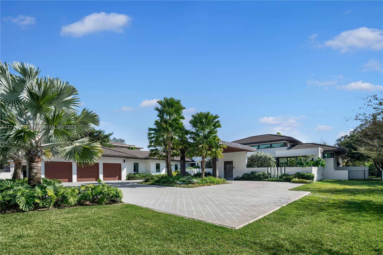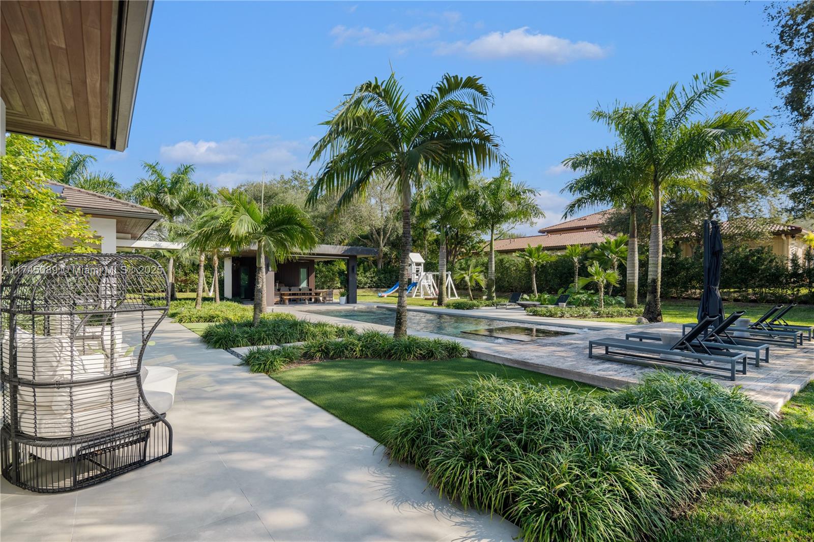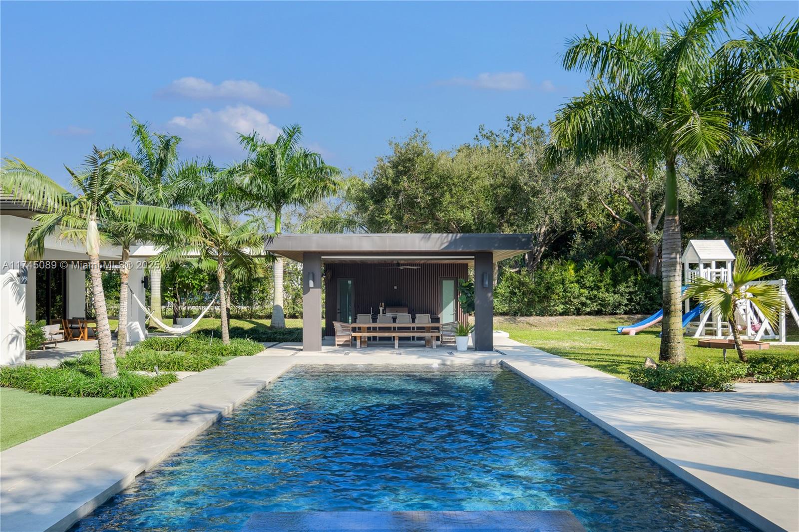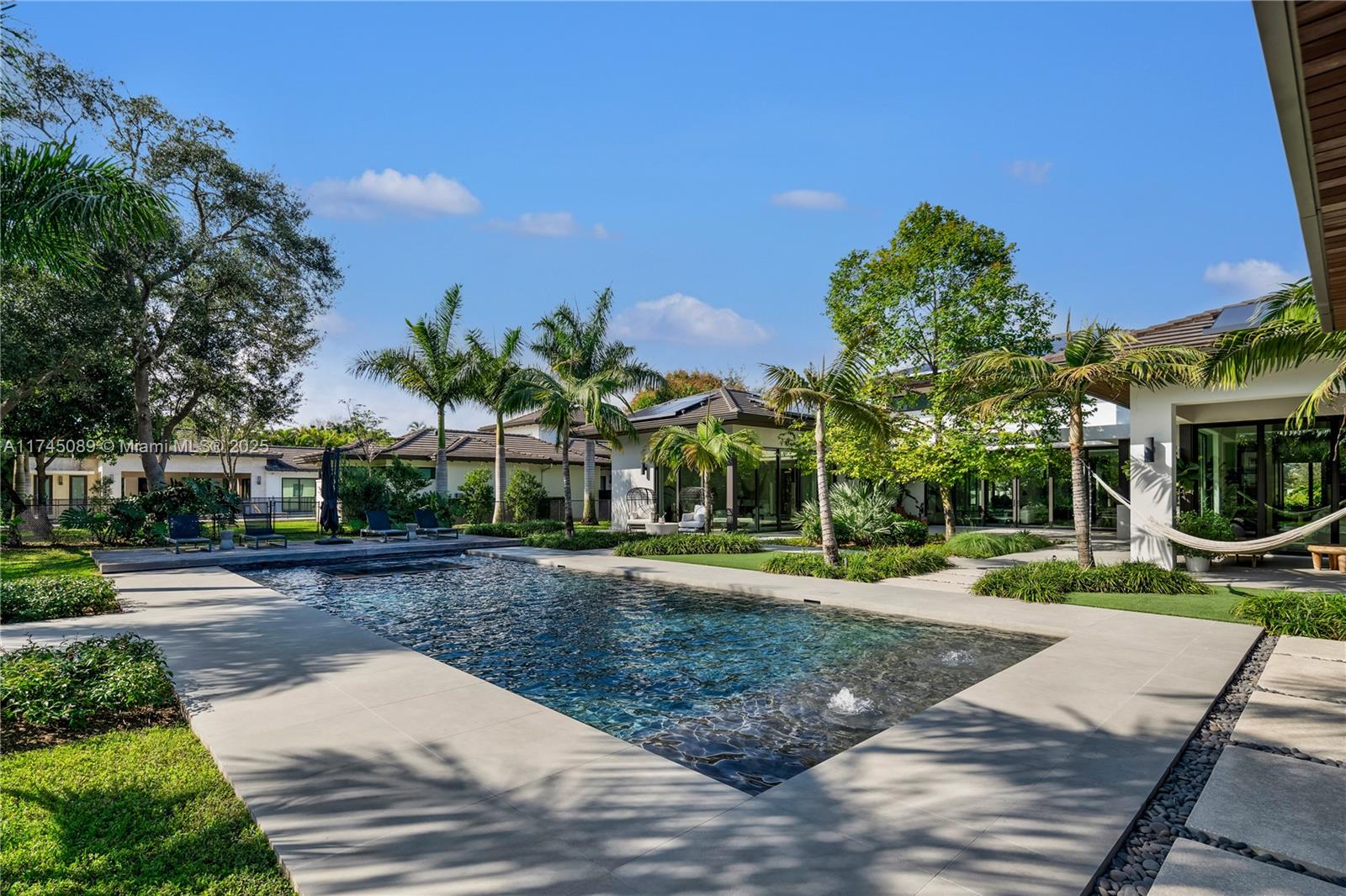 Luxury, sustainability & modern elegance define this stunning 5-bed, playroom+2 den, 6.5-bath Pinecrest estate. Step inside to an open-concept layout with floor to ceiling windows that seamlessly blends style with functionality. The gourmet kitchen features a 6-burner Wolf gas range, pot filler, double ovens, quartz counters & eat-in island for 8. A temp-controlled 504-bottle wine cellar, fireplace, bar, & coffee station completes the space. The primary suite has blackout shades, boutique-style closets & spa-like en-suite. 3 en-suite guest rooms, plus a maid’s suite with private dog run. Lush landscaping, turf play area, summer kitchen cabana bath & heated saltwater pool/spa create a perfect oasis. Gated entry, whole-house solar panels, & 3-car garage accentuates this high-tech sanctuary.