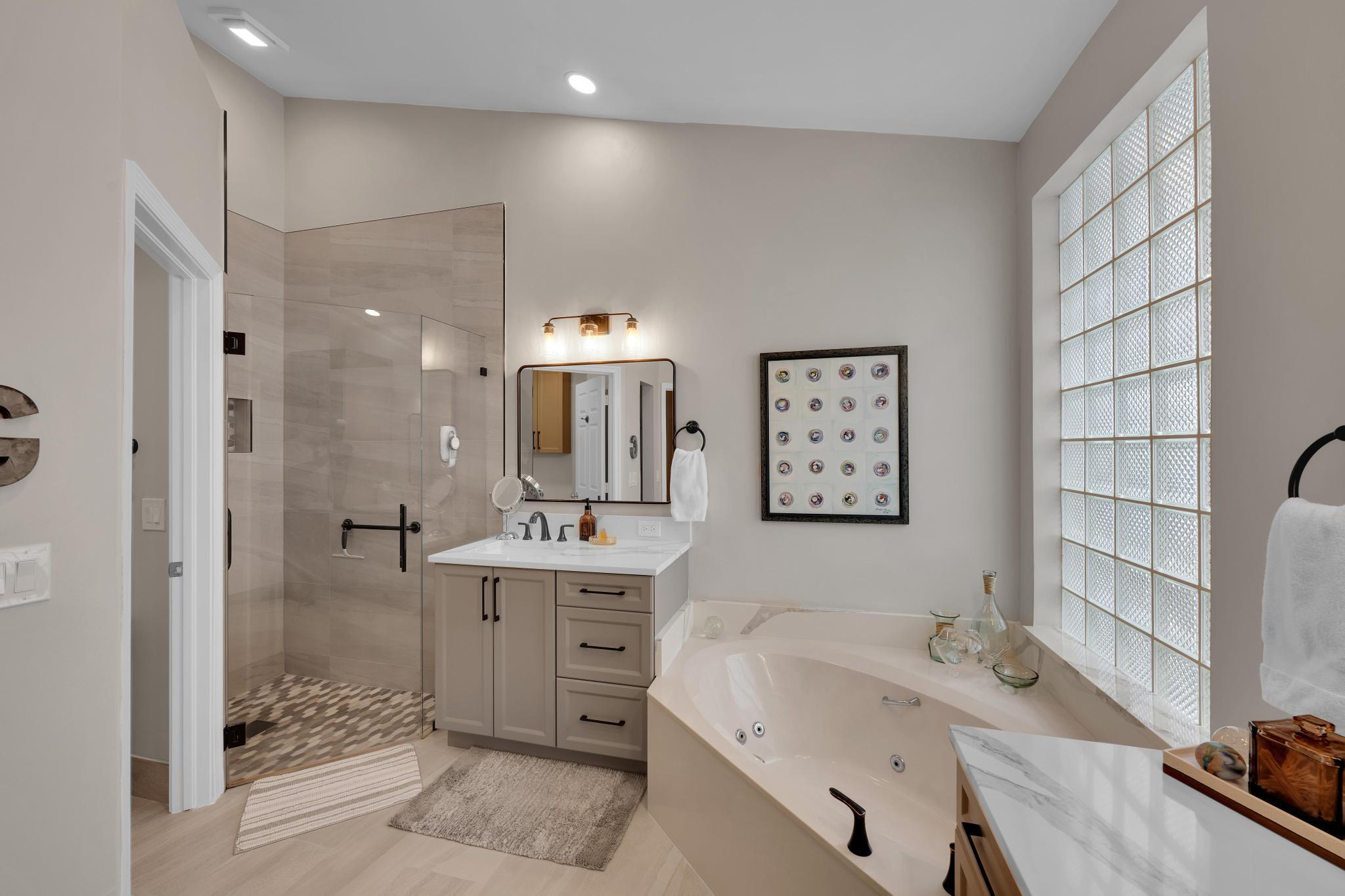 Spacious single-story home in desirable Hampton Fairways 55+ community! Enjoy 2,402 sq ft of tiled living space with 3 ensuite bedrooms, great room, family room, and large screened-in patio showcasing a stunning lake view with a lit fountain. The updated main bath features dual vanities, glass shower enclosure, and jetted tub. Kitchen with granite counters, stainless-steel appliances, storm-protected windows/doors, and a 2021 roof add value. Community perks include lawn care, -- on scheduled basis: exterior painting, driveway, walkways and roof power washing, and more. Up to two, 25-pound pets are welcome. Walking distance to community club house and pool. Indian Spring Club membership available but NOT required! Furniture available separately.