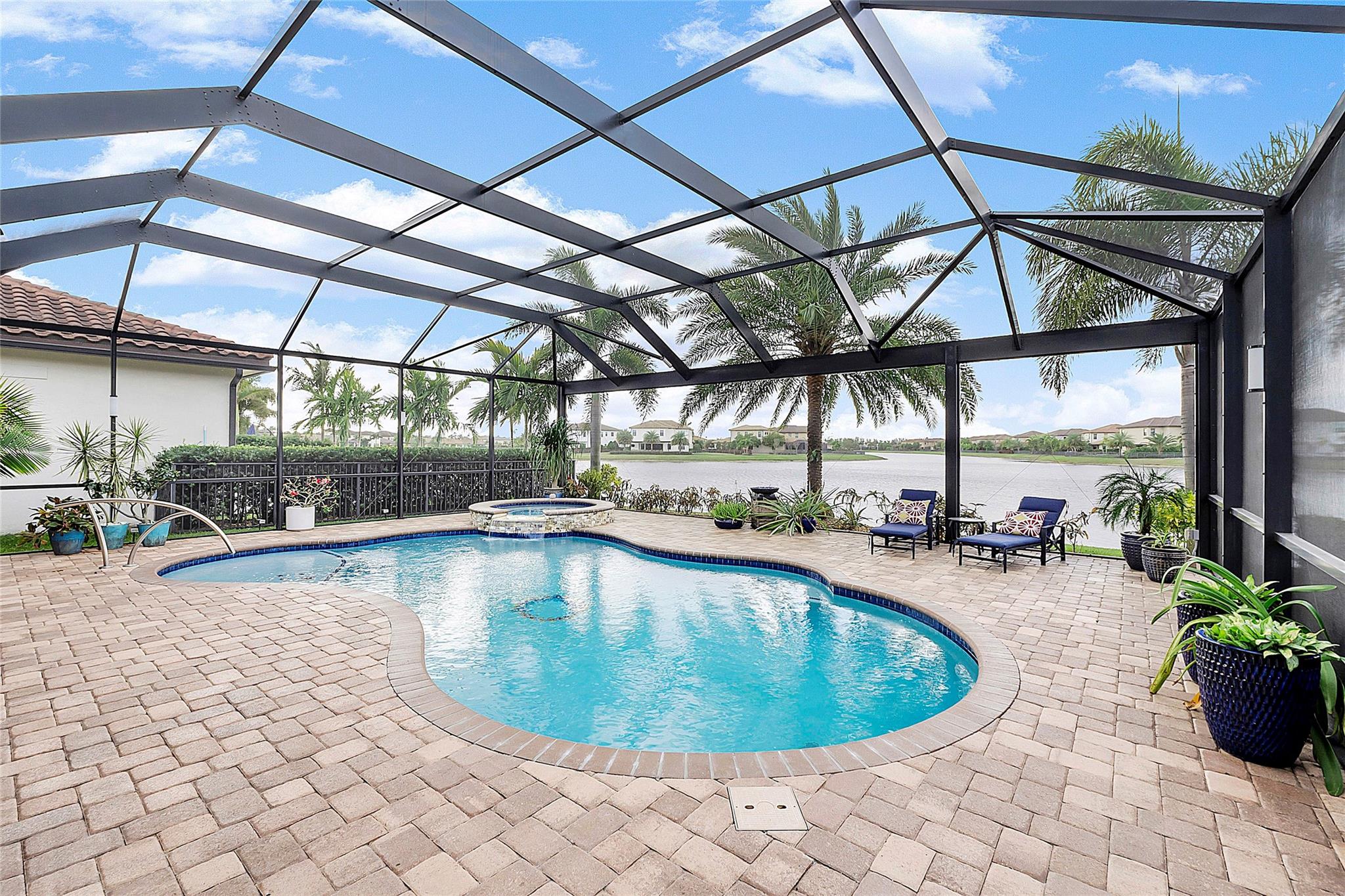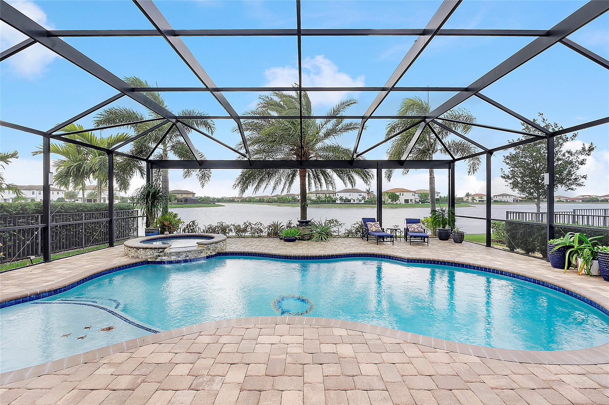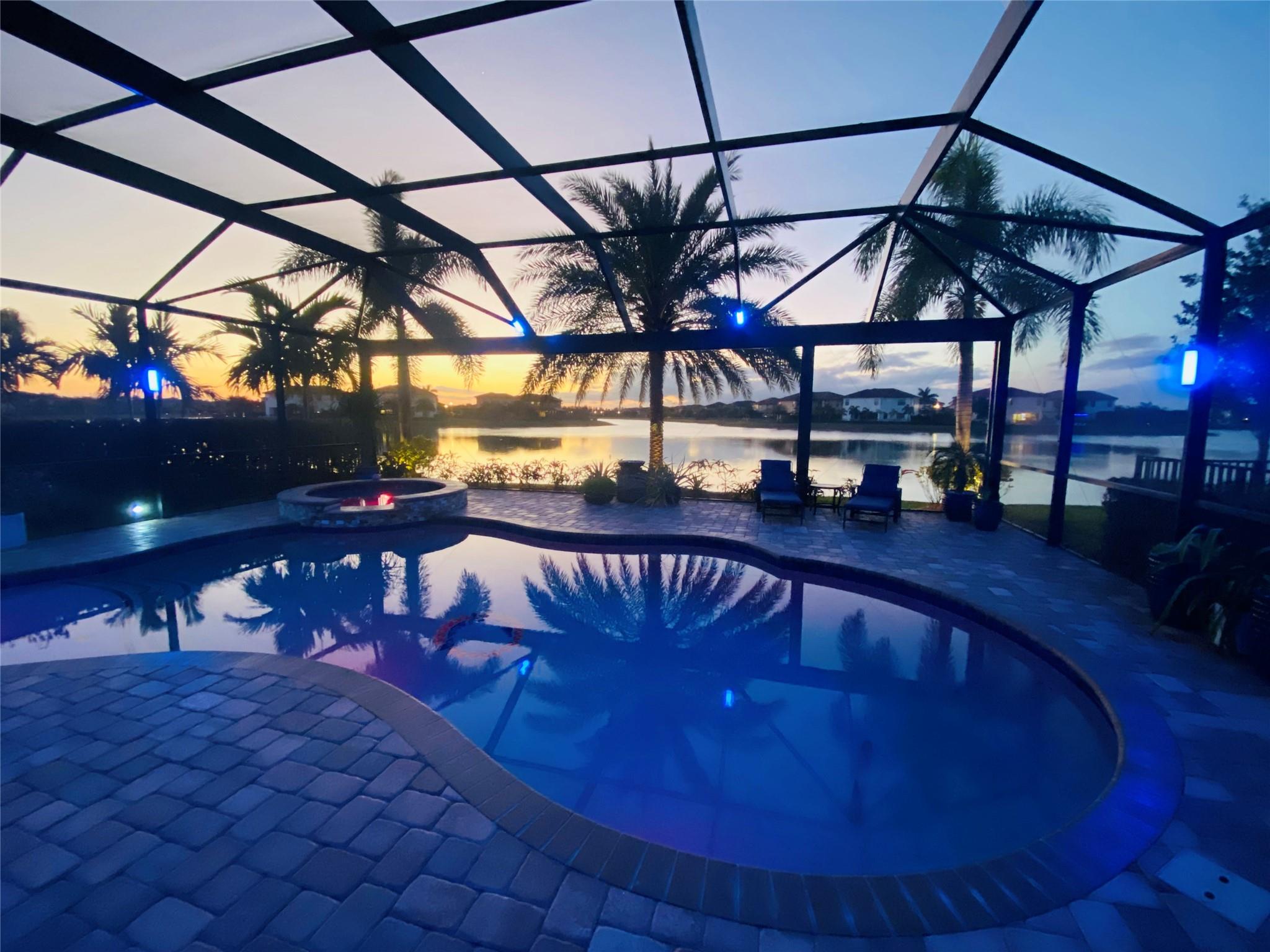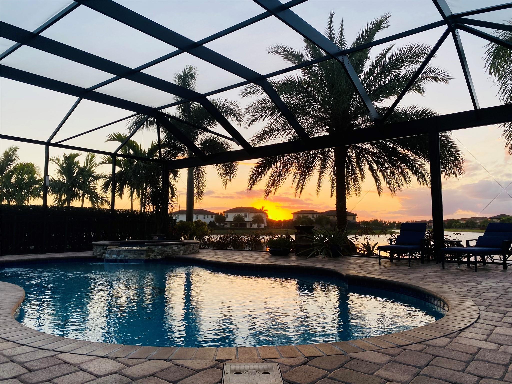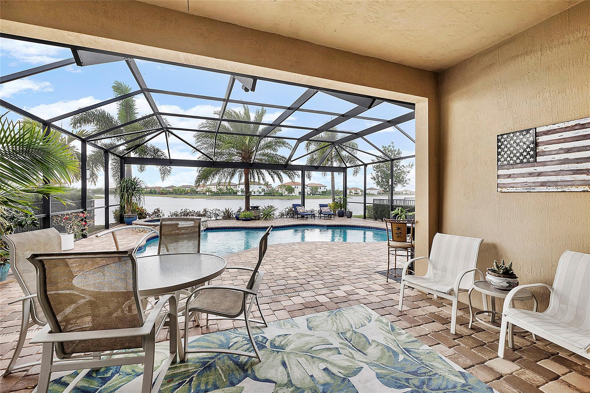 Stunning one story home nestled in the desirable community of Parkland Bay. This exquisite residence features a breathtaking saltwater heated pool & spa, perfectly positioned to capture gorgeous lakefront sunsets. Enjoy year round outdoor living in the screened patio with designer multi colored lighting, lush custom landscaping with up-lighting for resort style ambiance. Step inside to find elegant crown molding throughout, Kitchen with premium cabinetry & a beautiful backsplash. The primary suite offers a spacious custom walk-in-closet. Epoxy garage floors, Halo LED air purifier AC system. Enjoy resort style amenities including a clubhouse, pool, cabanas, entertainment pavilion, culinary kitchen, fitness center, kids club, tennis, basketball & pickleball courts & tot lot. A-rated schools.
