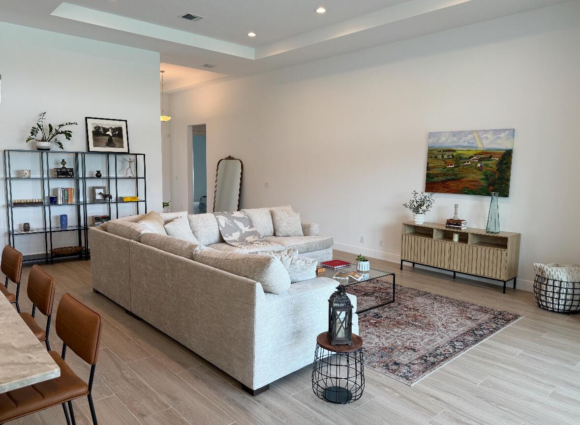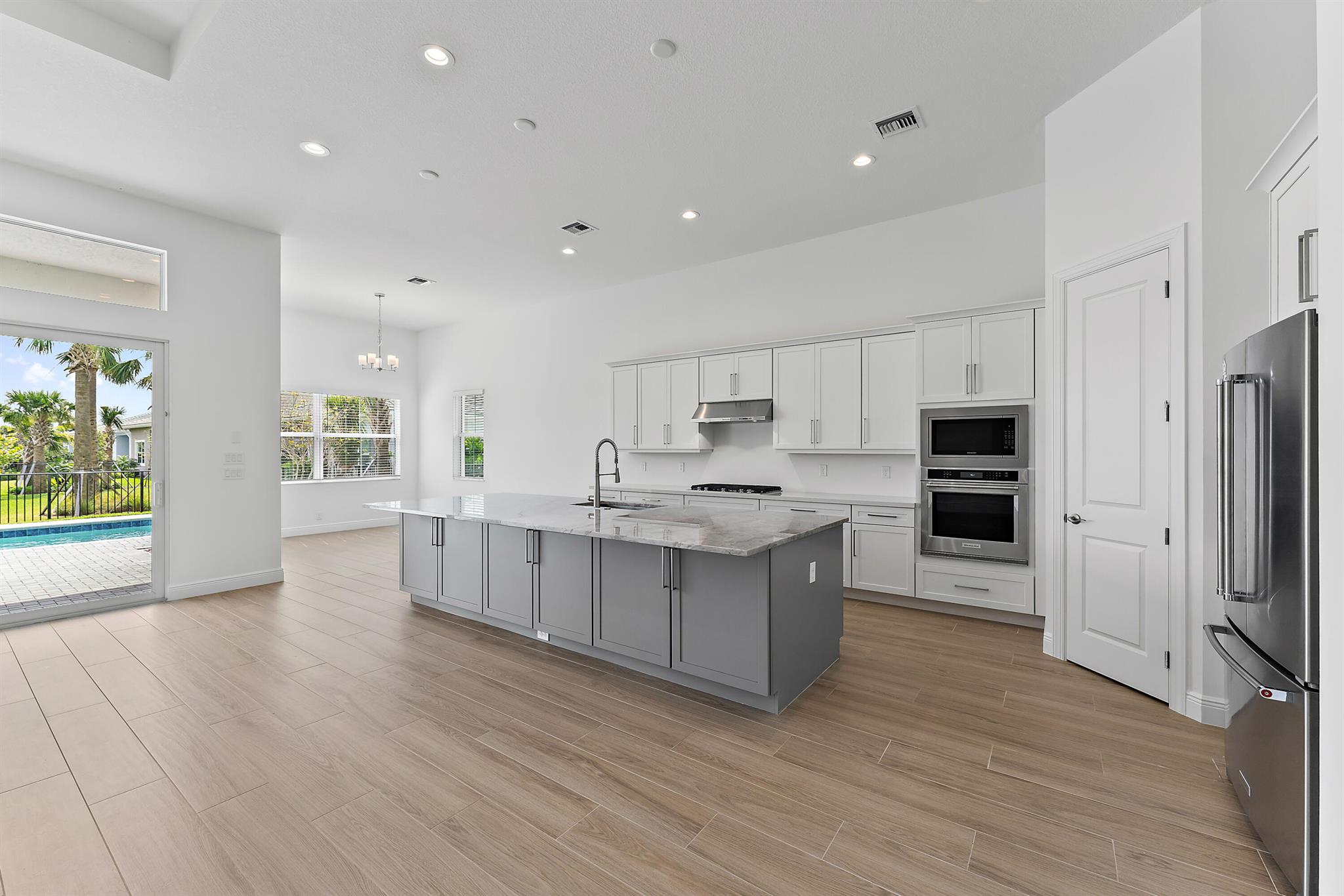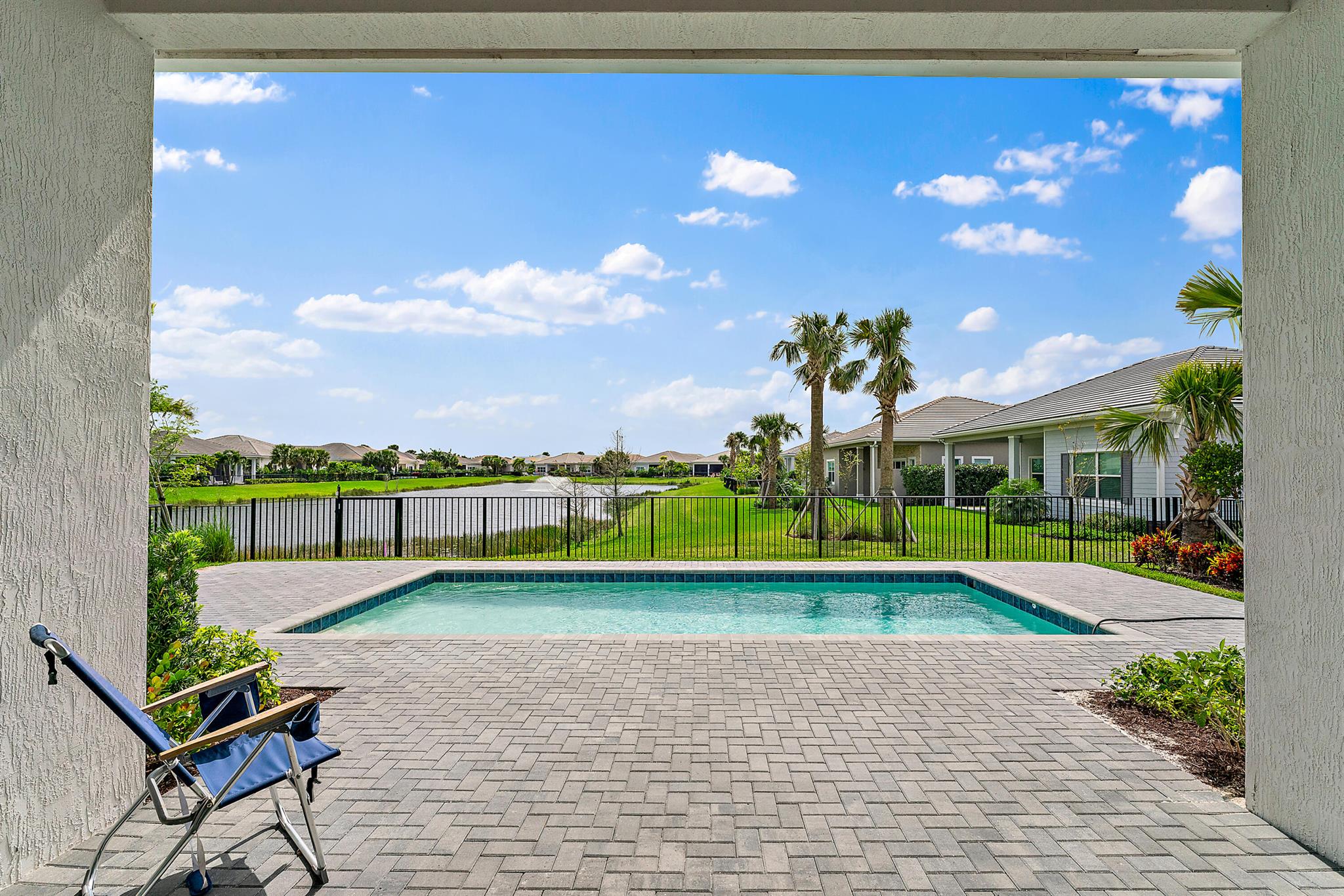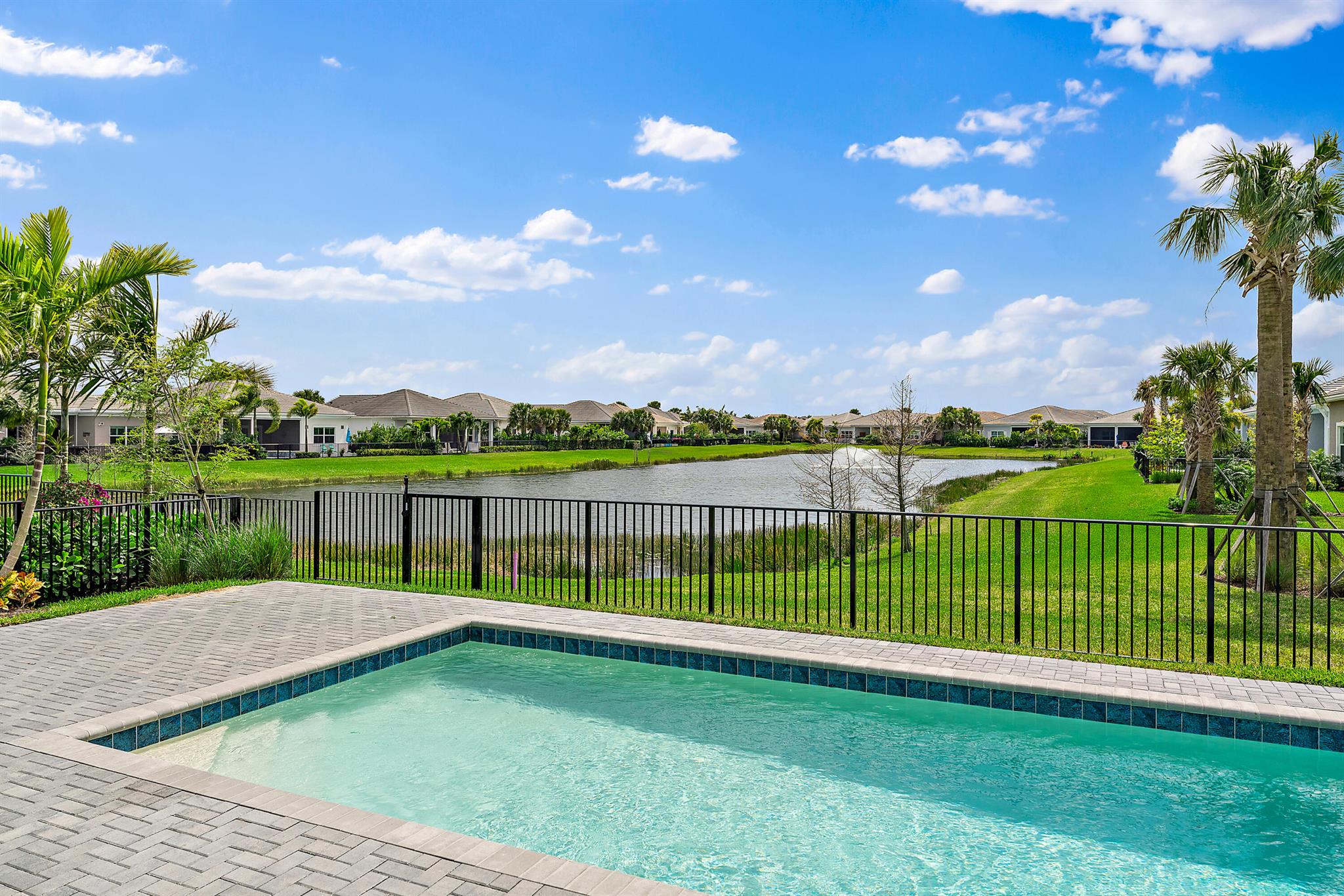 Welcome to this incredible opportunity to purchase a BRAND NEW HOME WITH OUT all the waiting time for a new build. Move in ready and NEVER LIVED IN 4 bedroom 3 full bath sitting on beautiful lot with BREATHTAKING long Lake views in the exclusive community of REGENCY AT AVENIR. GATED 55 plus neighborhood with an incredible private clubhouse offering a lifestyle dreams are made of. Resort style amenities including golf simulator, fitness center, pickle ball, tennis, firepit, card rooms, and art room all in a tropical resort setting. The Salerno model offers an open floor plan featuring a gorgeous kitchen with huge center island, dining nook, beautiful primary suite, inviting foyer and side load garage. Custom pool and patio overlooking lake with long unobstructed view