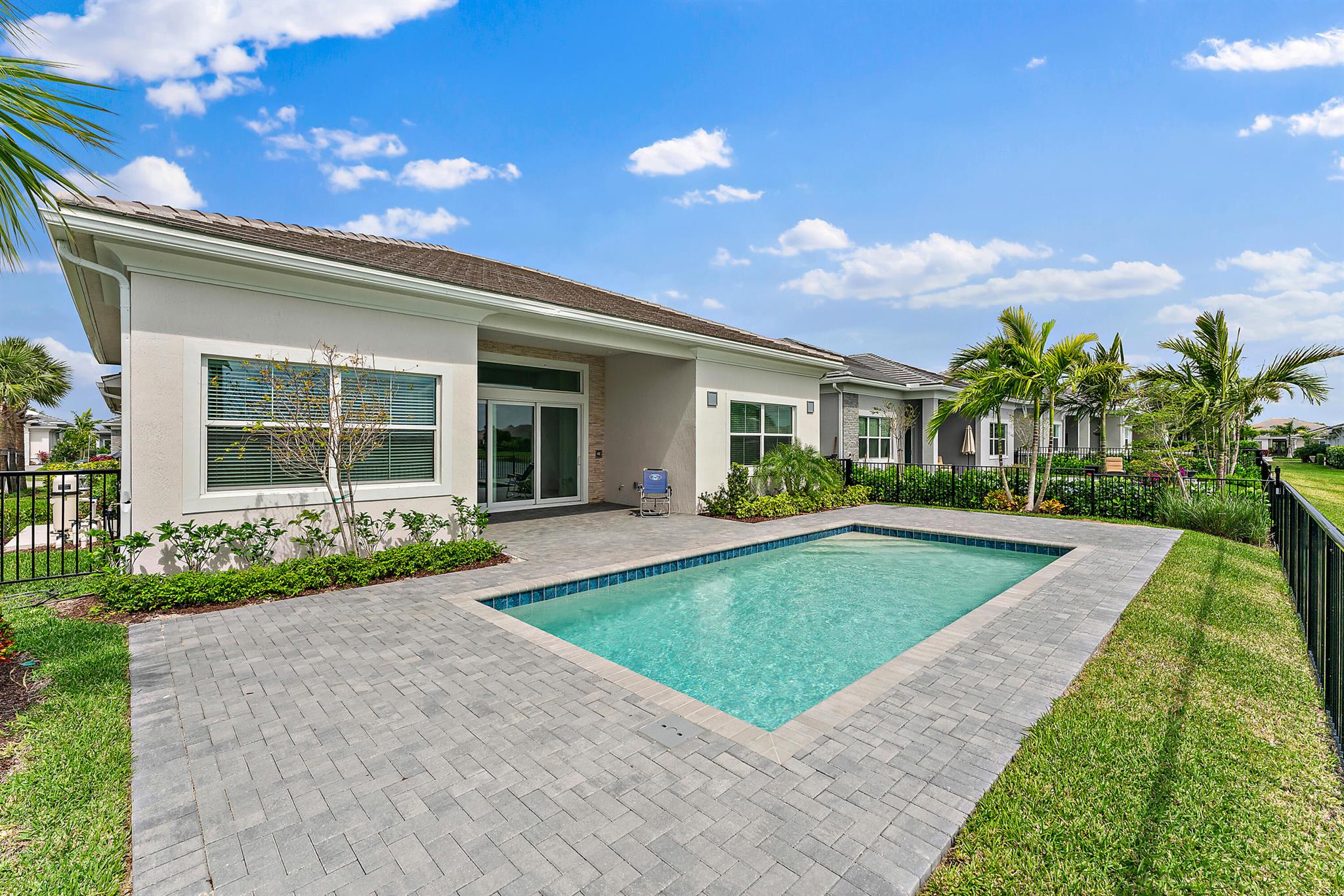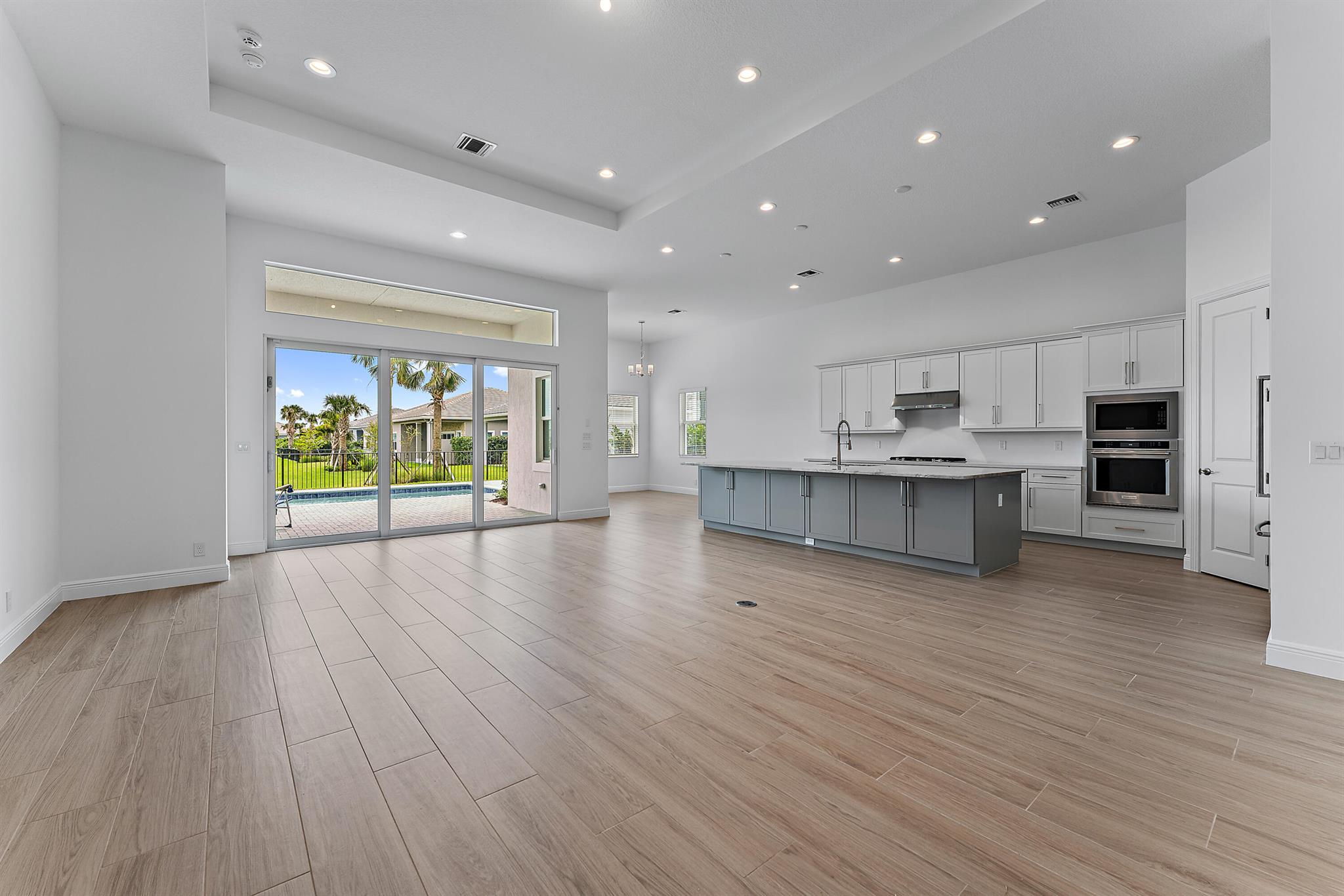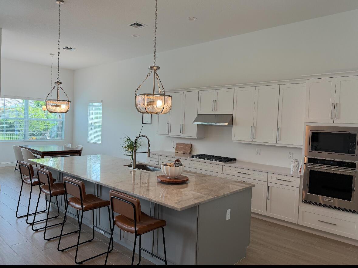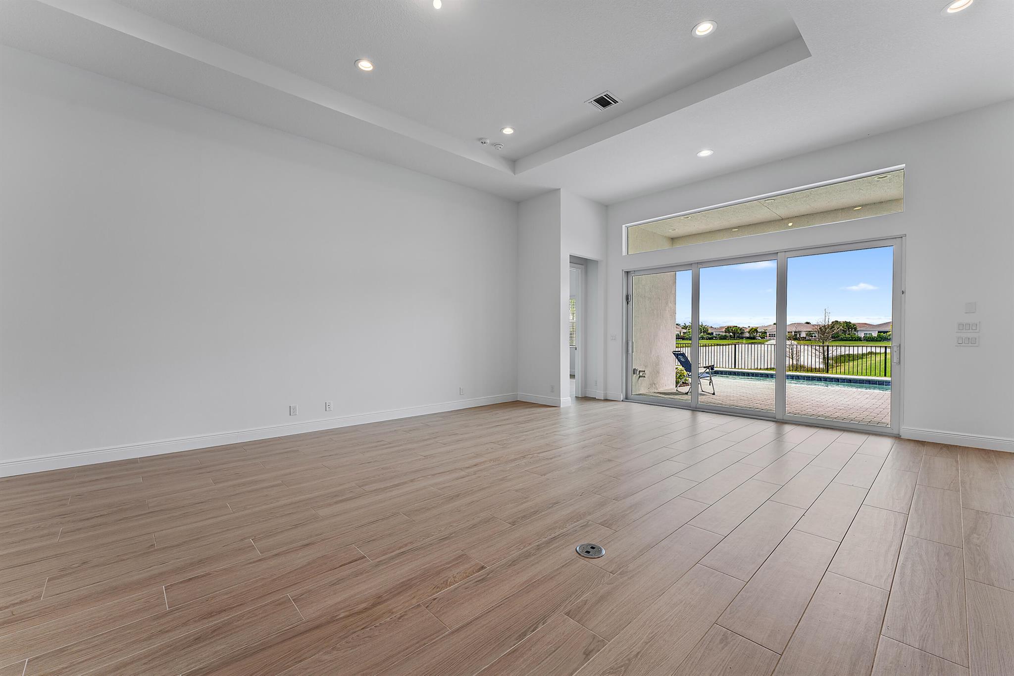 Welcome to this incredible opportunity to purchase a BRAND NEW HOME WITH OUT all the waiting time for a new build. Move in ready and NEVER LIVED IN 4 bedroom 3 full bath sitting on beautiful lot with BREATHTAKING long Lake views in the exclusive community of REGENCY AT AVENIR. GATED 55 plus neighborhood with an incredible private clubhouse offering a lifestyle dreams are made of. Resort style amenities including golf simulator, fitness center, pickle ball, tennis, firepit, card rooms, and art room all in a tropical resort setting. The Salerno model offers an open floor plan featuring a gorgeous kitchen with huge center island, dining nook, beautiful primary suite, inviting foyer and side load garage. Custom pool and patio overlooking lake with long unobstructed view