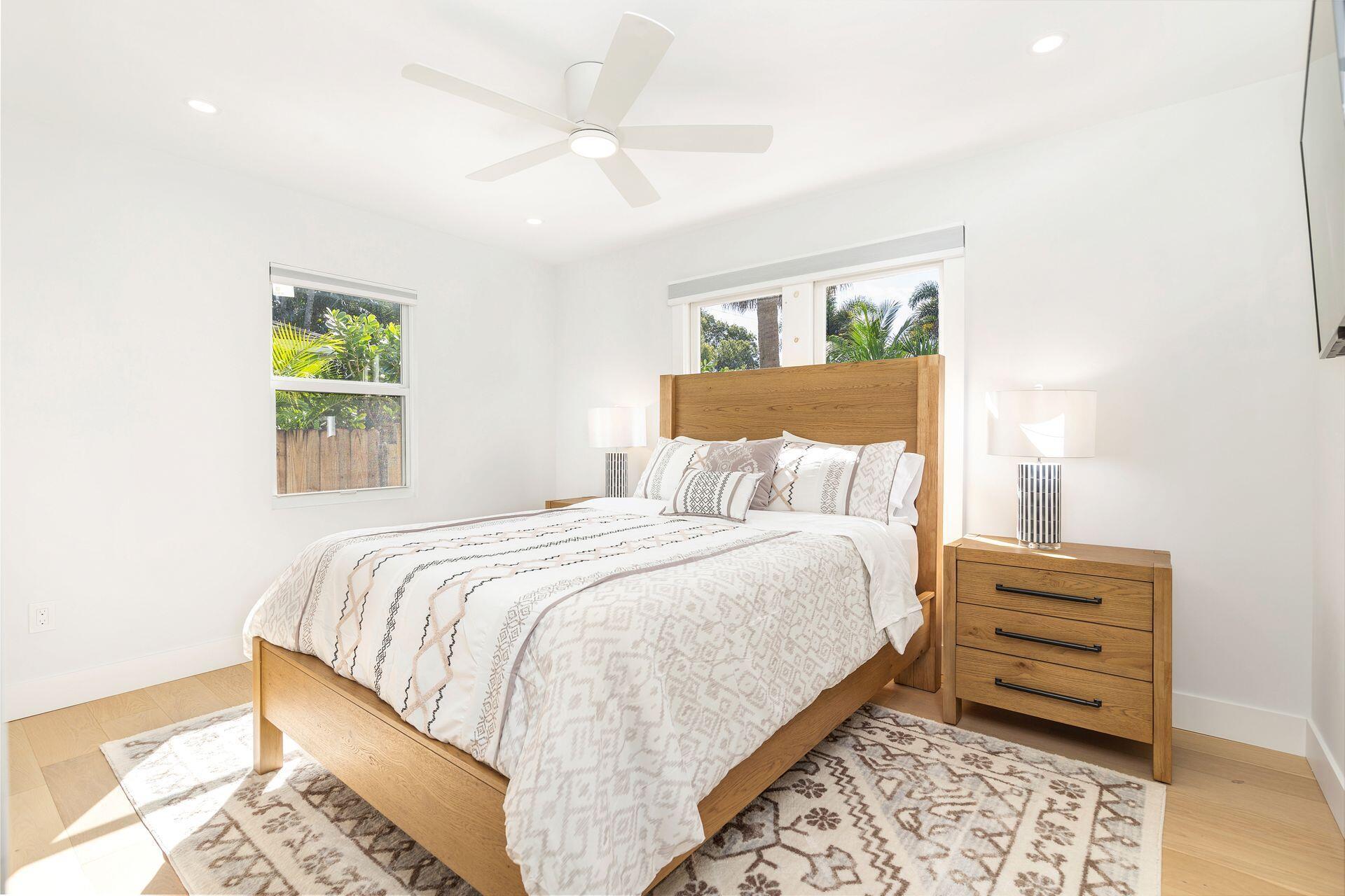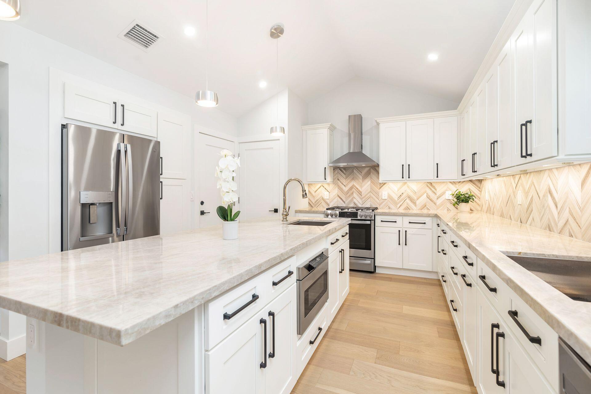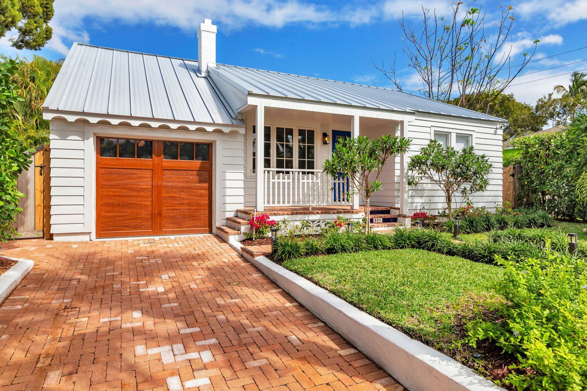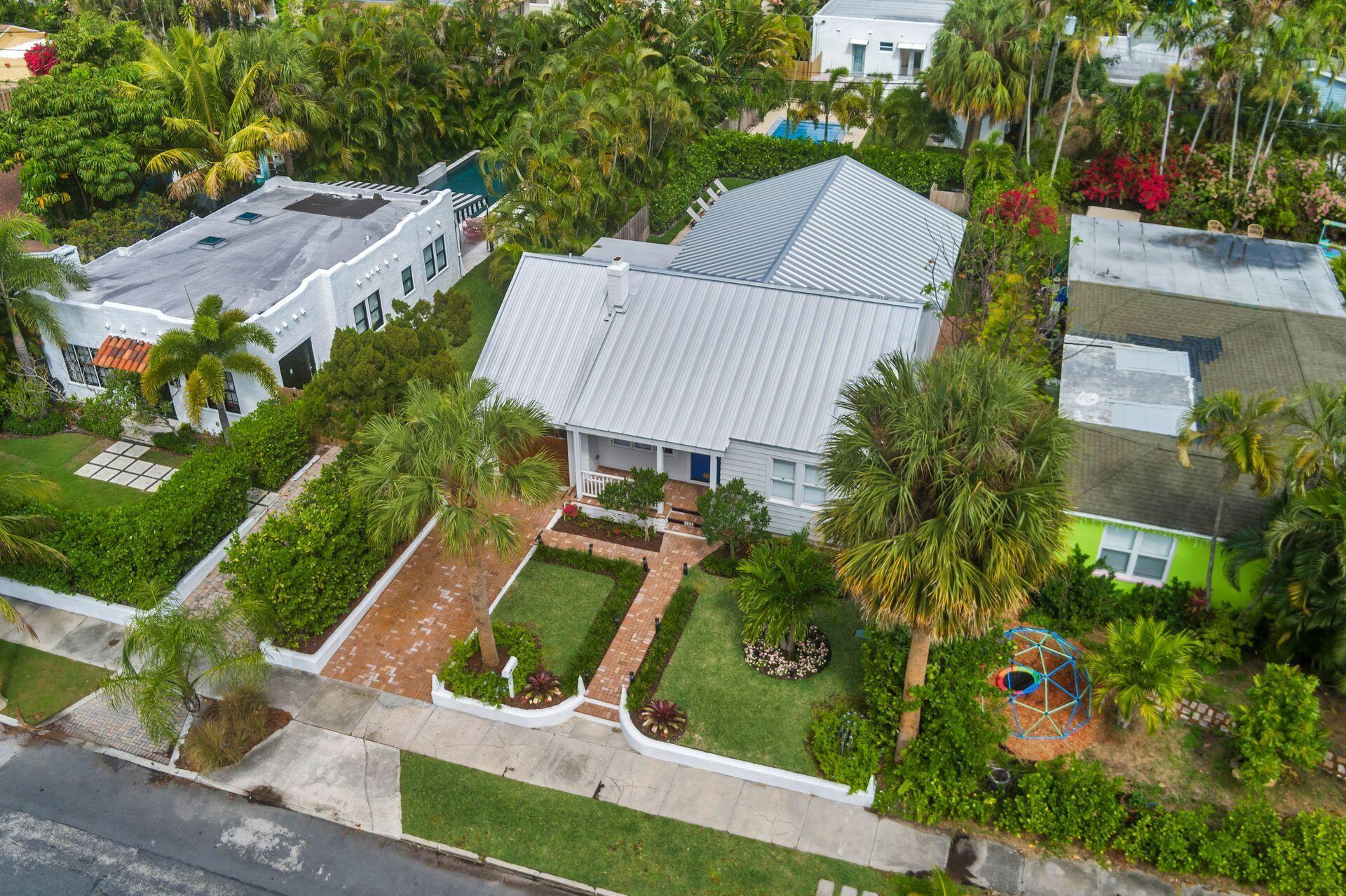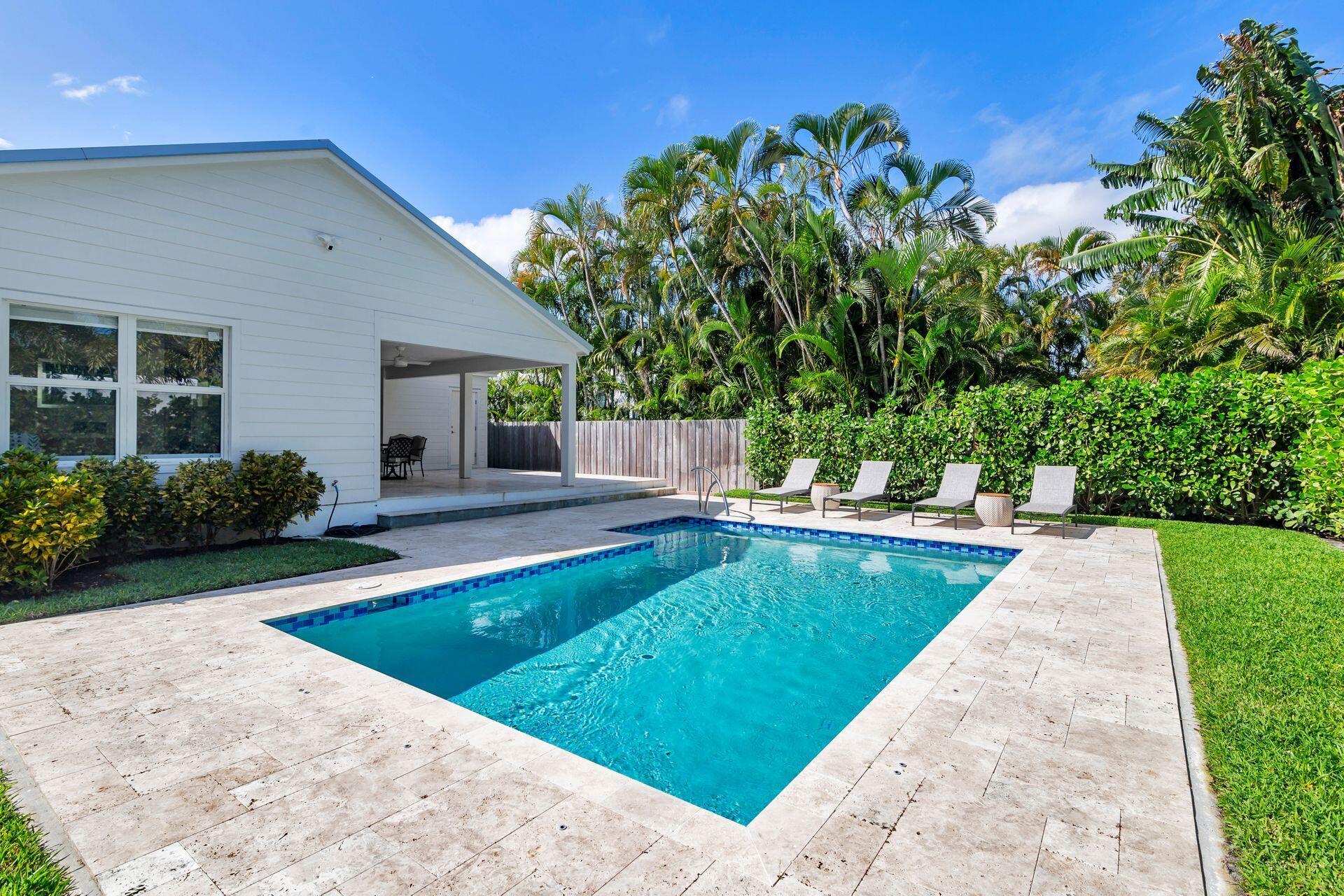True Florida Bungalow in the Heart of Historic Flamingo Park! Spectacularly renovated to combine modern amenities with 'Old Florida' charm. Situated on an elevated lot, a welcoming front porch opens to a light filled living room with original fireplace. Wide-plank floors throughout, impact windows and doors! Gorgeous kitchen with quartz counters, prep island with sink, abundant cabinetry, gas range & high vaulted ceilings extending over dining area. Large primary bedroom opens to porch. Bright bath, dual vanities & oversized shower. 2 guest bedrooms with en suite baths. Large covered porch with cabana bath, New pool surrounded by greenery for the utmost private outdoor experience. 1 car garage with pull down stairs to attic. Brick paver drive and walkways. Close to everything downtown WPB