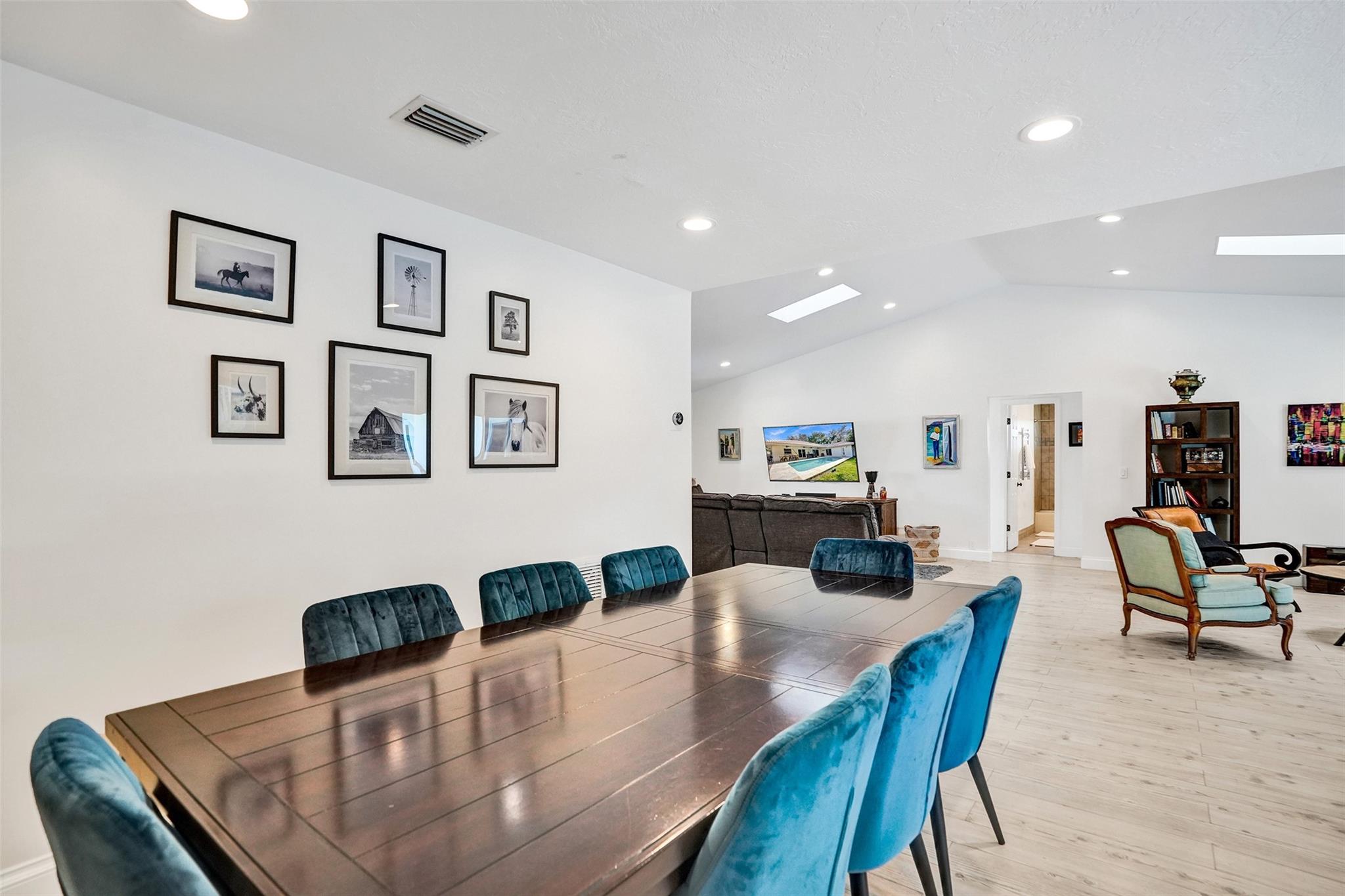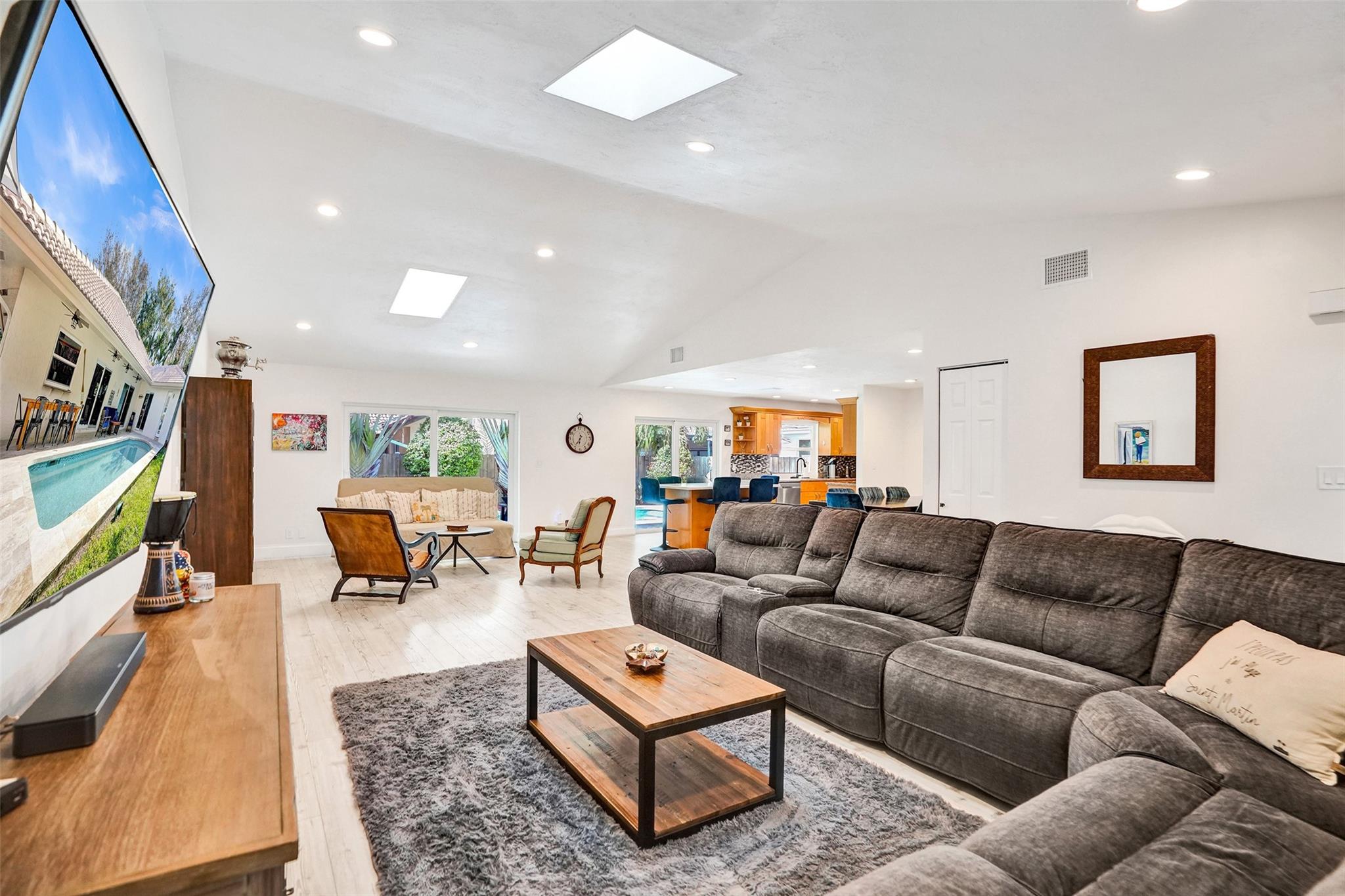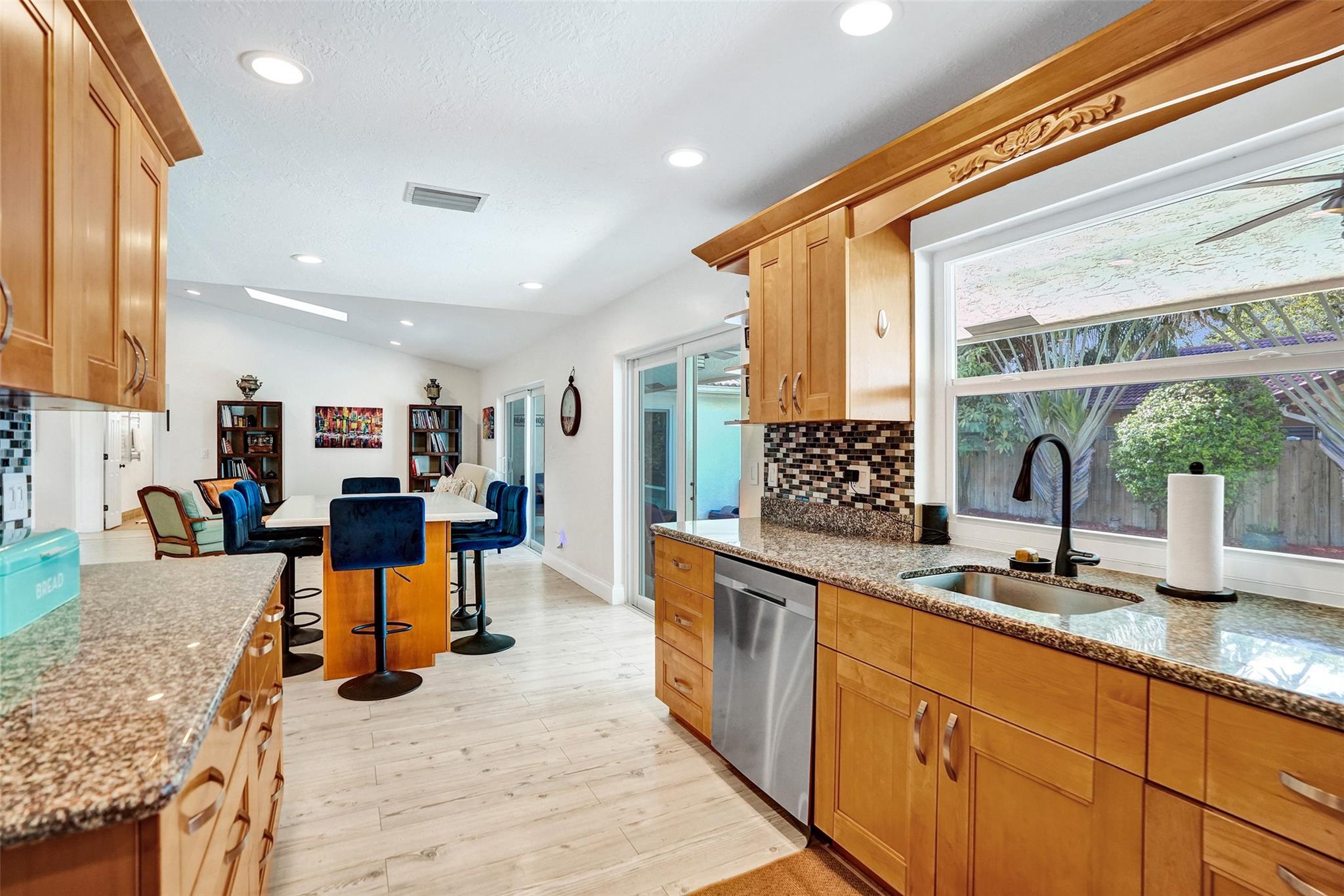 COMPLETELEY REMODELED HOME FEATURES A CONTEMPORARY OPEN FLOOR PLAN, SOARING CATHEDRAL CEILINGS WITH SKYLIGHTS, ALL HURRICANE IMPACT GLASS & BLEACHED WOOD LUXURY VINYL FLOORING THROUGHOUT. BEAUTIFULLY UPDATED KITCHEN W/GRANITE COUNTERTOPS, GLASS TILE BACKSPLASH, SS APPLIANCES & OVERSIZED MOVEABLE ISLAND. VERY LARGE PRIMARY BEDROOM & RENOVATED PRIMARY BATHROOM OPEN ONTO THE POOL AREA. ENJOY 3 SPACIOUS GUEST ROOMS (2 WITH WALK IN CLOSETS) & UPDATED GUEST BATHROOM WITH DOUBLE SINK OVERSIZED VANITY. THE EXQUISITE BACKYARD IS DESIGNED FOR ENTERTAINING W/HUGE COVERED LANAI, GORGEOUS SALTWATER POOL & LUSH TROPICAL LANDSCAPING. NEWER A/C, AIR DUCTS, WATER HEATER, POOL HEATER & MORE. THIS IMMACULATE, SUNFILLED HOME OFFERS CAREFREE LIVING IN A WELL-ESTABLISHED NEIGHBORHOOD WITH VERY LOW HOA FEES.