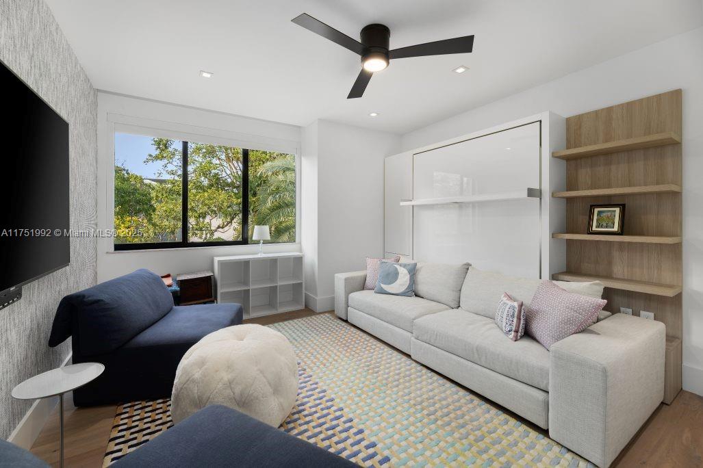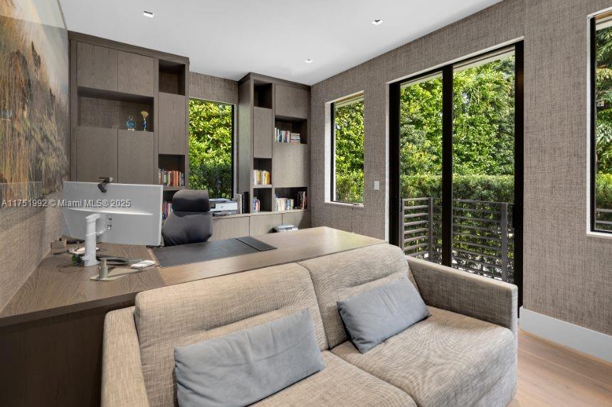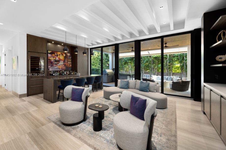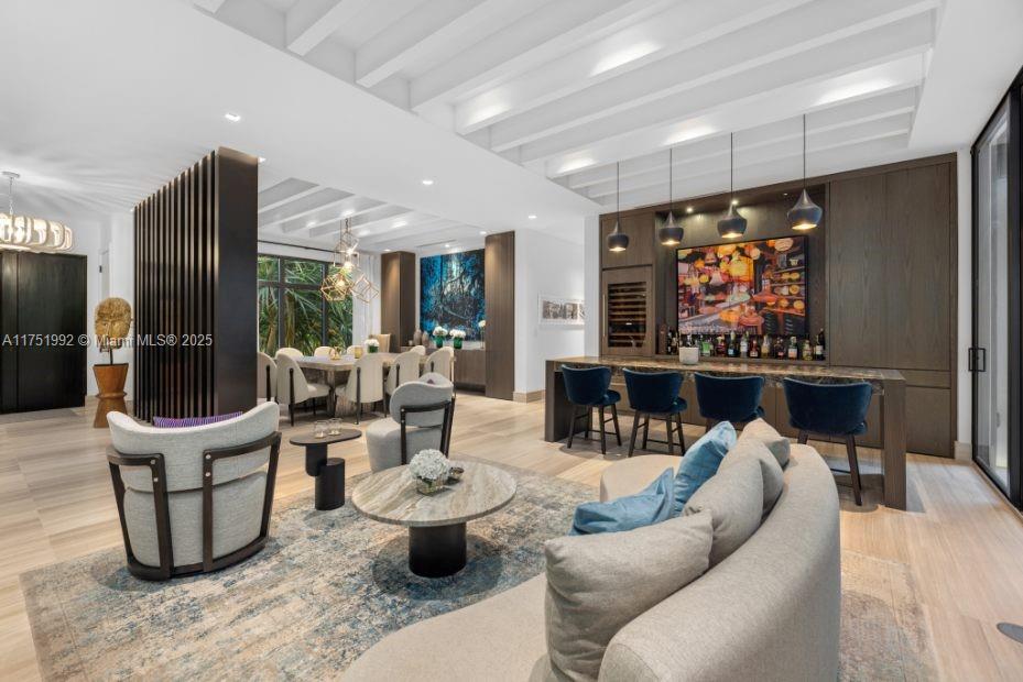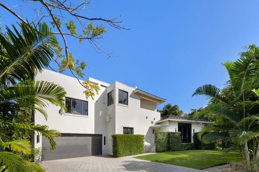 Contemporary residence on exclusive Sunset Island II blends modern elegance with tropical sophistication. This exquisitely furnished turn-key home w/ 7 beds+ media room+ office/ 6.5 baths is situated on an expansive & lushly landscaped 12,500 corner lot. Slide open oversized glass doors and entertain out on your covered outdoor living room with full outdoor kitchen. This private oasis w/elegant upgrades throughout boasts soaring ceilings, wide plank oak & natural stone flooring, luxurious bar & cocktail area & open chef’s kitchen w/ eat in area overlooking the sparkling 70 ft heated lap pool. Designed for ultimate relaxation, the spacious master suite features boutique style walk-in closet & marble/wood spa-like bathroom, completely renovated in 2023.