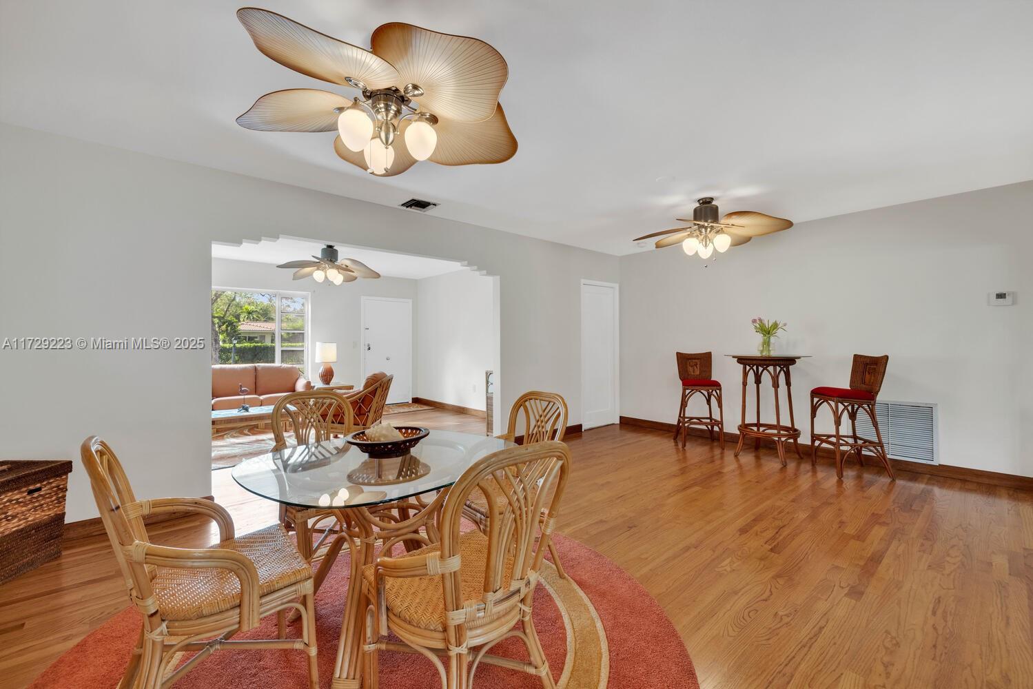 Welcome Home! Wow...what a great place to entertain! Be ready for everyone to come to your house! Big spacious rooms opening one into another times 4! Move right in and 'make it your own' along the way! The kitchen is spacious, white and bright with lots of storage. The garage is clean as a whistle and extends to a covered carport and continued with a long back driveway.....have a need for lots of parking or cars? This is a good choice! The wood floors are gleaming and the family room also leads into a HUGE terrazzo floor screened in patio - a good place to play and relax in any weather. Room for a swimming pool. Primary bedroom has a bathroom ensuite. Located in a special area of Miami Shores with quiet, cul-de-sac streets. Easy to see.