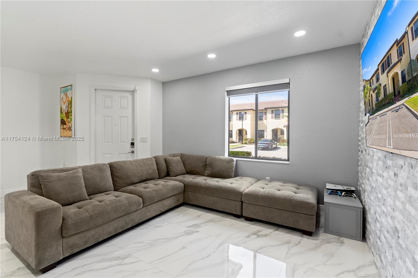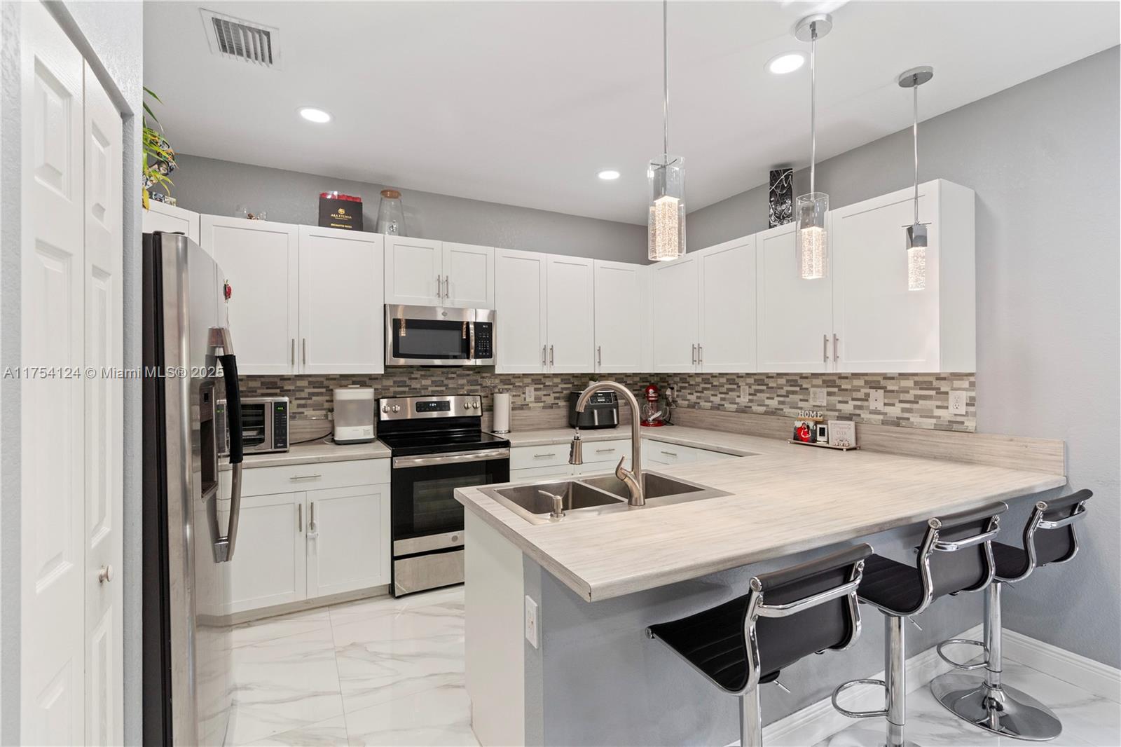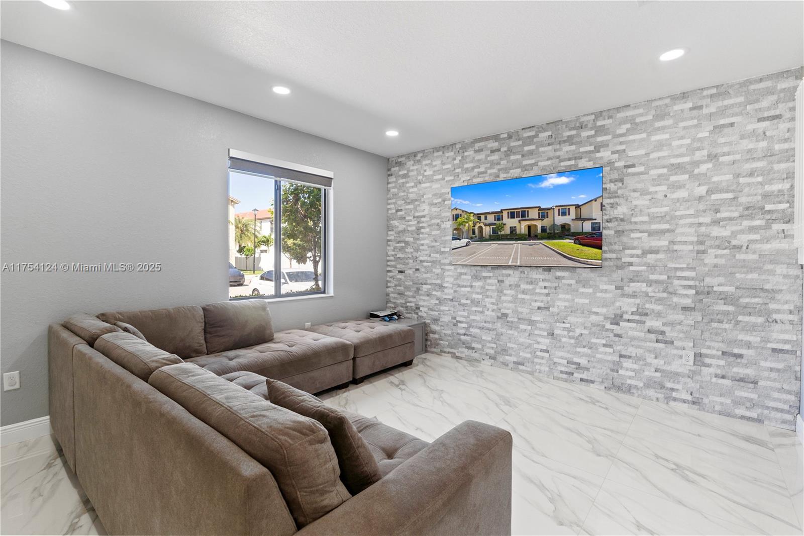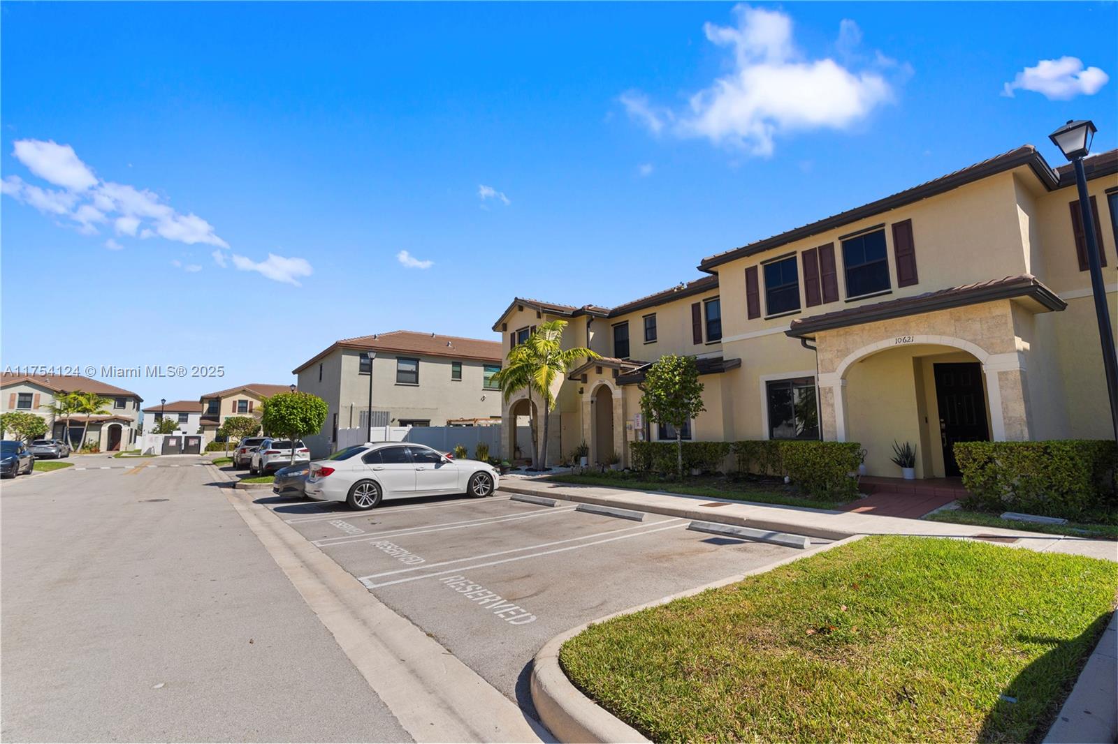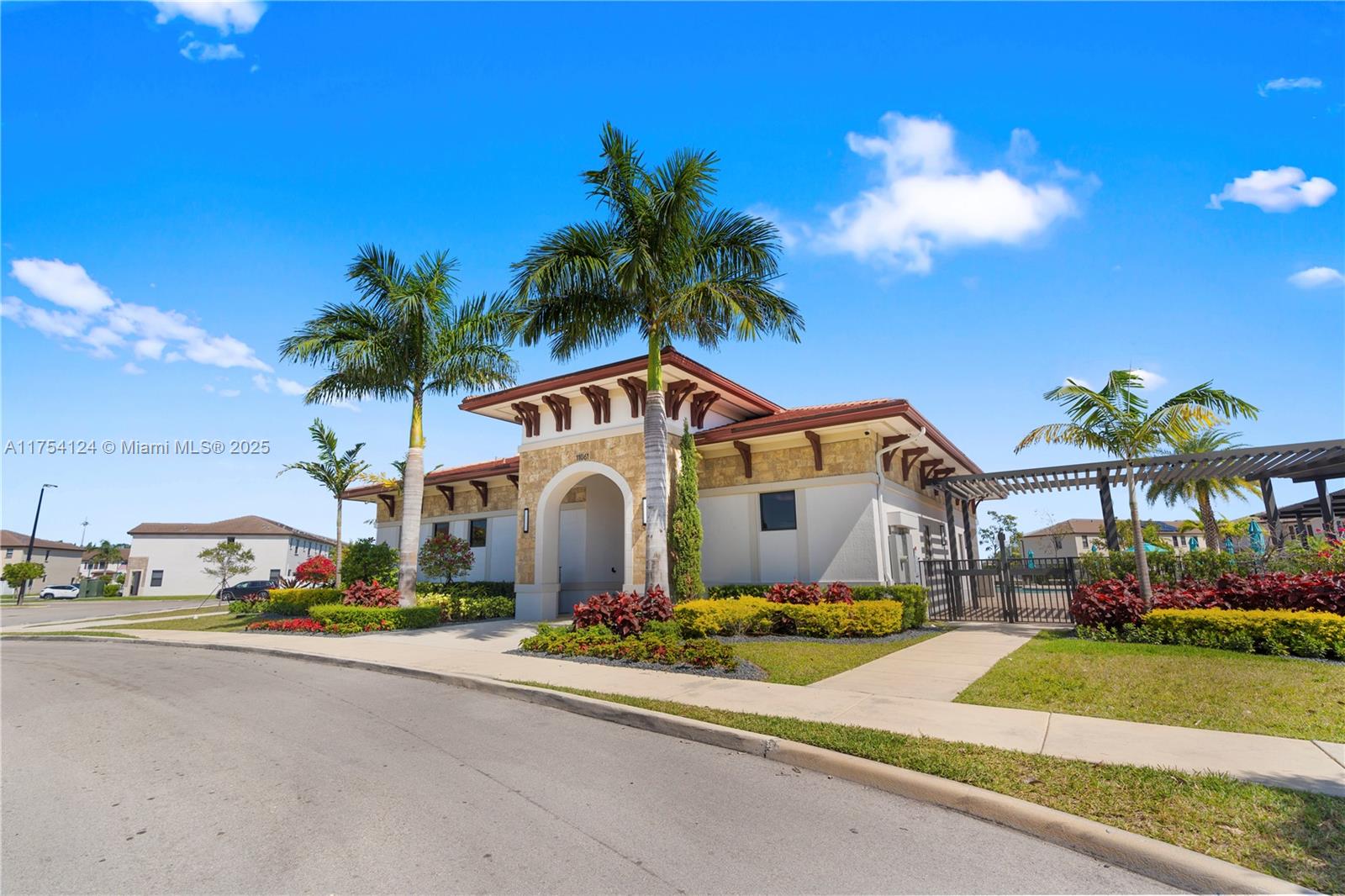 This is the ONE!! Come fall in love with this STUNNING turn key townhome in the beautiful Resort Style community of Aquabella in Hialeah Gardens. As you enter , you can't help but notice the HUGE 32 inch MARBLE FLOORS that flow through the entire downstairs. Fresh paint and newer fixtures Impact windows and doors on first floor. The kitchen has been updated and this unit has 2 family room areas and separate dining. The patio has an extended Aluminum roof that is impact resistant for extra entertaining space and lovely pavers too. Going upstairs you will notice the modern floors in all bedroom. The bathroom are gorgeous with marble floors, Glass enclosed showers and updated vanities. Blackout shading on all windows too! The Ac has a UV light for cleaner air! Come see this Beauty TODAY