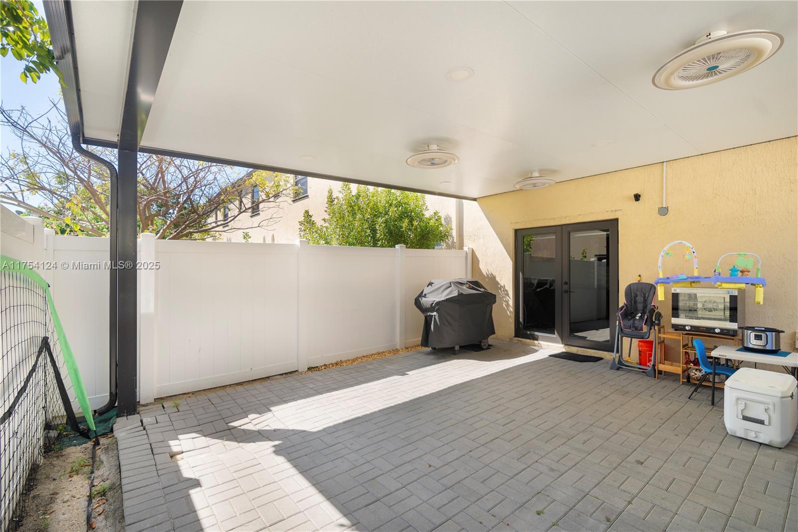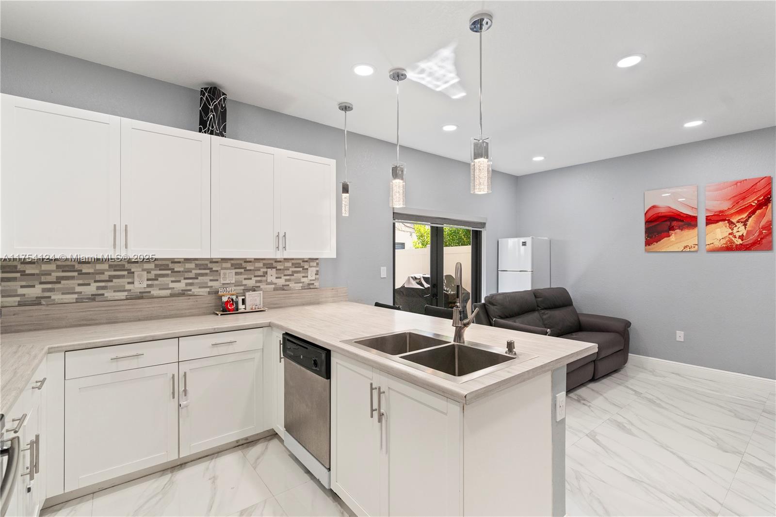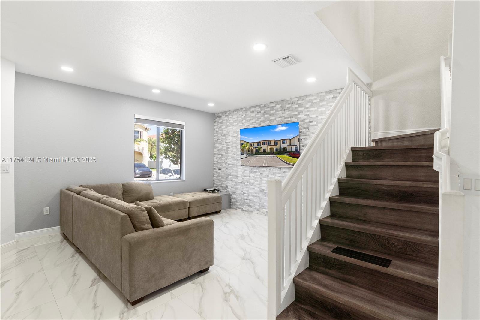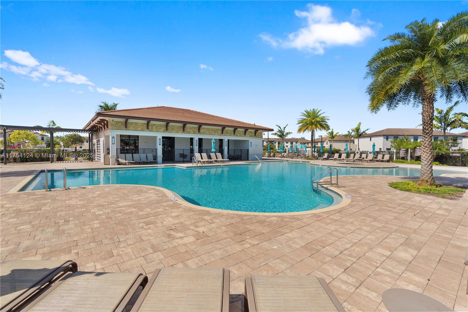 This is the ONE!! Come fall in love with this STUNNING turn key townhome in the beautiful Resort Style community of Aquabella in Hialeah Gardens. As you enter , you can't help but notice the HUGE 32 inch MARBLE FLOORS that flow through the entire downstairs. Fresh paint and newer fixtures Impact windows and doors on first floor. The kitchen has been updated and this unit has 2 family room areas and separate dining. The patio has an extended Aluminum roof that is impact resistant for extra entertaining space and lovely pavers too. Going upstairs you will notice the modern floors in all bedroom. The bathroom are gorgeous with marble floors, Glass enclosed showers and updated vanities. Blackout shading on all windows too! The Ac has a UV light for cleaner air! Come see this Beauty TODAY