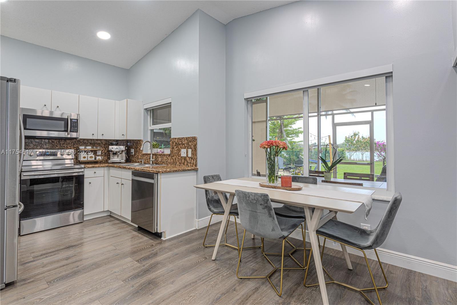 Lakefront gem in the sought-after gated community of Chapel Trail! This 3-bedroom, 2-bath home with a 2-car garage offers breathtaking lake and sunset views from the huge backyard, complete with a fireplace near the water—perfect for entertaining or relaxing. The vaulted, screened back patio features a jacuzzi, creating your own private retreat. Inside, enjoy laminate flooring throughout, impact windows and doors, and a new roof (2023). The renovated bathrooms (2022) and stainless-steel Samsung appliances add modern appeal. Additional upgrades include a new irrigation system (2024), a new insulated garage door (2024), and an air-conditioned garage (2024).This home is in a top-rate school.zone with low HOA fees. Walking distance to the community pool, tennis & basketball at Rose Price Park.