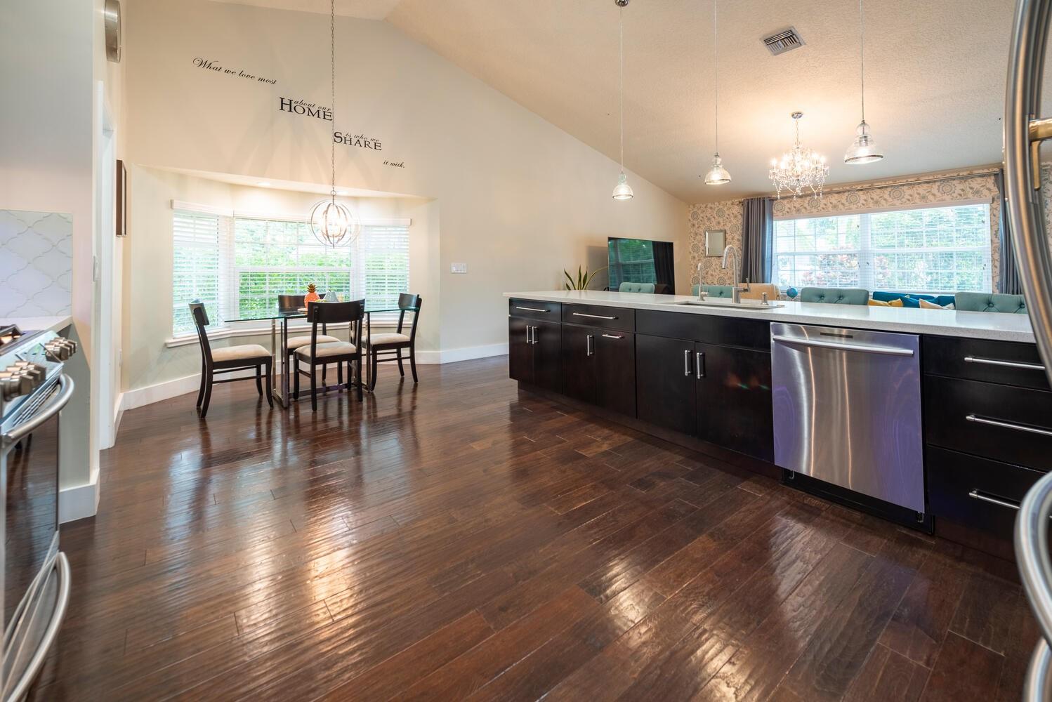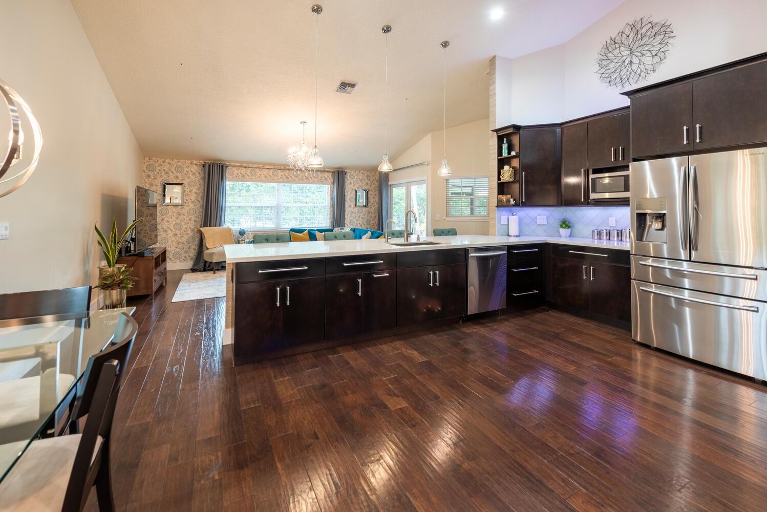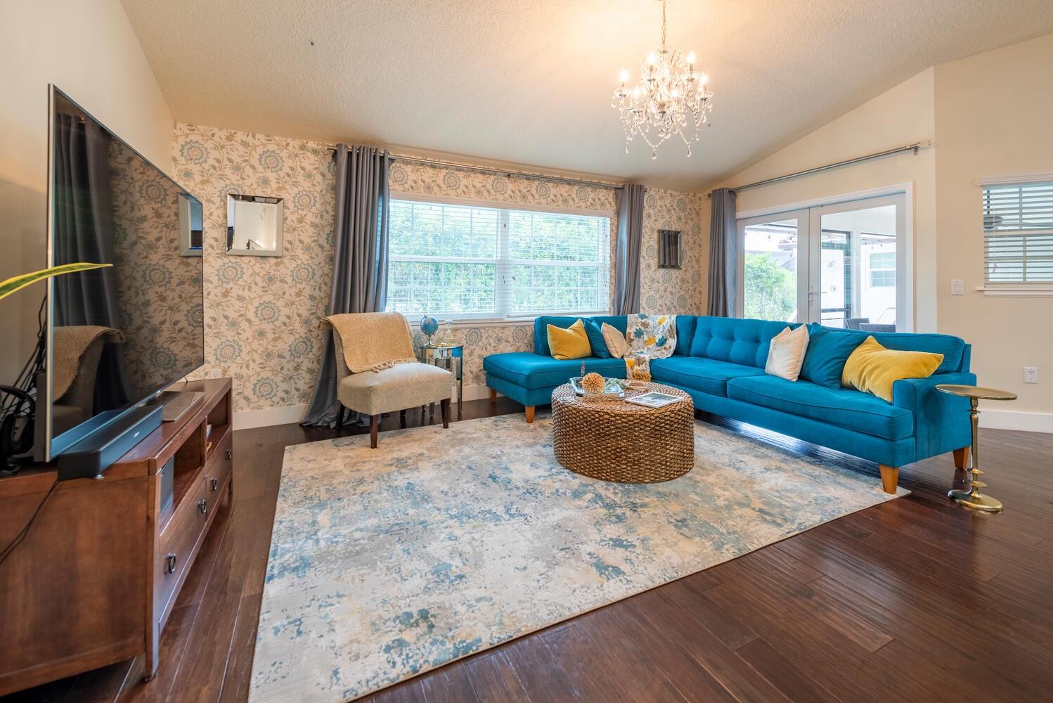 Nestled on a quiet dead-end street in N Plantation Acres, this stunning 3,701 sq. ft. home offers four bedrooms, 2 1/2 baths, plus a separate in-law quarter w/ its own entrance. The private apt features a spacious bedrm, walk-in closet, living rm, and a full kitchen—perfect for guests or rental. Inside, high ceilings complement the open plan, while the beautifully remodeled kitchen boasts a gas cooktop. The owner’s suite includes custom built-in closets, and wood floors run throughout the home. Modern upgrades include impact windows&doors , a reverse osmosis filtration and water softener system, a tankless water heater and a gas dryer. Situated on a fully fenced half-acre lot, the property is shaded by grand oak trees and features a heated, saltwater pool. A she-shed w AC adds versatility.