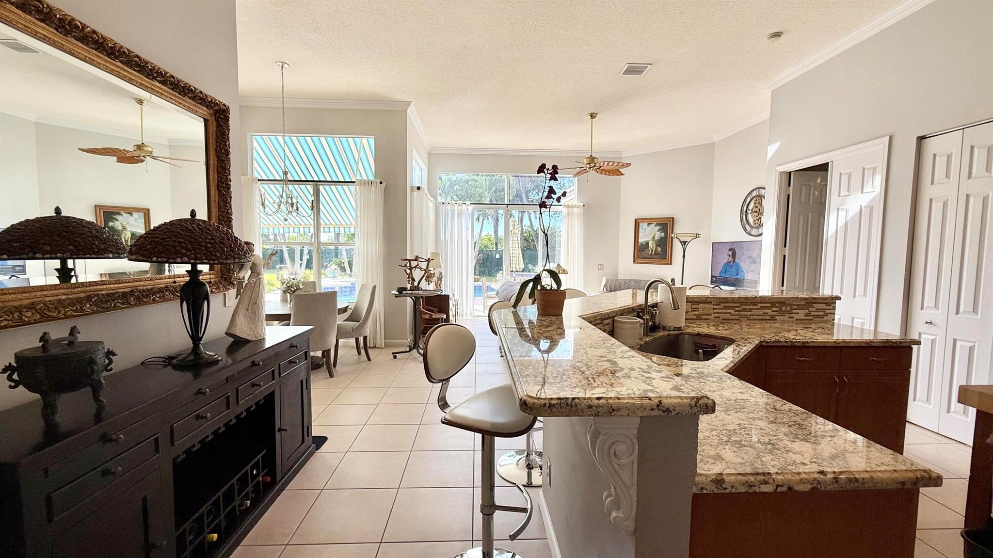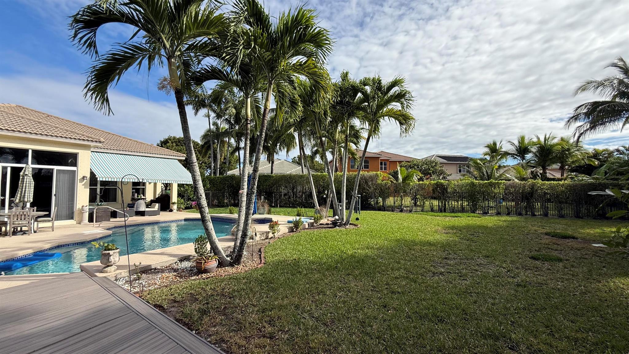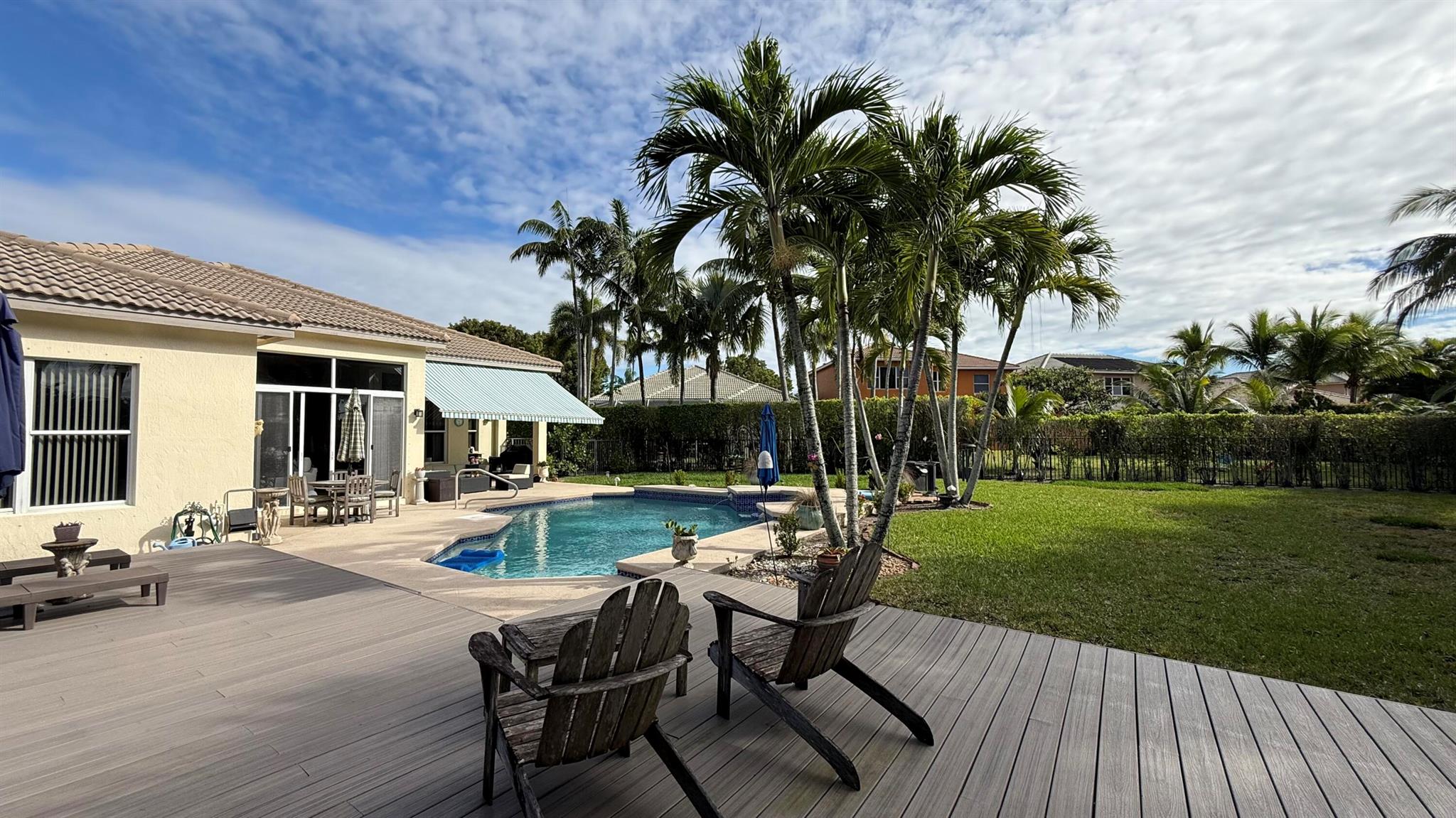 Wow!!! What a magnificent property! This spacious home boasts an amazing backyard retreat that looks like a high end resort pool area! The Freeform heated pool has a ''seating'' area, perfect for pool parties and fun games! There is an area of ''all weather'' decking surrounding the pool for lounging and sunning, plus a covered space with a retractable awning. Inside is just as appealing... as you enter the large foyer you will immediately be impressed by the 12 ft ceilings and how the floor plan flows from living, dining and on to the large open kitchen and family area. The 4th bedroom has been converted to an elegant office/den with custom built ins. The two guest bedrooms share a bathroom and the principal bedroom is a generous size with tray ceilings, an enormous closet and