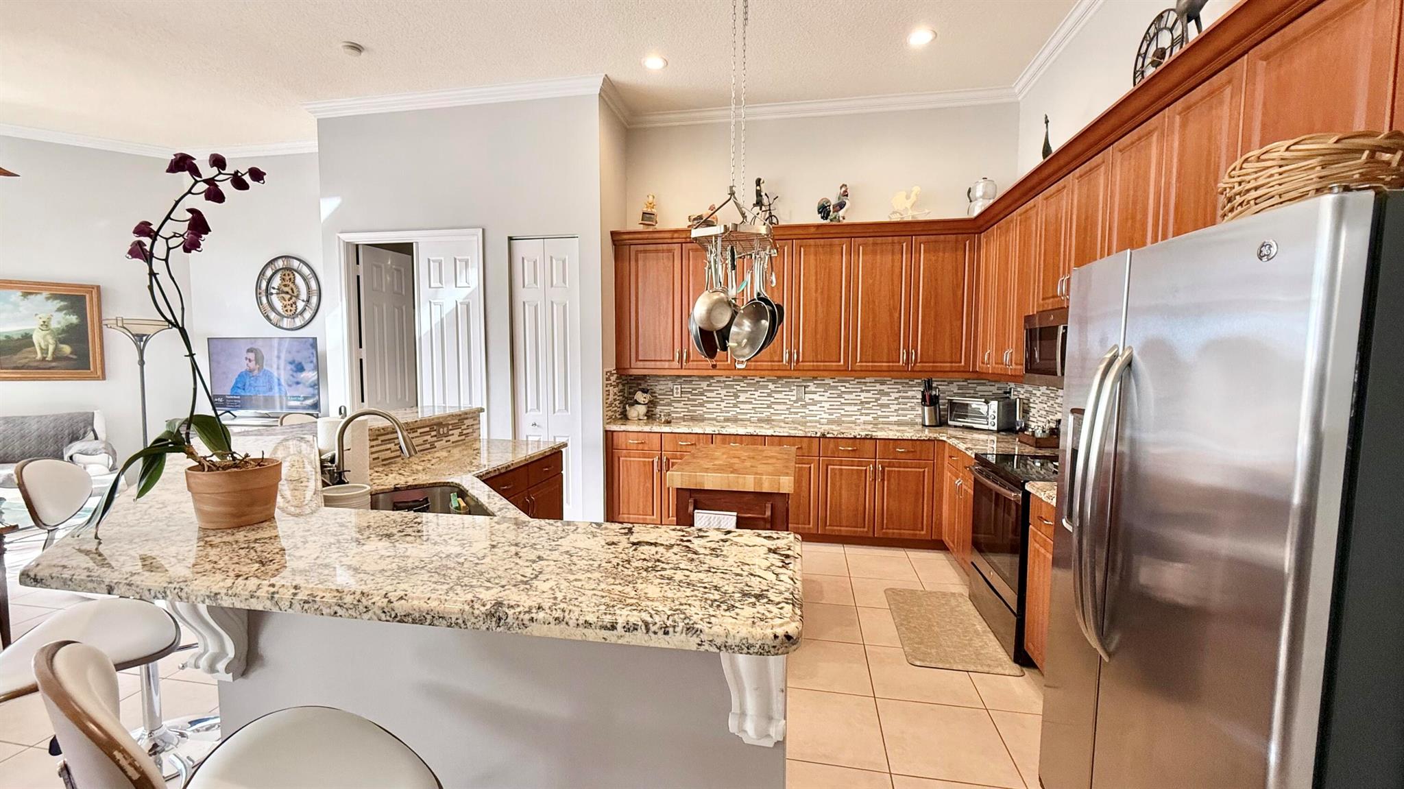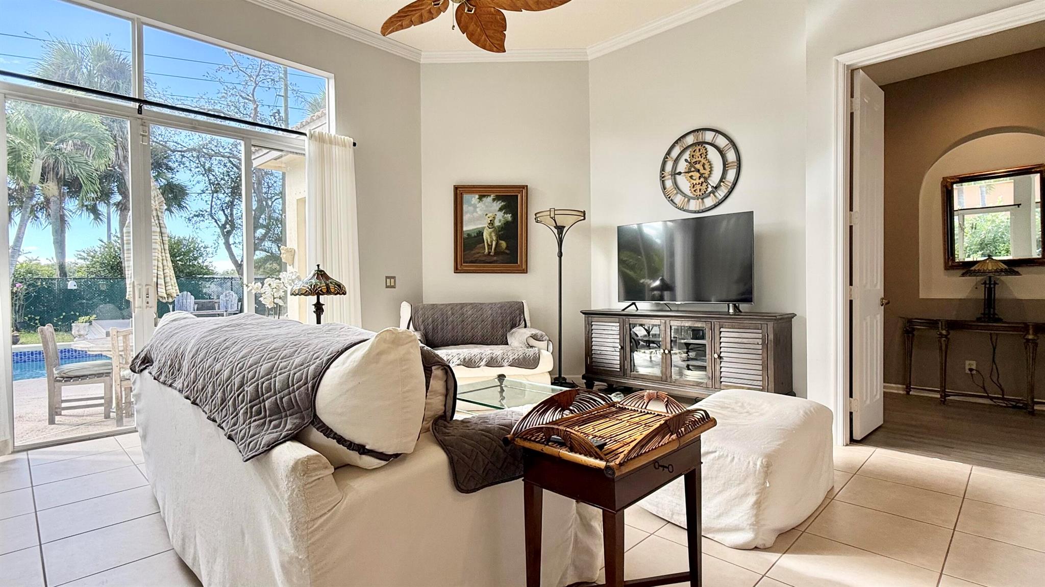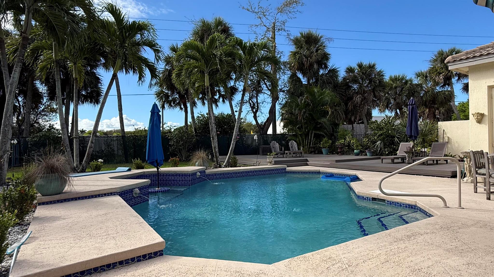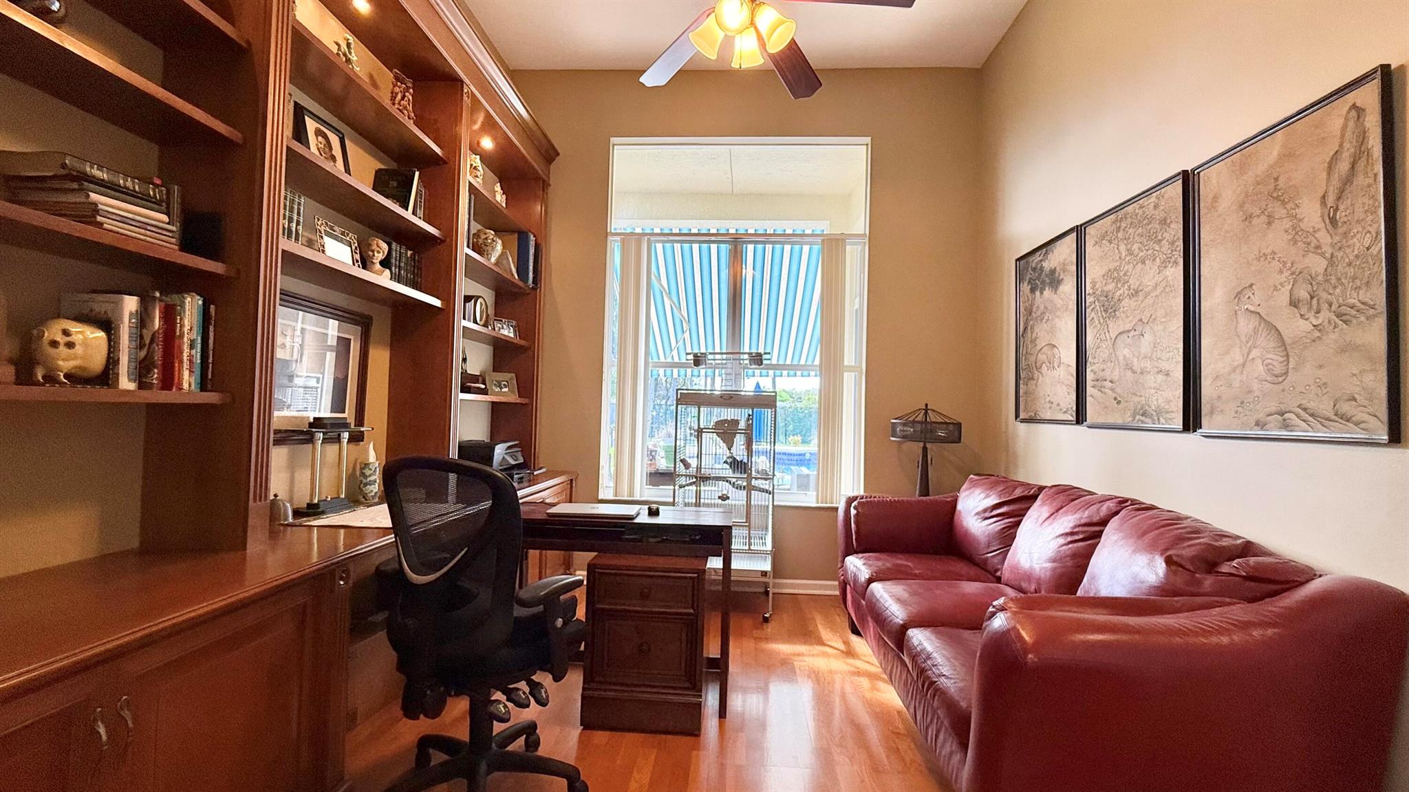 Wow!!! What a magnificent property! This spacious home boasts an amazing backyard retreat that looks like a high end resort pool area! The Freeform heated pool has a ''seating'' area, perfect for pool parties and fun games! There is an area of ''all weather'' decking surrounding the pool for lounging and sunning, plus a covered space with a retractable awning. Inside is just as appealing... as you enter the large foyer you will immediately be impressed by the 12 ft ceilings and how the floor plan flows from living, dining and on to the large open kitchen and family area. The 4th bedroom has been converted to an elegant office/den with custom built ins. The two guest bedrooms share a bathroom and the principal bedroom is a generous size with tray ceilings, an enormous closet and