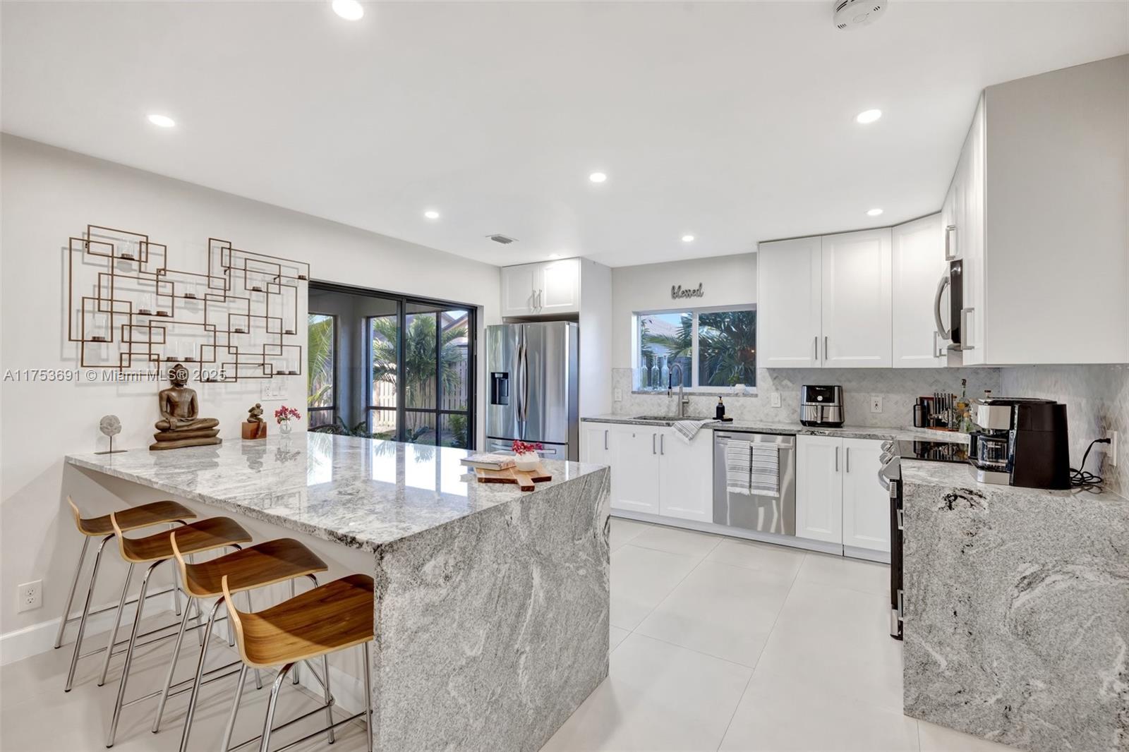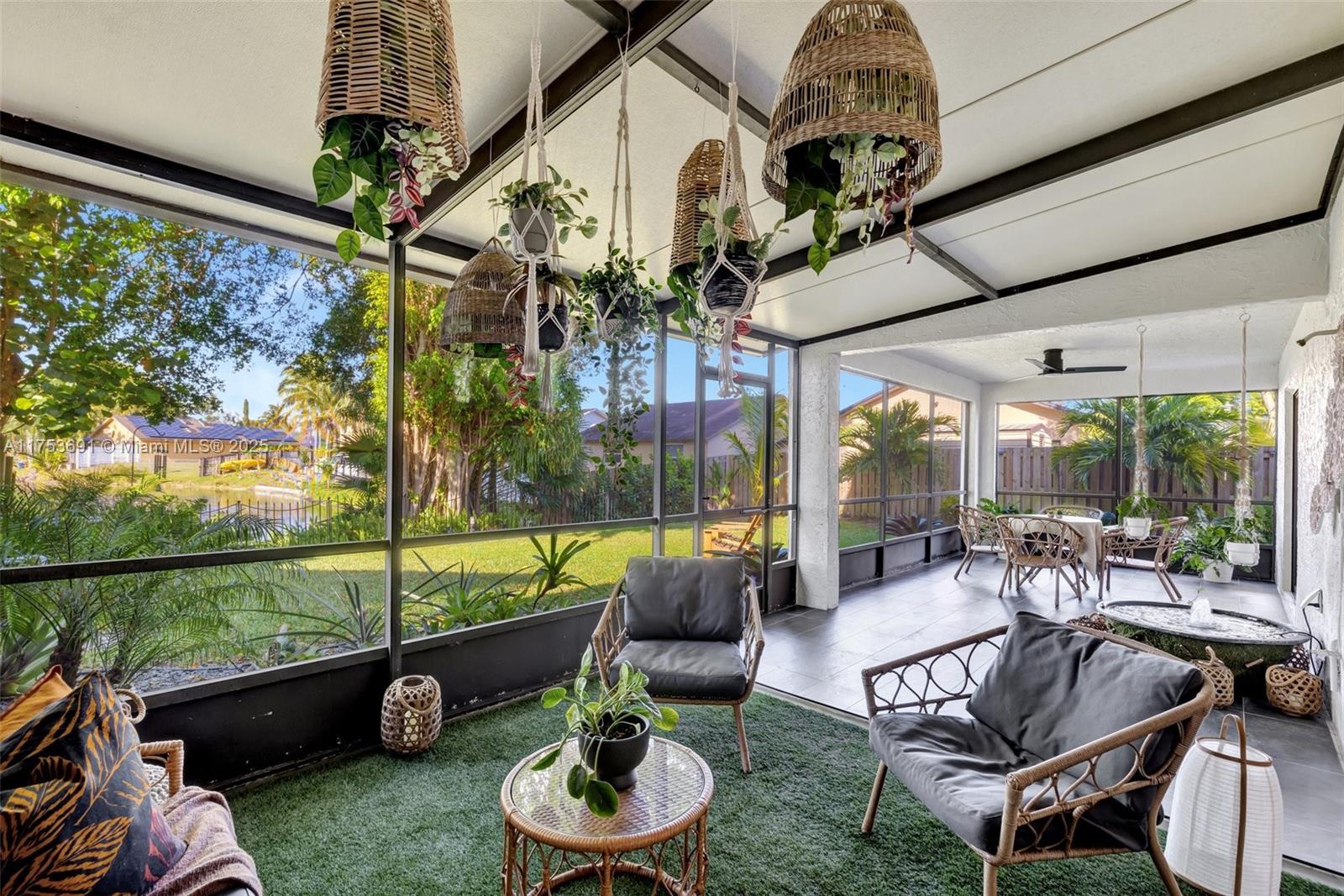 Stunningly updated peaceful lakefront home in Cooper City's Countryside West w/ gorgeous views throughout. Large screened patio overlooks crystal-clear lake & opens to private fenced backyard. Beautiful open concept kitchen w/ white shaker cabinets, waterfall counters, marble backsplash, newer appliances, oversized tile, 2021 ROOF & ext paint, partial impact windows/doors, upgraded irrigation, AC ducts, remodeled interior, spa-like baths, & updated H2o heater. 2023 W/D, HVAC, solar attic fan, upgraded insulation & epoxy garage. Turf & tiled patio, custom landscaping, upgraded stucco, LED lighting, smart thermostat, Ring & WiFi garage door. Expansive side yard w/ double gate to store boat/RV. Cul-d-sac street, close to Houses of Worship, Sports Complex, A-rated schools & shopping/dining.