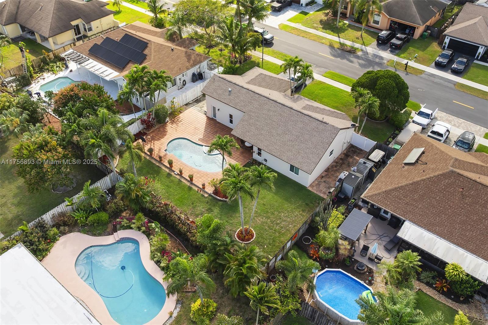 Walk into this beautifully-maintained 3 Bedroom, 2 Bathroom home to enjoy the high ceilings and wrap-around view of the tiled swimming pool patio in a tranquil west Davie neighborhood. Elegant wood and marble floors throughout the house. Master Bedroom includes a walk-in closet and cabana bathroom. Updated and cozy kitchen with great appliances; partially-updated bathrooms; all windows and doors are impact-proof except for the 2-car garage door. No HOA! Close to parks, shopping centers, Weston, Pembroke Pines, 1-75, 1-595.