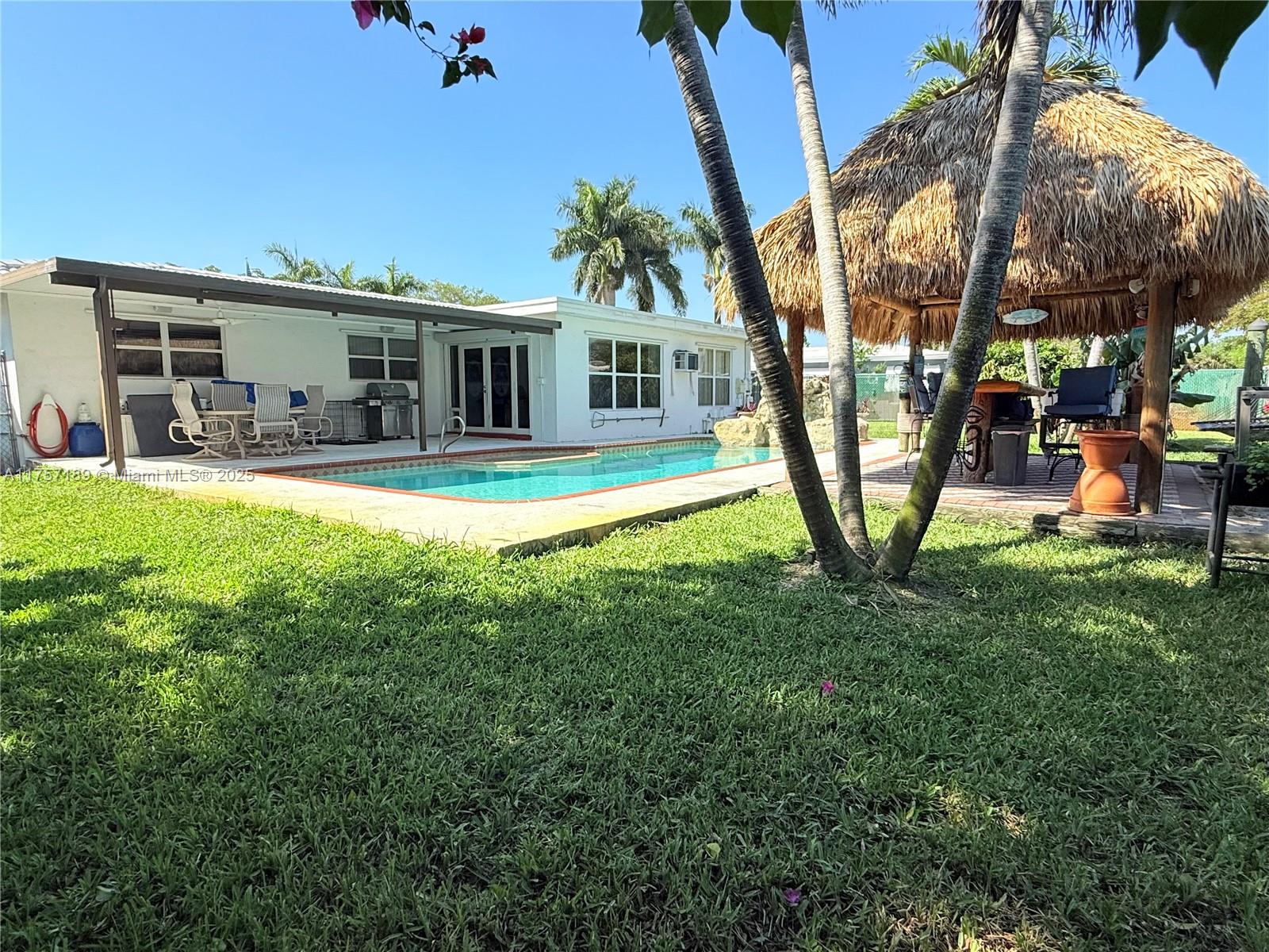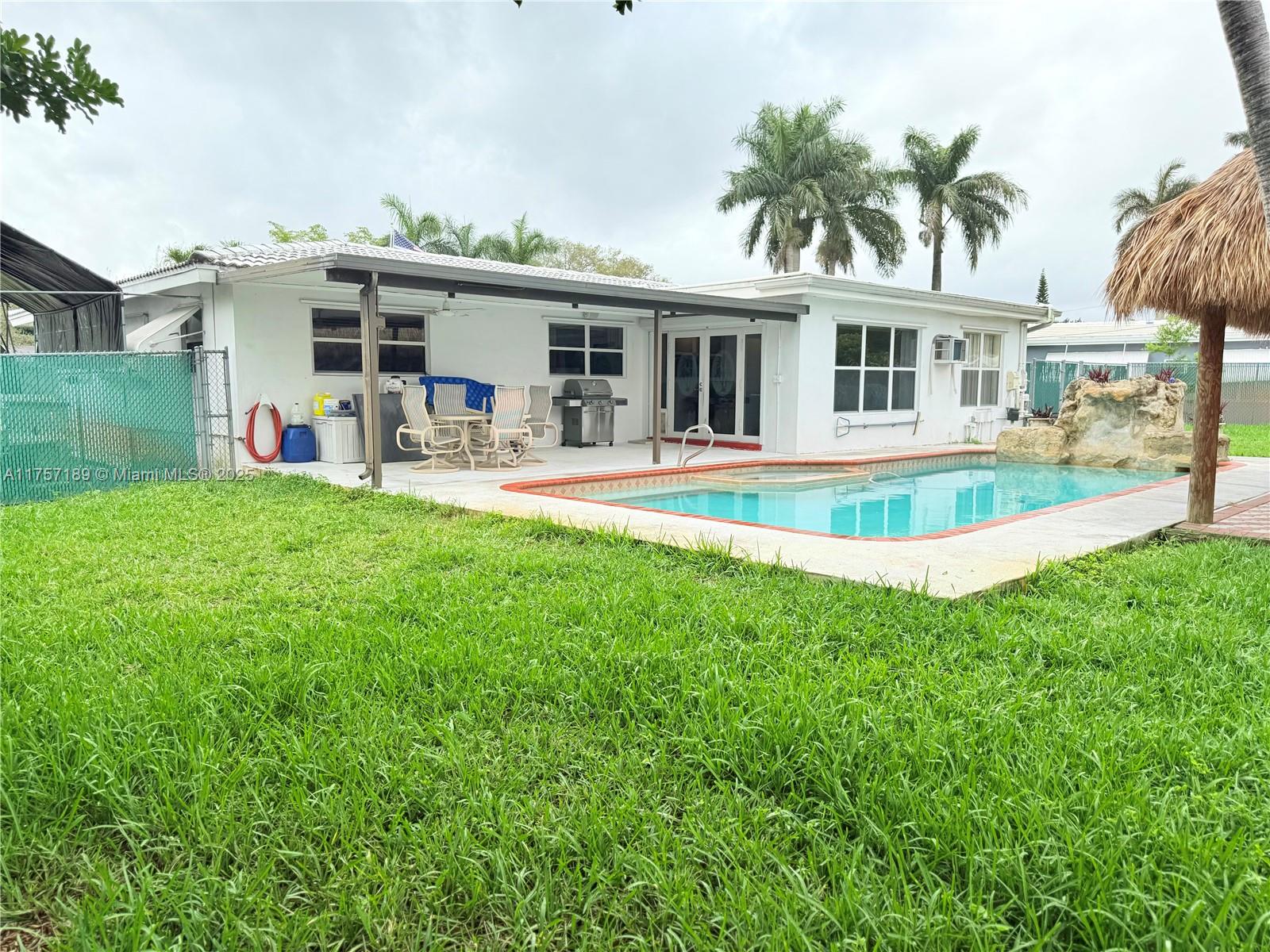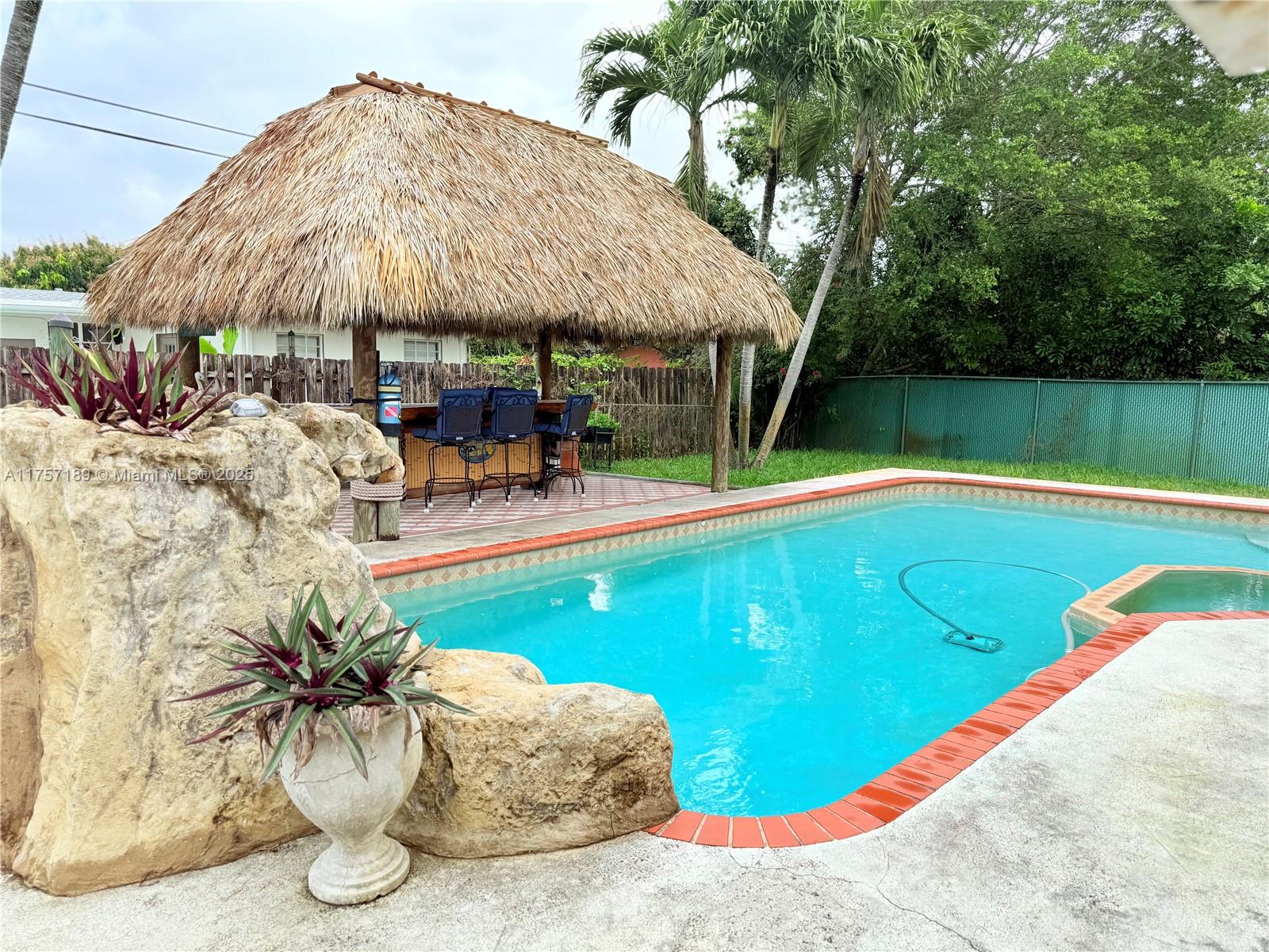 Must see 3 bed/2 bath home in sought after Plantation Gardens. Oversized 10,921 sq ft lot with room to park RV or boat on each side of the home. Enjoy a saltwater pool, with hot tub and waterfall. A tiki hut with bar including water and electricity. Large covered patio ideal for relaxing or entertaining. Features include tile floors, new A/C, new flat roofs, gas tankless water heater, gas dryer, and double oven. Upgraded electric panel with generator hookup. Smart home with Alexa controls, security cameras, screened porch, and 2-car garage. Located in a quiet neighborhood near parks, shopping, dining, Turnpike, and Ft Lauderdale Airport. Schedule your private tour today!. New roof will be installed!!!!!!!!!