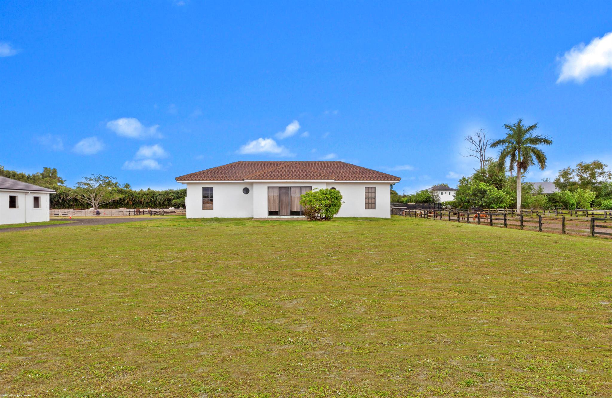 Reduced $7,500,000. One-of-a-kind opportunity to own a 46.96 acre equestrian facility in a prime Wellington location on a paved road and with no homeowner's association. The property boasts 4 stables, totaling175 stalls, full size polo field with exercise track, a second stick & ball practice field, maintenance garage and two staff houses. Two new show barns were built in 2024, one with 52 stalls & the other with 59, it also features a 2nd floor viewing room with balcony overlooking the polo fields. The original courtyard-barn holds 48 horses and the over flow barn has 16 stalls. The staff houses each have 4BR & 4Bths. The property is comprised of multiple parcels which could lend itself to future subdivision. This farm has unlimited potential for all equestrian disciplines. A must see!