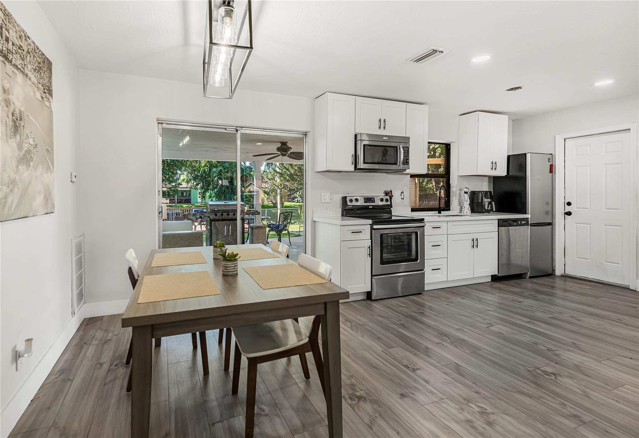 TURN KEY HOME ready for you! Charming and fully remodeled 2 bedroom, one bath home with open living concept and modern upgrades throughout. This beautifully updated home features newer roof, impact windows, fresh paint, new baseboards, stylish new floor, sleek recessed lighting. The kitchen boasts brand new cabinets and fridge while the renovated bathroom offers a contemporary feel. Enjoy waterfront living with direct cancel access and a brand new dock - perfect for boating fishing or relaxing by the water. Move in ready and waiting for you.