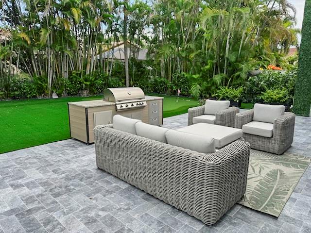 Stunningly updated home in the sought-after, gated community of The Palms at Boca Pointe,offers luxury, comfort, and modern elegance! Step inside to find brand-new wood-toned tile flooring, crown molding in the main living areas and primary suite,completely redesigned kitchen with custom cabinetry, new appliances, gorgeous countertops, and an oversized peninsula with seating for four! The primary suite boasts custom bathroom cabinetry, and oversized shower. New landscaping in the front and backyard,hurricane impact windows and doors throughout plus a brand new flat roof,all-new turf, travertine pavers,a custom putting green with three holes! Located in a low-HOA community with optional country club membership,this home is perfect for those seeking a luxury lifestyle without the commitment.