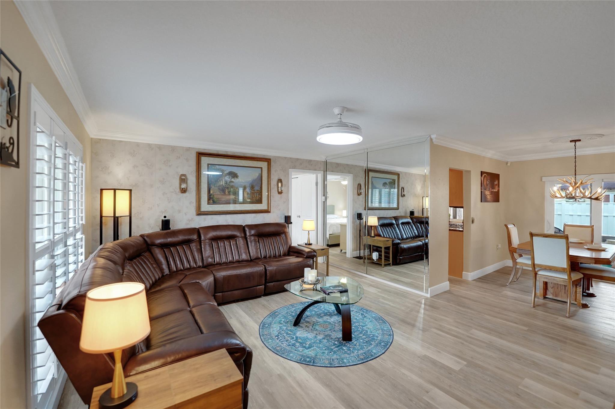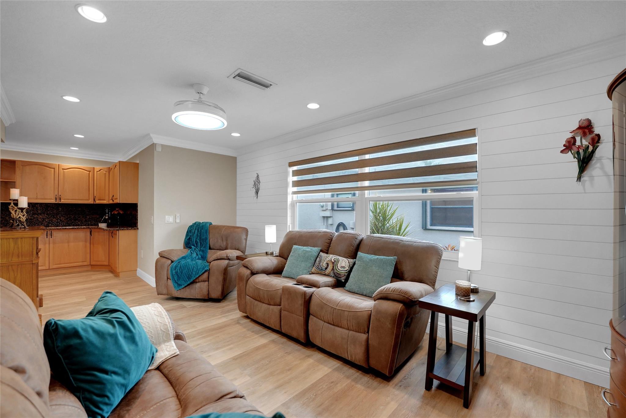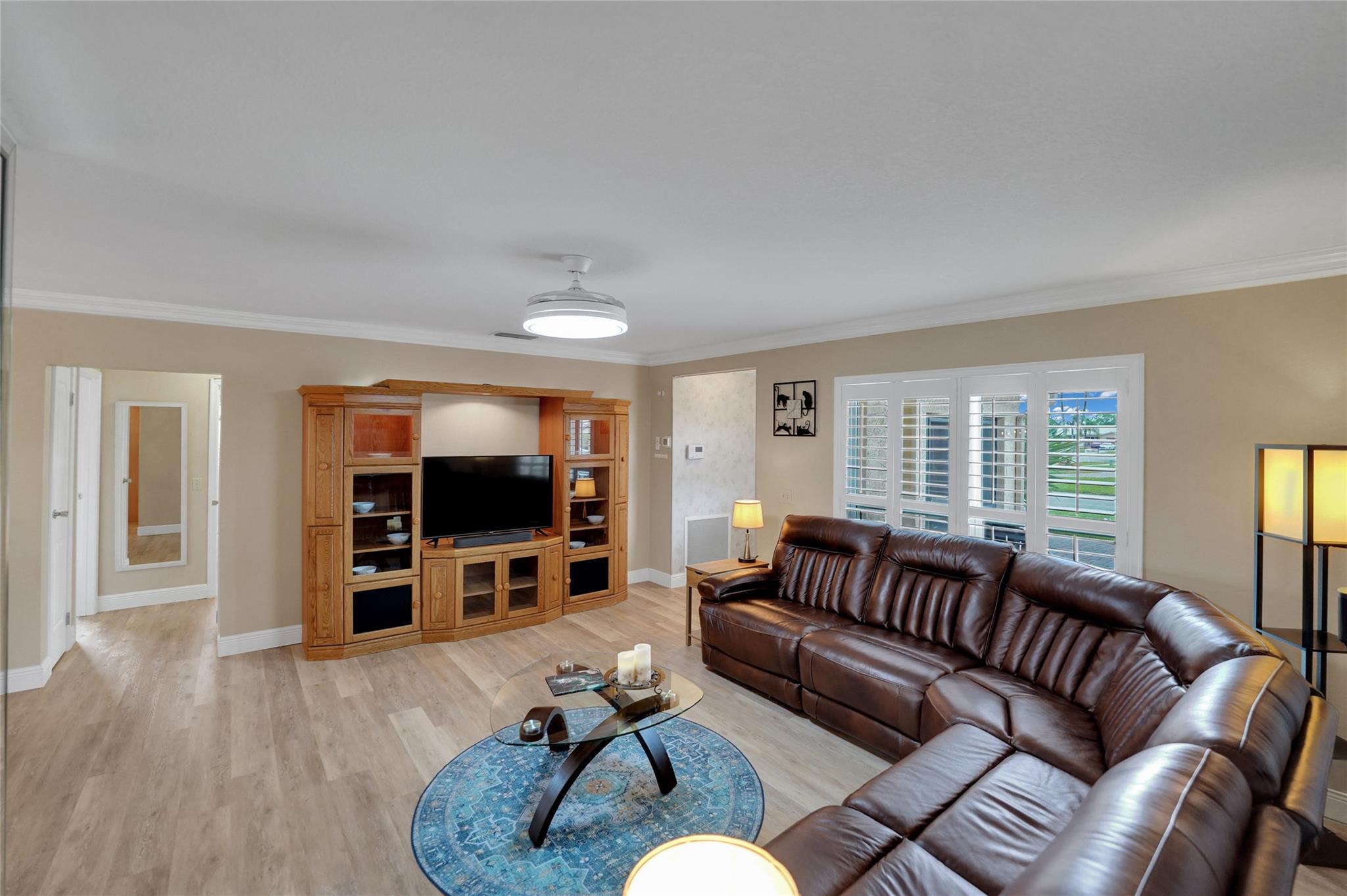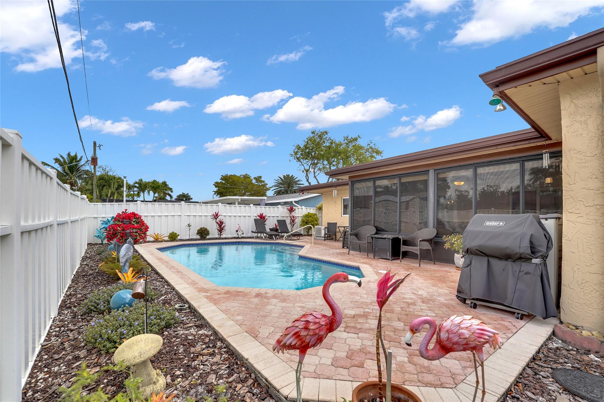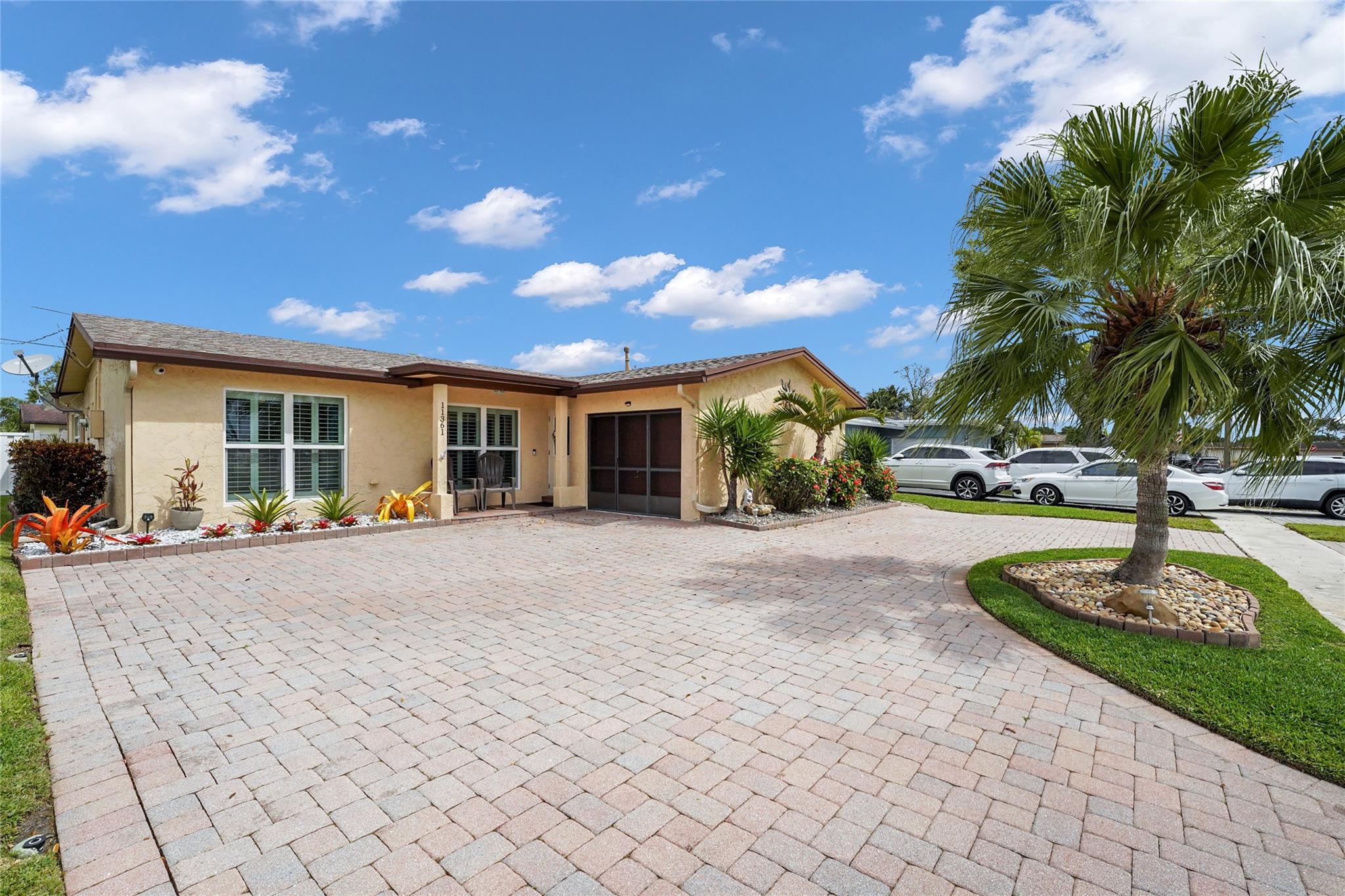 Nestled in the vibrant city of Sunrise, just outside Fort Lauderdale, this beautifully updated **pool home** is ready for new owners to create lasting memories. A freshly painted exterior, pavered circular driveway, and lush landscaping set the stage for the charm that awaits inside. Step through the front door to find vinyl plank flooring and crown molding flowing throughout, adding warmth and character to every space. The front living room effortlessly transitions into the dining area, conveniently located near the renovated kitchen, which boasts granite countertops and backsplash, black stainless steel appliances, and recessed lighting. The rear family room is bathed in natural light, with a stylish shiplap accent wall adding a touch of modern flair.