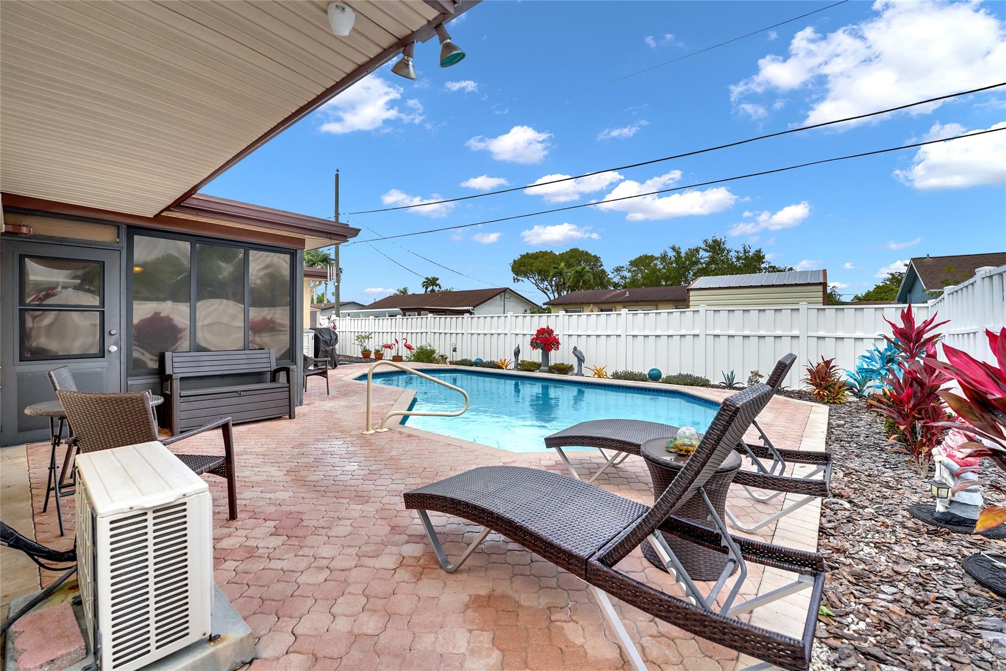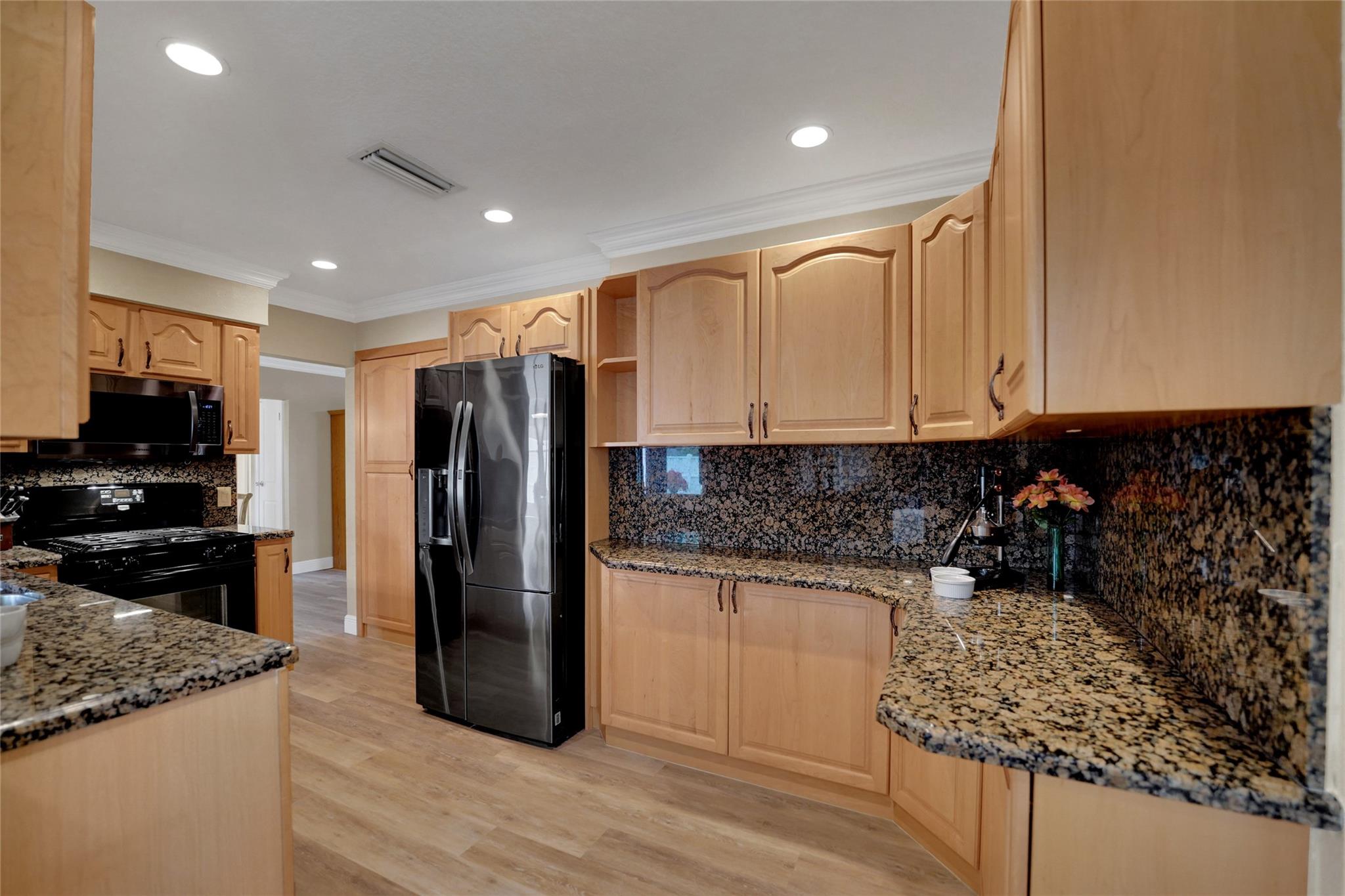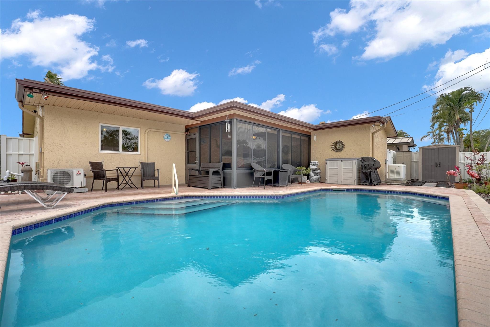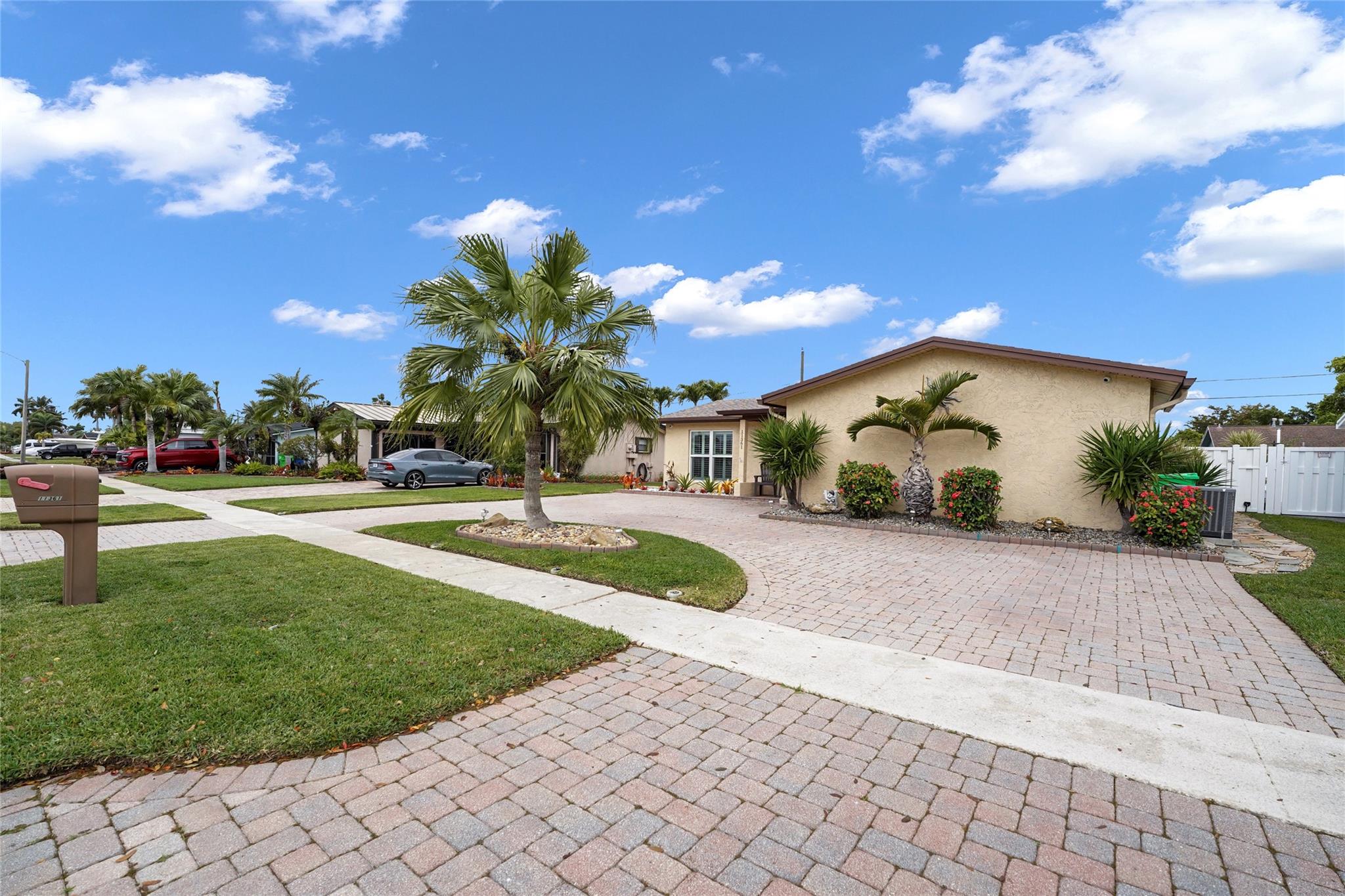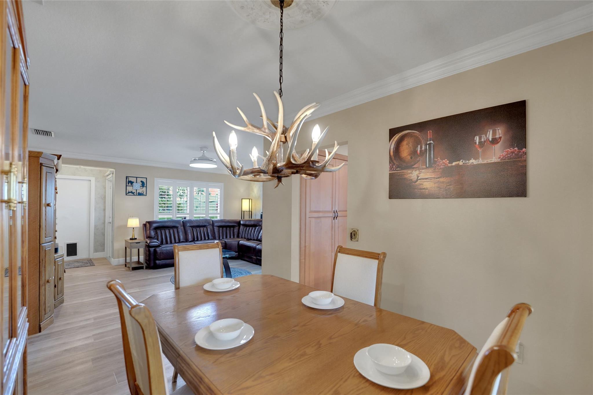 Nestled in the vibrant city of Sunrise, just outside Fort Lauderdale, this beautifully updated **pool home** is ready for new owners to create lasting memories. A freshly painted exterior, pavered circular driveway, and lush landscaping set the stage for the charm that awaits inside. Step through the front door to find vinyl plank flooring and crown molding flowing throughout, adding warmth and character to every space. The front living room effortlessly transitions into the dining area, conveniently located near the renovated kitchen, which boasts granite countertops and backsplash, black stainless steel appliances, and recessed lighting. The rear family room is bathed in natural light, with a stylish shiplap accent wall adding a touch of modern flair.