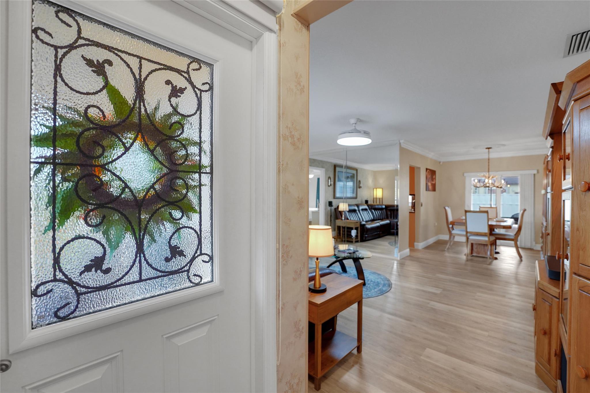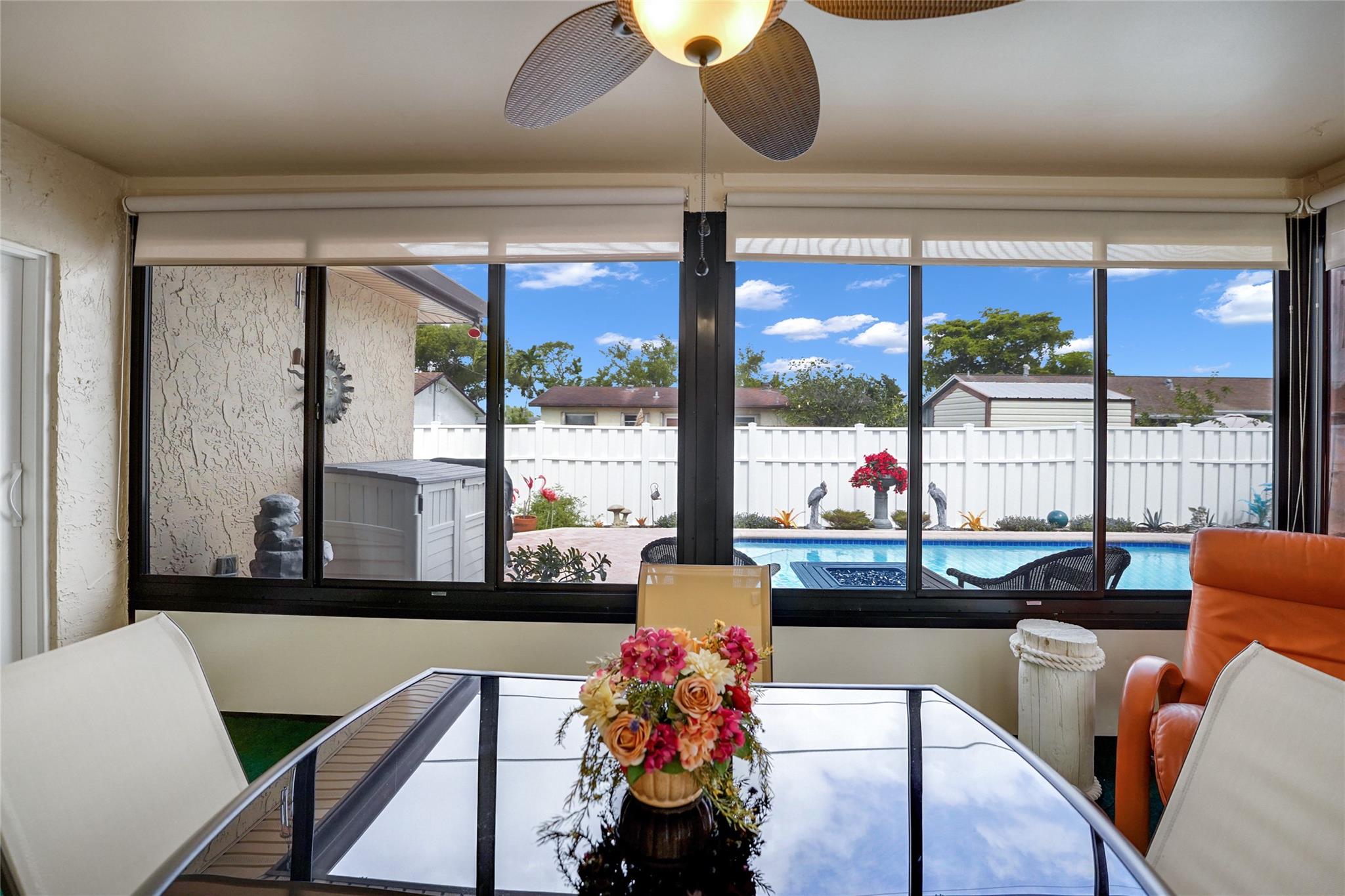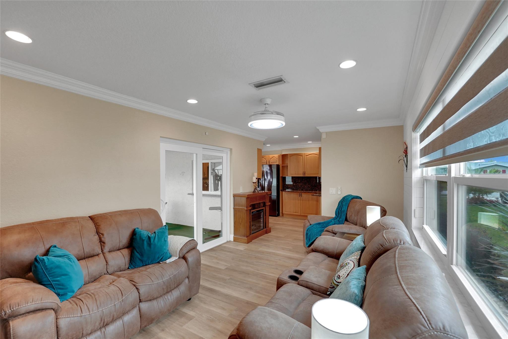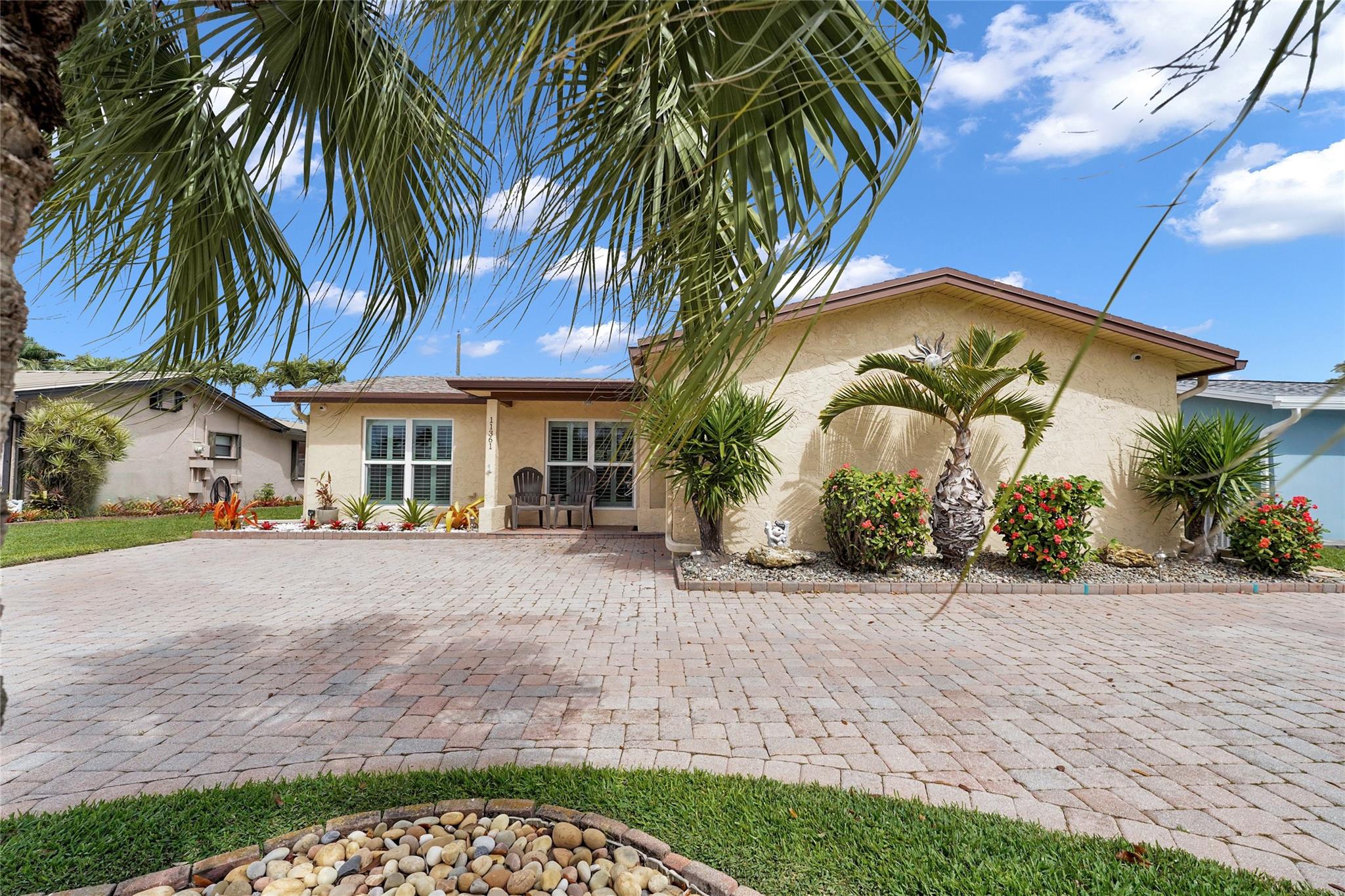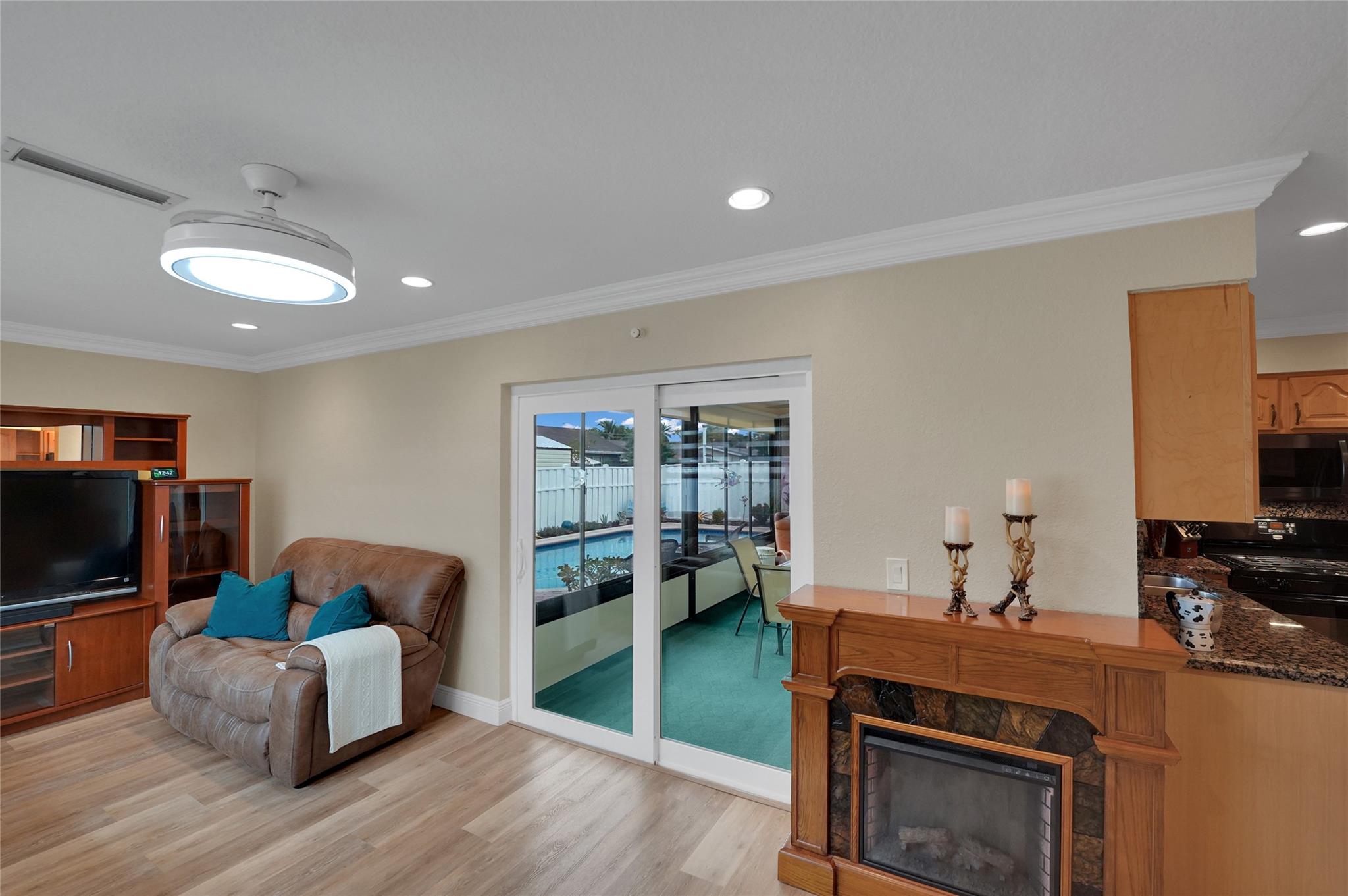 Nestled in the vibrant city of Sunrise, just outside Fort Lauderdale, this beautifully updated **pool home** is ready for new owners to create lasting memories. A freshly painted exterior, pavered circular driveway, and lush landscaping set the stage for the charm that awaits inside. Step through the front door to find vinyl plank flooring and crown molding flowing throughout, adding warmth and character to every space. The front living room effortlessly transitions into the dining area, conveniently located near the renovated kitchen, which boasts granite countertops and backsplash, black stainless steel appliances, and recessed lighting. The rear family room is bathed in natural light, with a stylish shiplap accent wall adding a touch of modern flair.