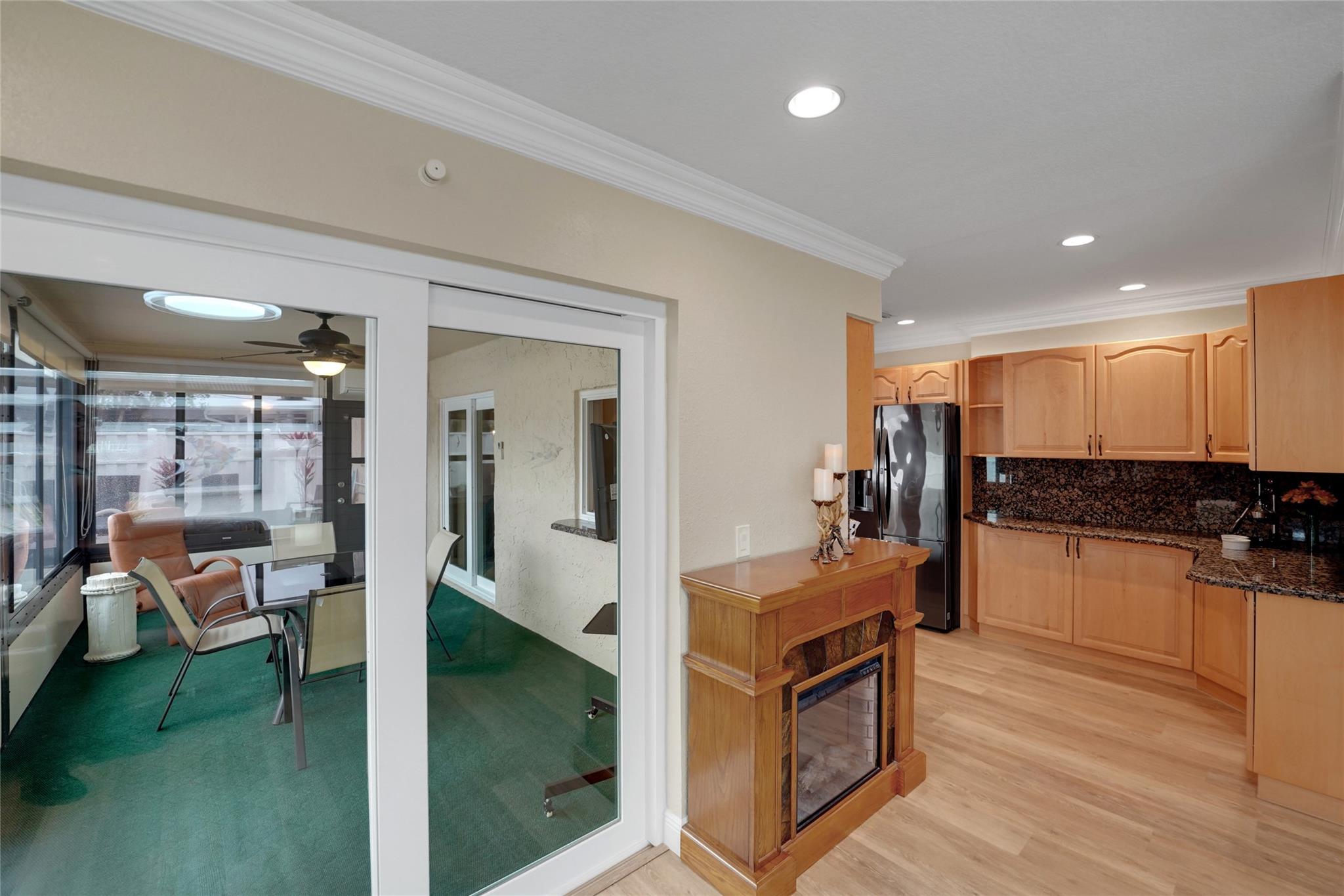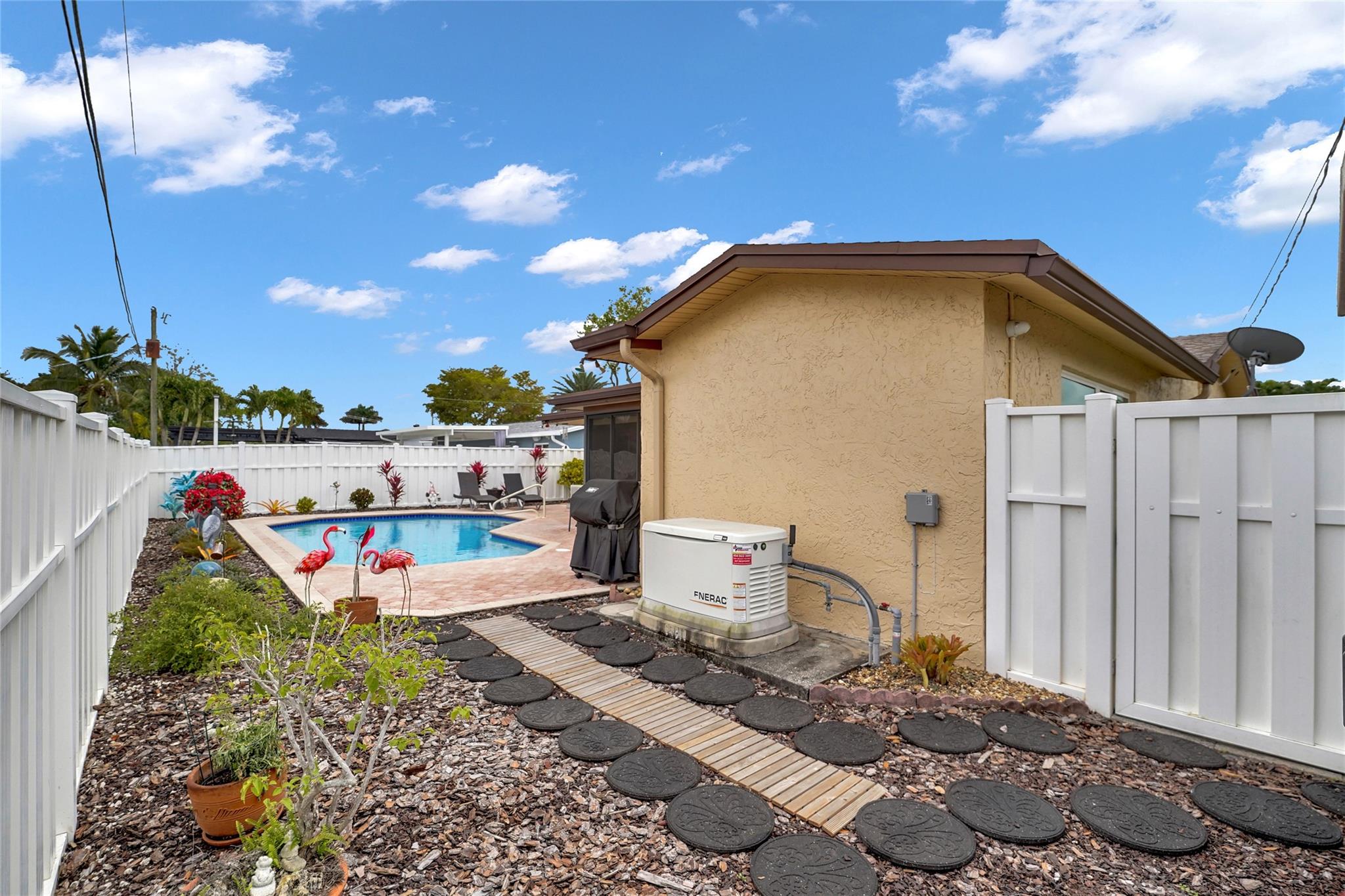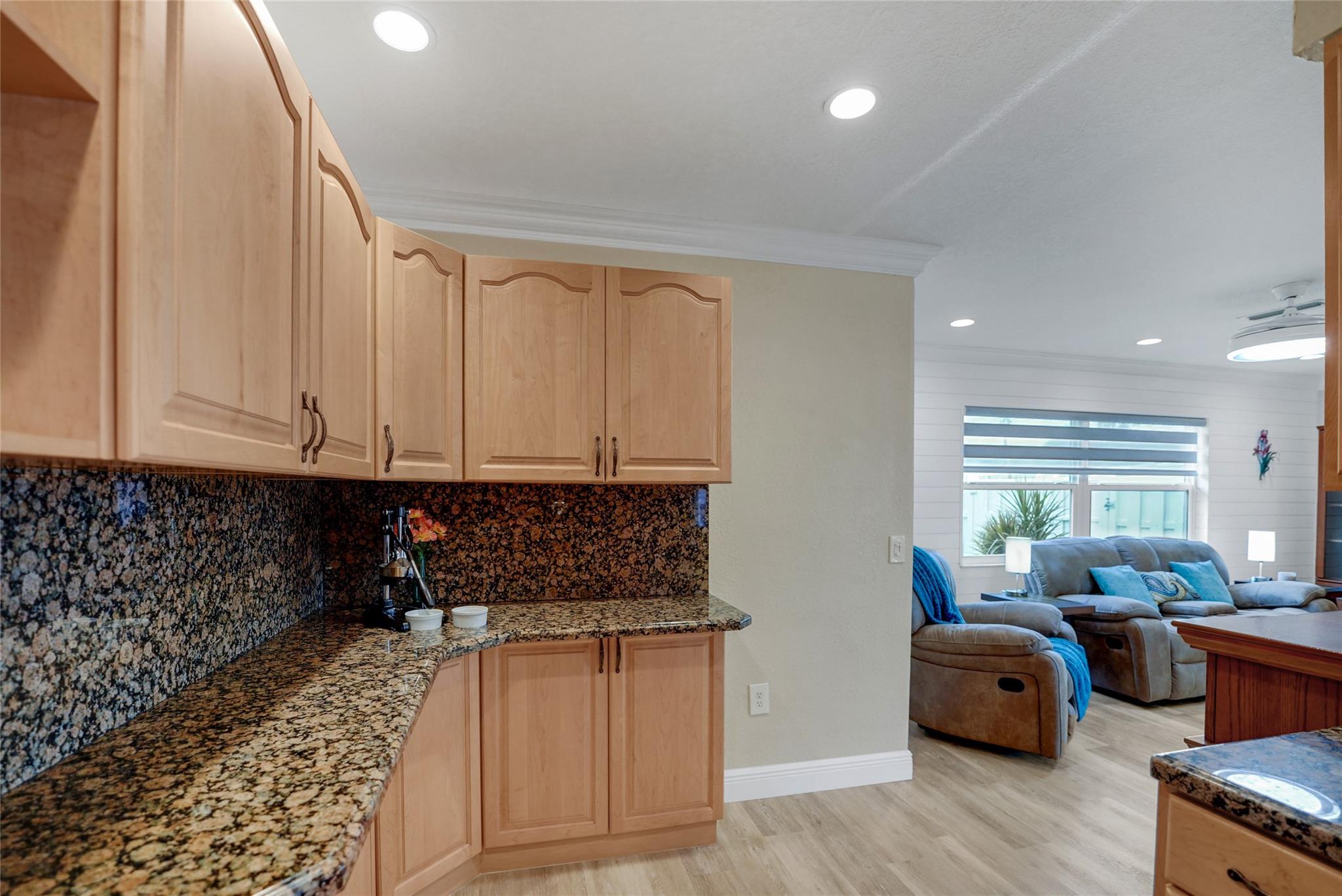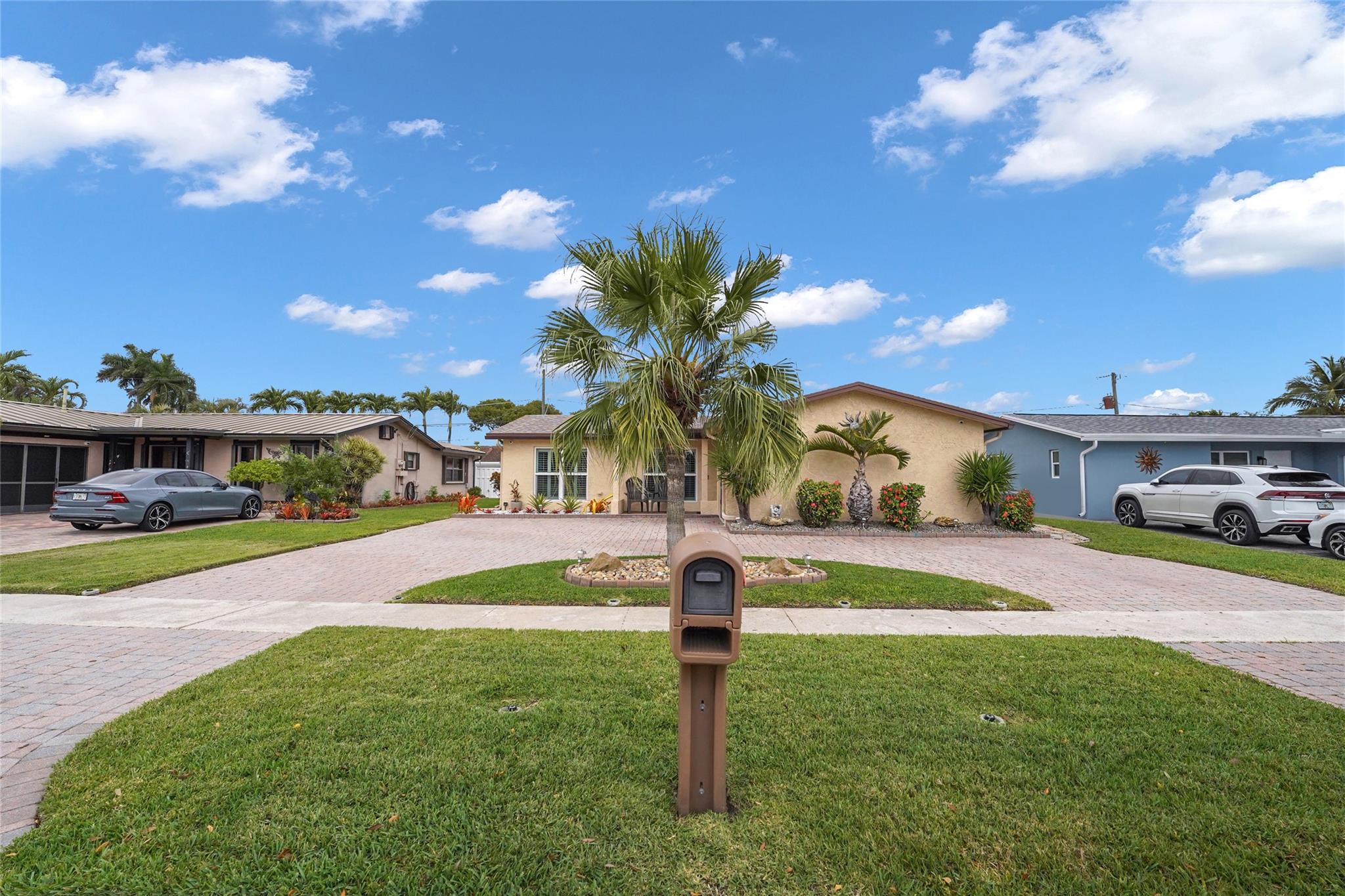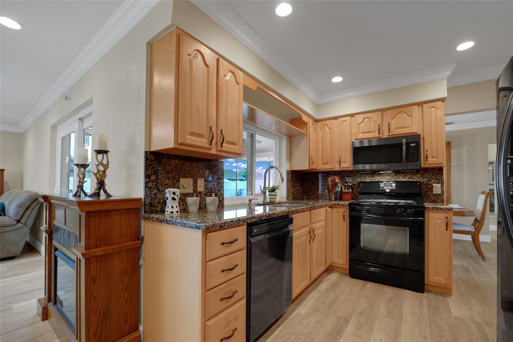 Nestled in the vibrant city of Sunrise, just outside Fort Lauderdale, this beautifully updated **pool home** is ready for new owners to create lasting memories. A freshly painted exterior, pavered circular driveway, and lush landscaping set the stage for the charm that awaits inside. Step through the front door to find vinyl plank flooring and crown molding flowing throughout, adding warmth and character to every space. The front living room effortlessly transitions into the dining area, conveniently located near the renovated kitchen, which boasts granite countertops and backsplash, black stainless steel appliances, and recessed lighting. The rear family room is bathed in natural light, with a stylish shiplap accent wall adding a touch of modern flair.
