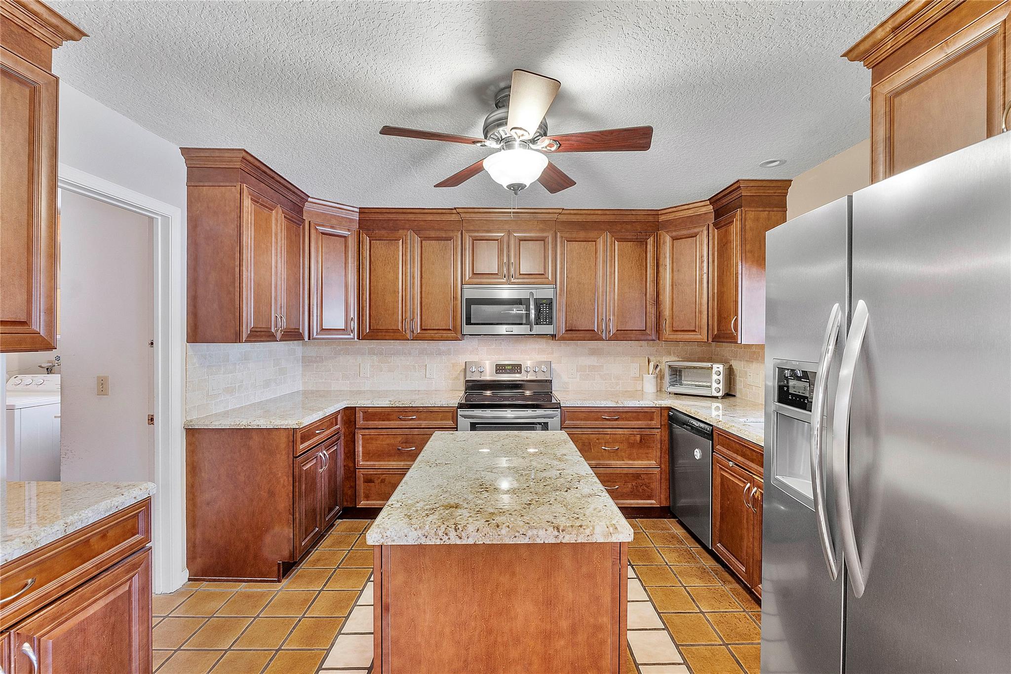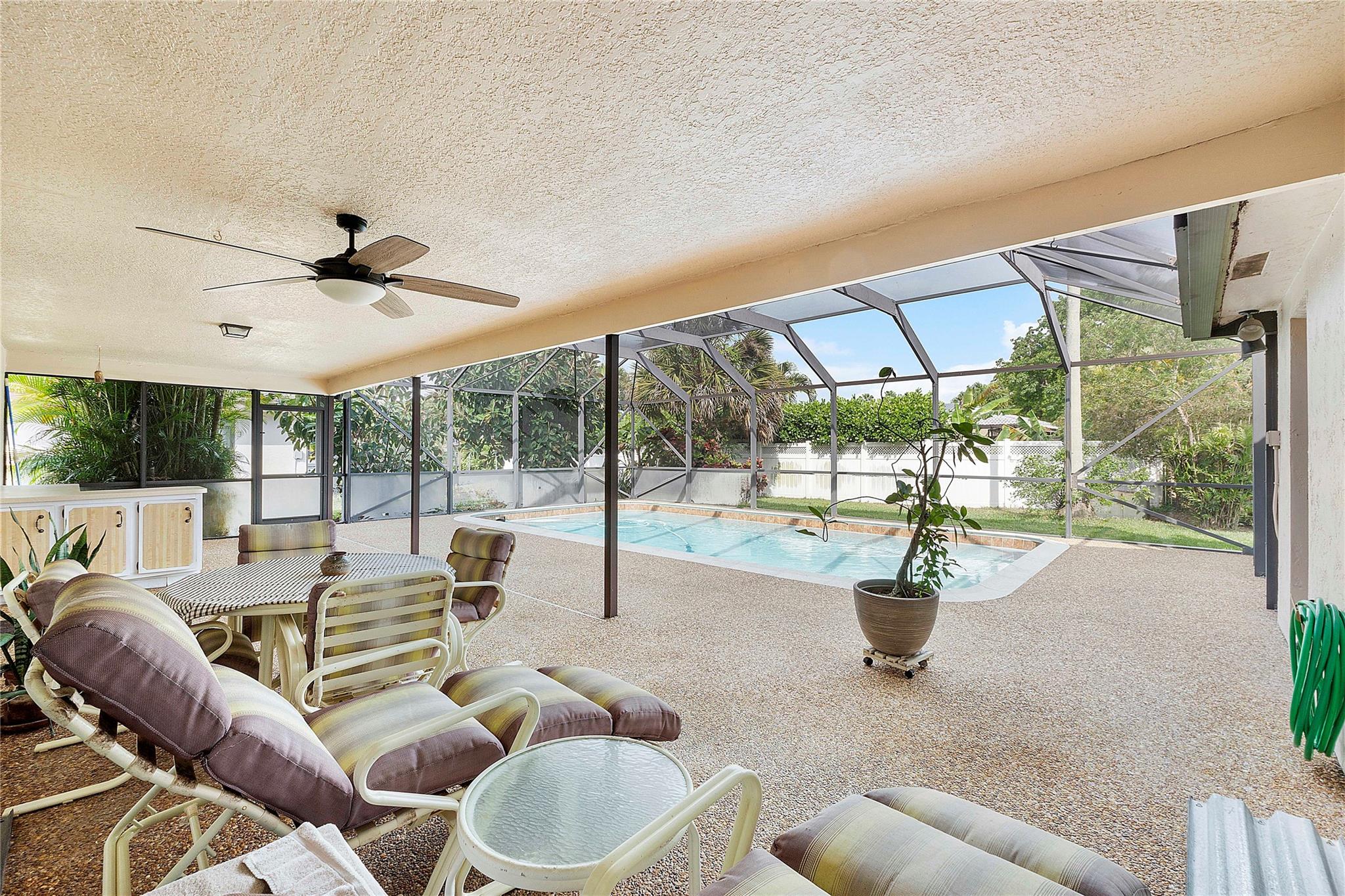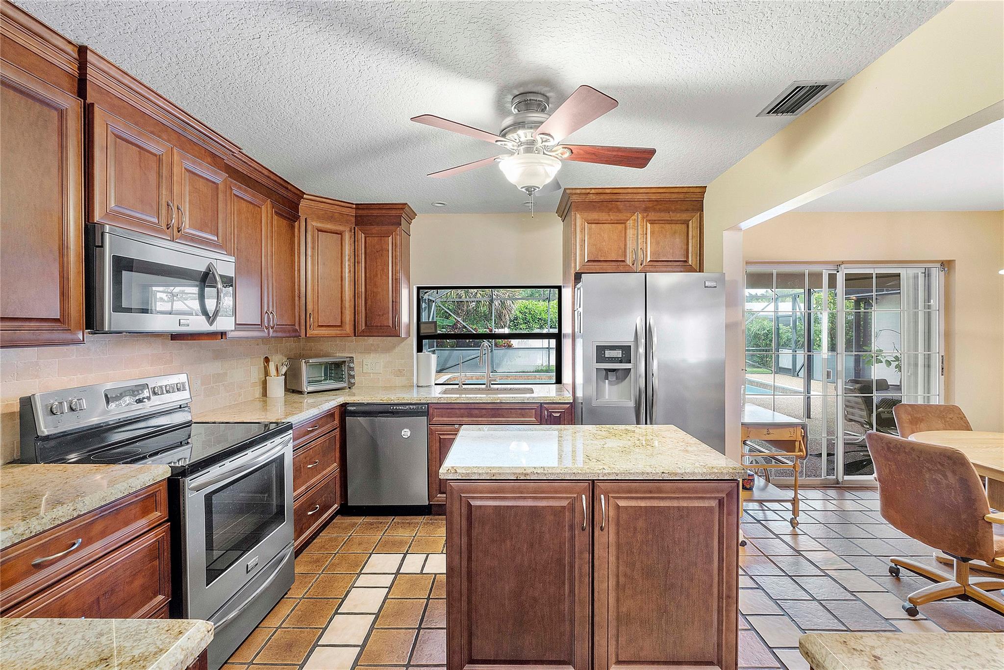 Situated in sought-after area of Maplewood, this well-maintained home welcomes you. Fantastic curb appeal. Lush landscaping provides the perfect aesthetic with pineapple, banana, mango and avocado trees. A totally renovated kitchen/silgranit sink and breakfast area open to the family room with fireplace all overlooking the screened pool. Large Bedrooms. Hurricane protection with impact windows, 2 in the front and 1 on the east side, as well as 1 accordion and panels. The residence also boasts a 2018 AC, a 2020 WH, new electric panels 2019, 2025 garage door opener, knockdown ceilings & no carpet! The pool pump is equipped with variable speeds for low electric bills. Circular drive and automatic sprinklers. This property is situated close to top schools, parks, shopping, and major highways.