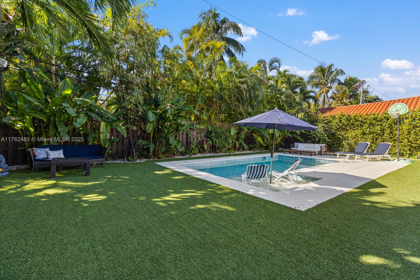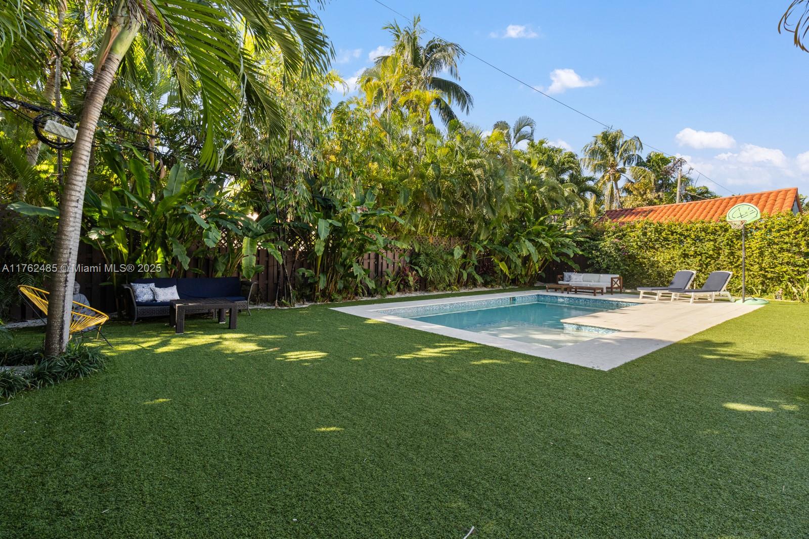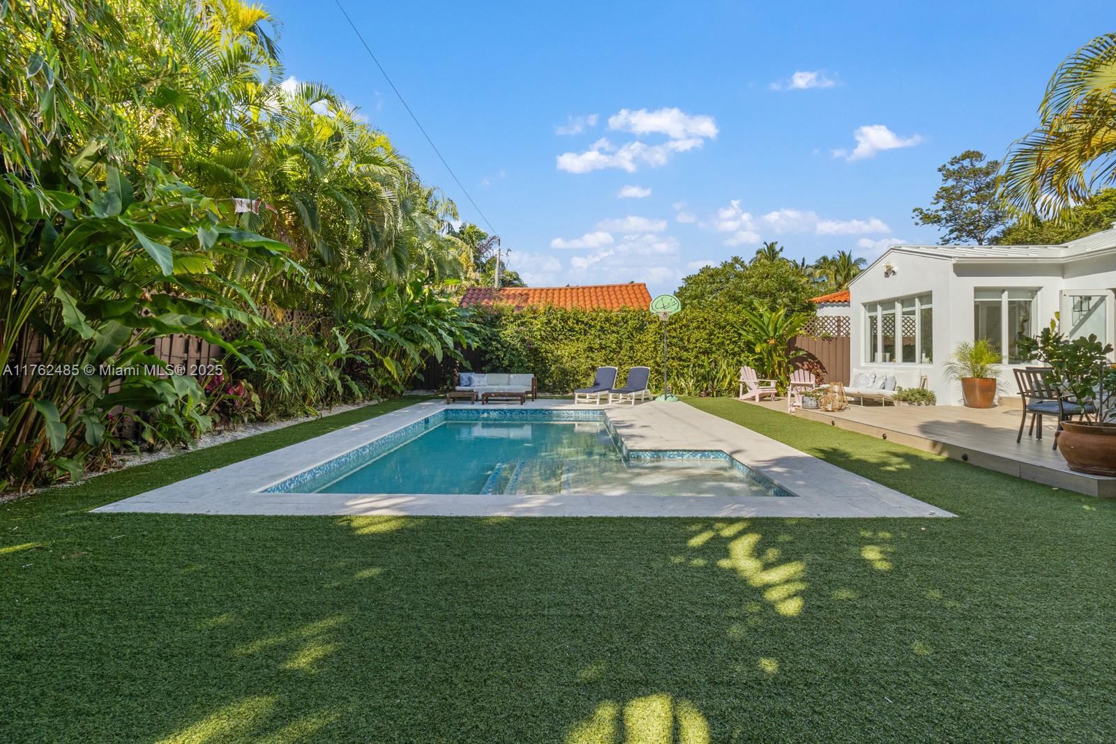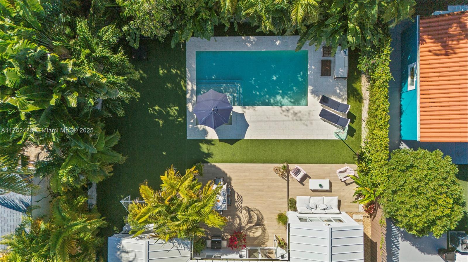 A private Retreat with a Dream Backyard! Nestled in Belle Meade, a desirable gated community, this 2BD/2BA home features an en-suite primary bedroom, a den overlooking the pool and a converted garage currently used as a 3rd bedroom, ideal for office, gym, or studio. Offers approx. 1,681 sq ft of interior space. Step outside to a magical tropical backyard with a heated pool, elegant terrace and lush landscaping, perfect for relaxing or entertaining. This home, topped with a durable metal roof, impact windows, is just minutes from the Design District, Wynwood and Miami Beach, the perfect balance of peaceful privacy and vibrant city living. LOCATION, LOCATION, LOCATION !!! 3rd room may not be reflected in public records as a bedroom. Buyer to verify use. Make this DREAM HOME yours!