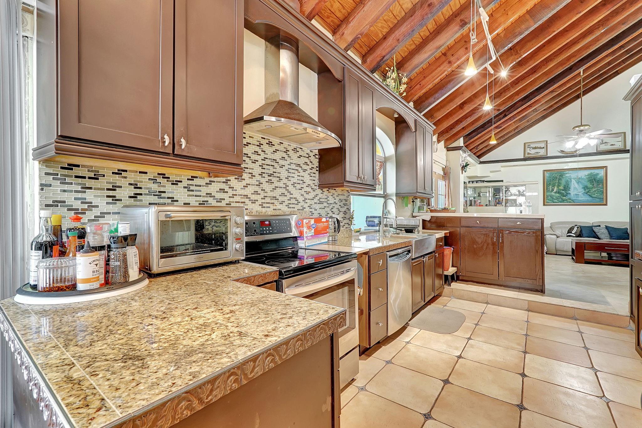 This well maintained 3/4 bedroom, 2-bathroom pool home sits on nearly a 10,000 square foot lot, making it ideal for a growing family or for entertaining. The stunning vaulted wood beam ceilings create a spacious, open atmosphere. A versatile loft area offers the perfect space for a home office or could be converted into a 4th bedroom. The kitchen boasts newer cabinets and stainless steel appliances, while the remodeled bathrooms add to the home's move-in readiness. Additionally, a brand-new 5-ton AC (2024) ensures year-round comfort. The attached 2-car garage has been converted into extra living/storage space. Located on a quiet, dead-end street with no HOA, Lease right away or Airbnb Okay. This home provides peace and privacy.