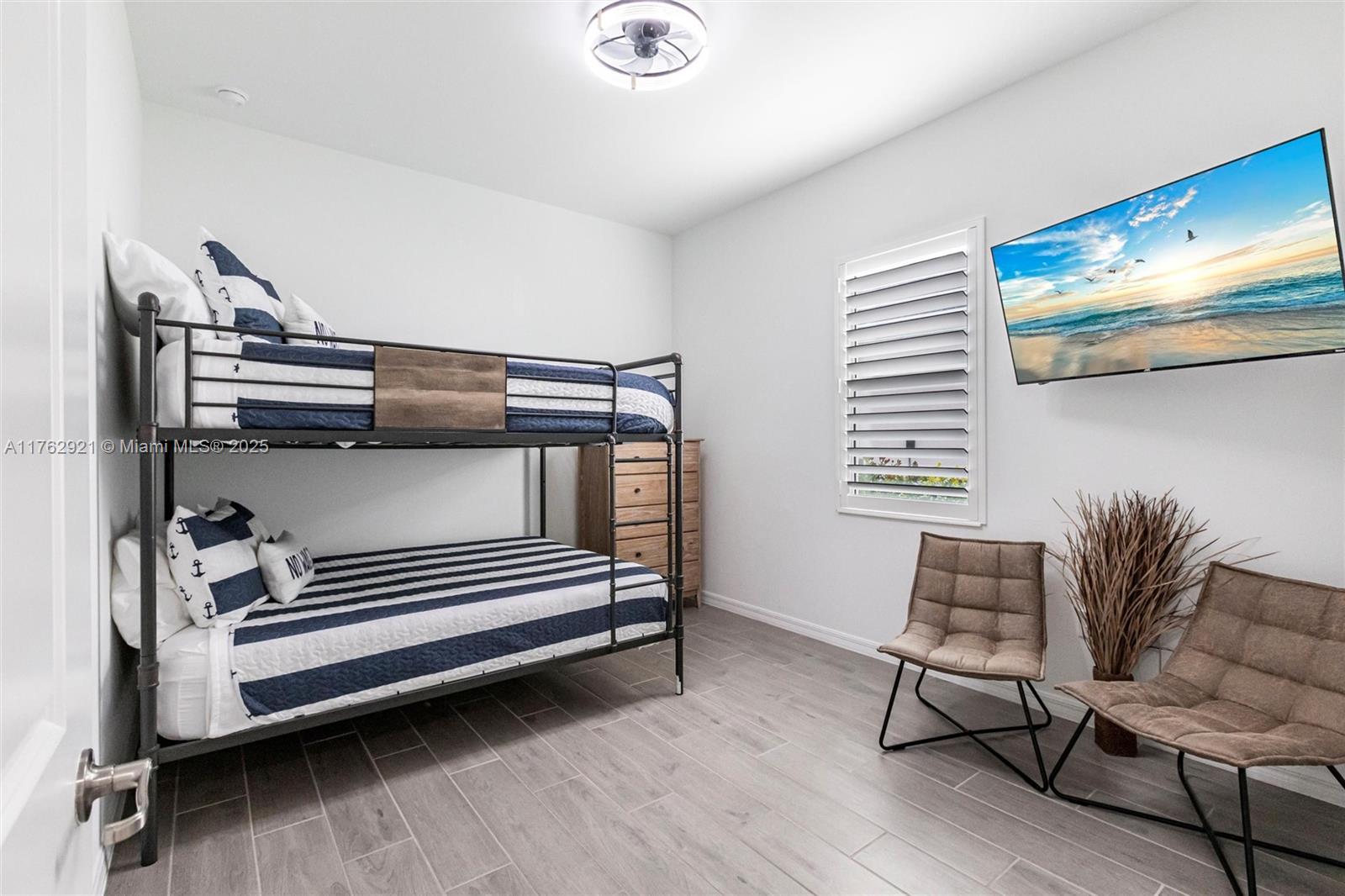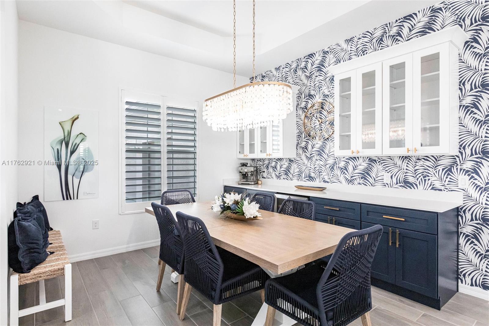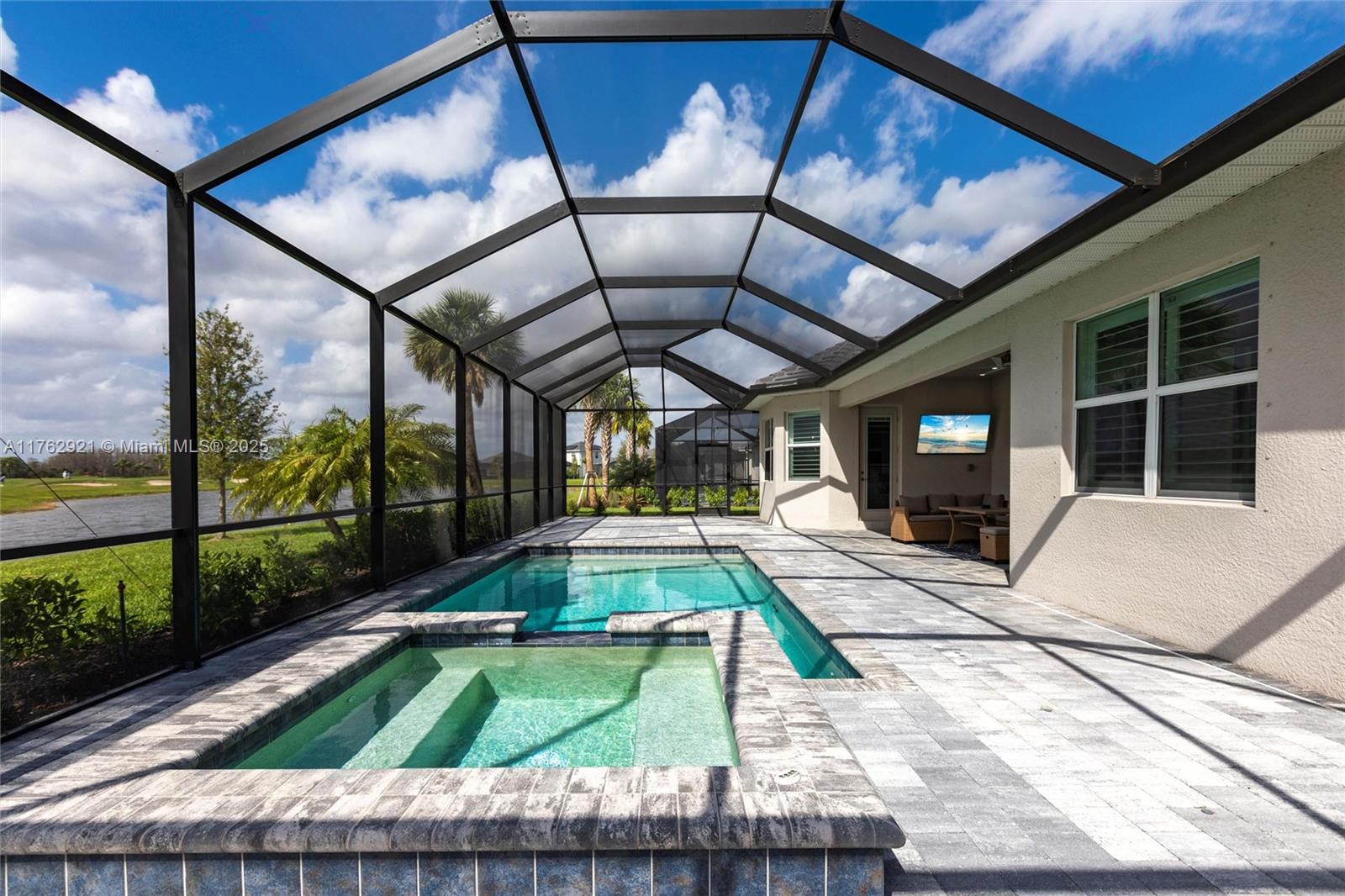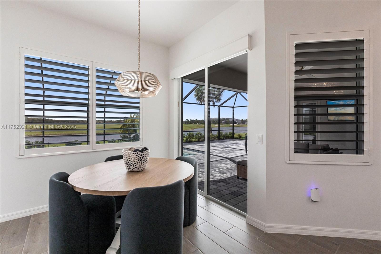 This 4 bedroom, 2 and half bath, 3 car garage home is LOADED with UPGRADES & beautiful WOODWORK! From the extra BUILT-INS cabinetry to the WINE, COFFEE BAR area to SHIPLAP work on the fireplace & ceilings to the PLANTATION SHUTTERS & wood look PLANK TILE throughout this entire home! Wait till you see the primary oversized bedroom a beautiful accent wall, hanging pendants lights, door to the lanai, built-in blinds & to top it off, the shiplap ceiling & beautiful ceiling fan. Entertain in your HUGE screened in lanai w/ pool & spa plus a pool bath. The National is a state-of-the-art clubhouse w/ luxury amenities for residents to enjoy like resort-style pool & spa, 24/7 manned gate for peace of mind, state-of-the-art fitness center, pickleball, tennis. Social Membership is included.