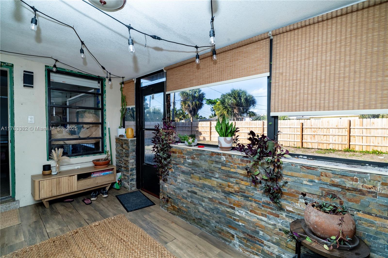 This super-clean home is packed with fantastic features! A versatile room can be used as an office, hobby room, exercise room,. The master bedroom includes a cedar walk-in closet, while the second bedroom boasts an oversized closet. The newly updated master bath, new light fixtures, and blackout blinds add a fresh, modern touch. Step outside to a large, fully fenced backyard with plenty of room for a pool. A storage shed and an automatic pump and sprinkler system make maintenance easy. Beautiful terrazzo floors flow throughout the home, and the screened patio is perfect for relaxing. Both the kitchen and bathrooms have been upgraded, and hurricane panels are included for all windows and doors. easy access to beaches and highways.