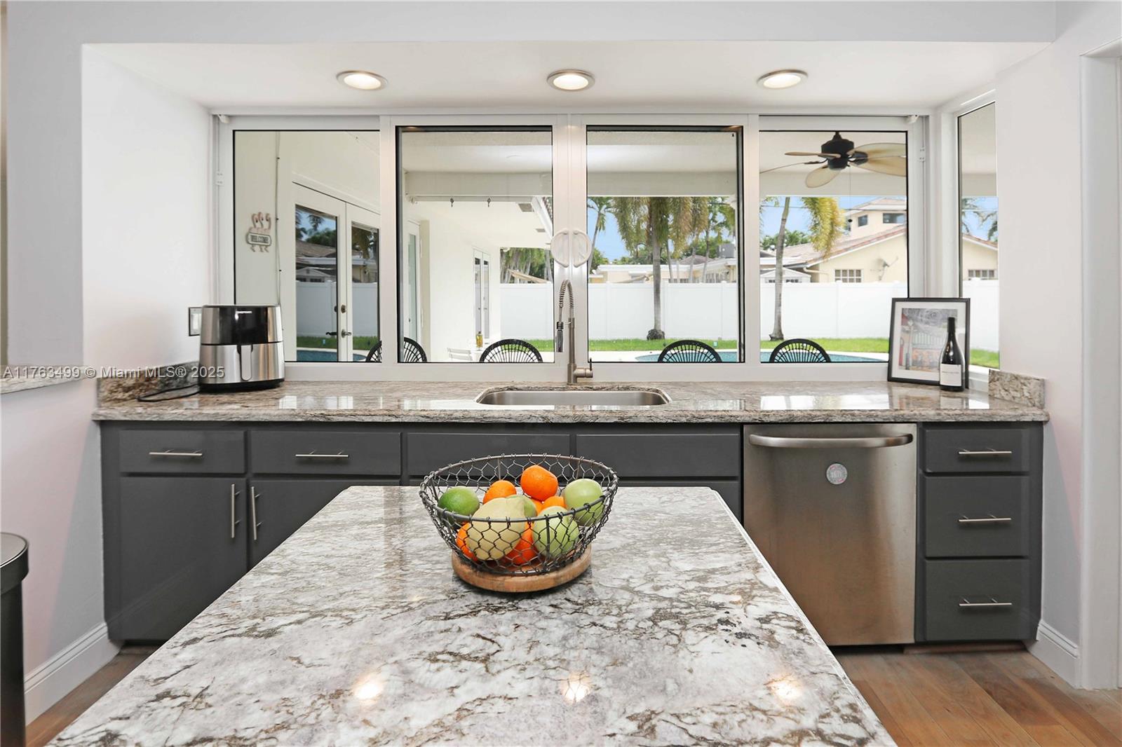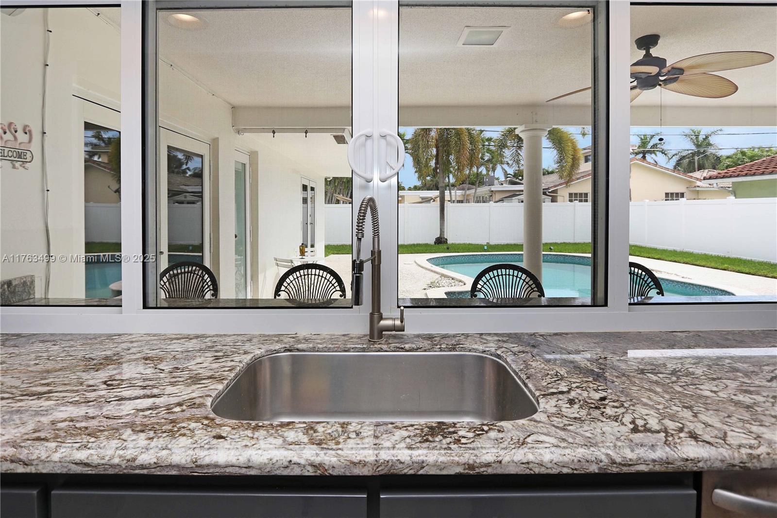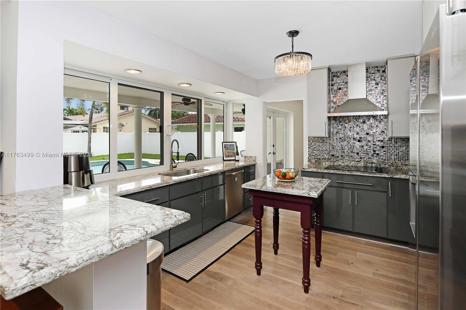 Amazing opportunity! Stunning home features spacious 4 bedrooms and 3 baths 2 car garage pool home in the Hollywood Lakes area. Enjoy formal dining, living, and family rooms. The inviting foyer leads to spacious bedrooms. The primary bath includes a walk-in shower with stone walls, a skylight, rain showerhead, double sinks, marble counters, and porcelain tile. The cabana bath also offers double sinks and granite countertops. Outdoor highlights include a covered patio, a beautiful pool—perfect for entertaining—and a PVC-fenced yard. Engineered wood flooring throughout, impact windows and doors. A/C approx 3 years old. Conveniently located near Diplomat Parkway, east of US-1.