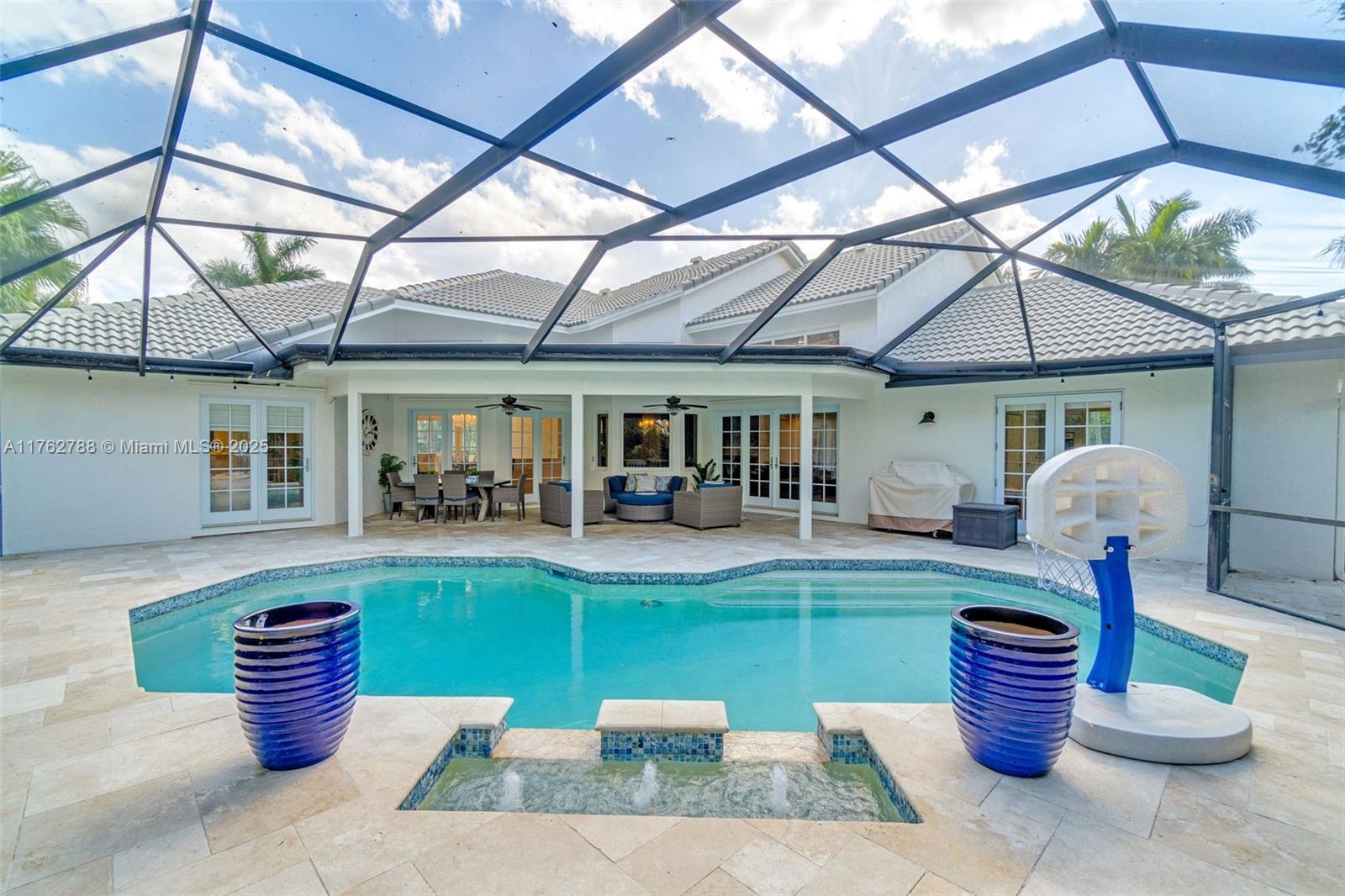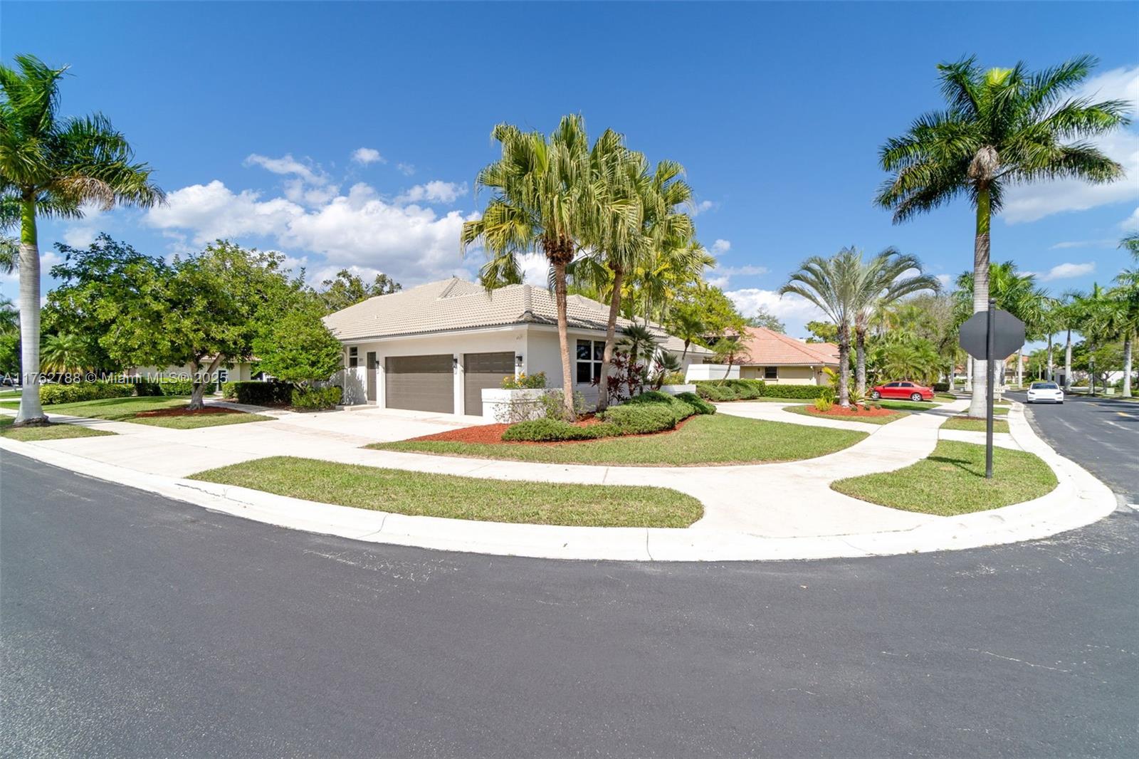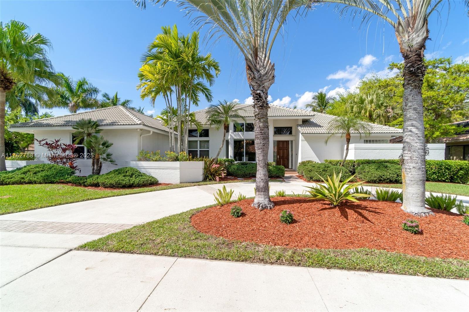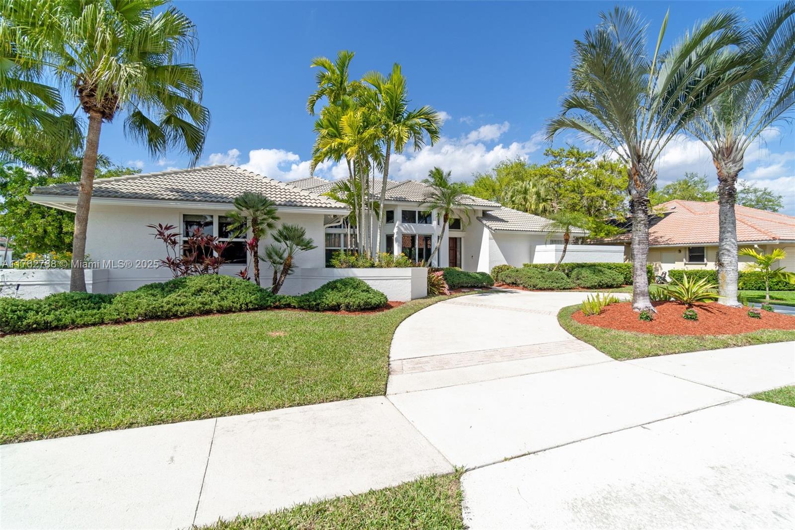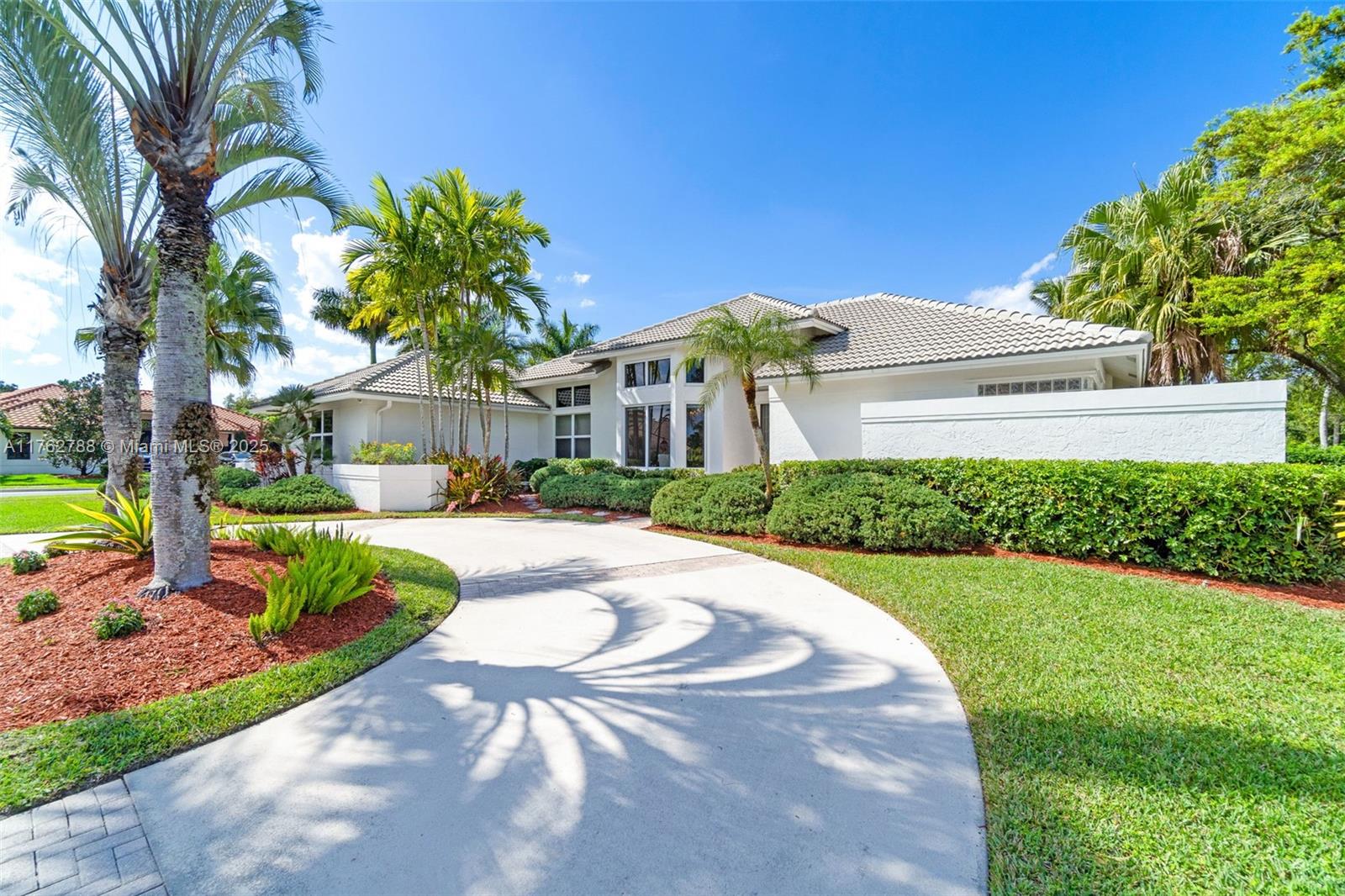 Nestled in the highly sought-after Palm Island community in Weston, this stunning corner-lot home offers A-rated schools and luxury living! Enjoy breathtaking pool view throughout, soaring ceilings, crown moldings, and abundant natural light. Gourmet kitchen features exquisite Taj Mahal countertops and a wine fridge, while custom closets provide ample storage. French doors open to a serene backyard with a saltwater pool, covered patio, and lush privacy hedges. The huge 5th bedroom can serve as a playroom or an extra master suite. Updated primary bathroom, with engineered hardwood floors in primary bedroom, Murphy bed in one of the bedrooms making it spacious. A circular driveway plus an additional side driveway offer plenty of parking. Steps from the community park—this home is a must-see!